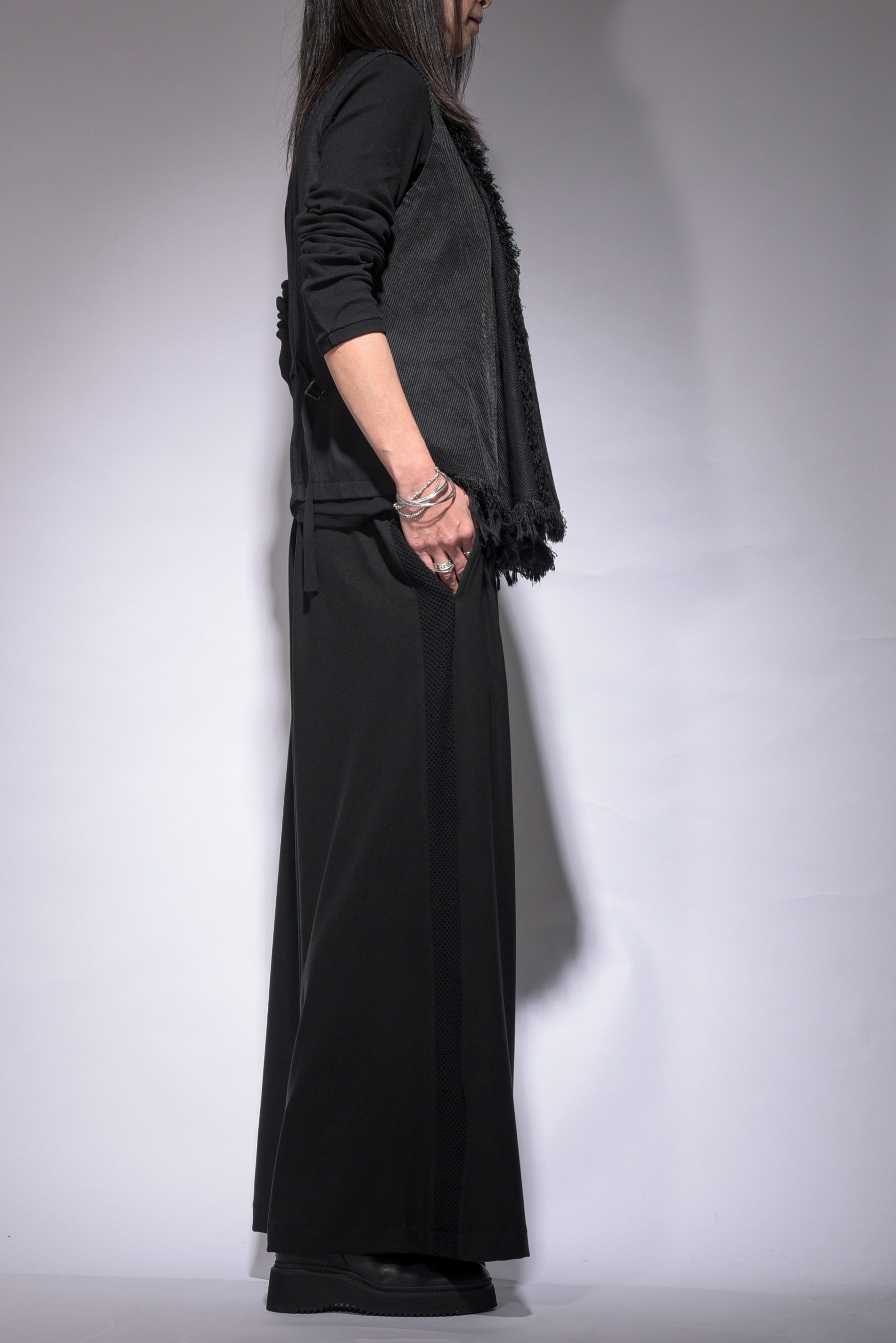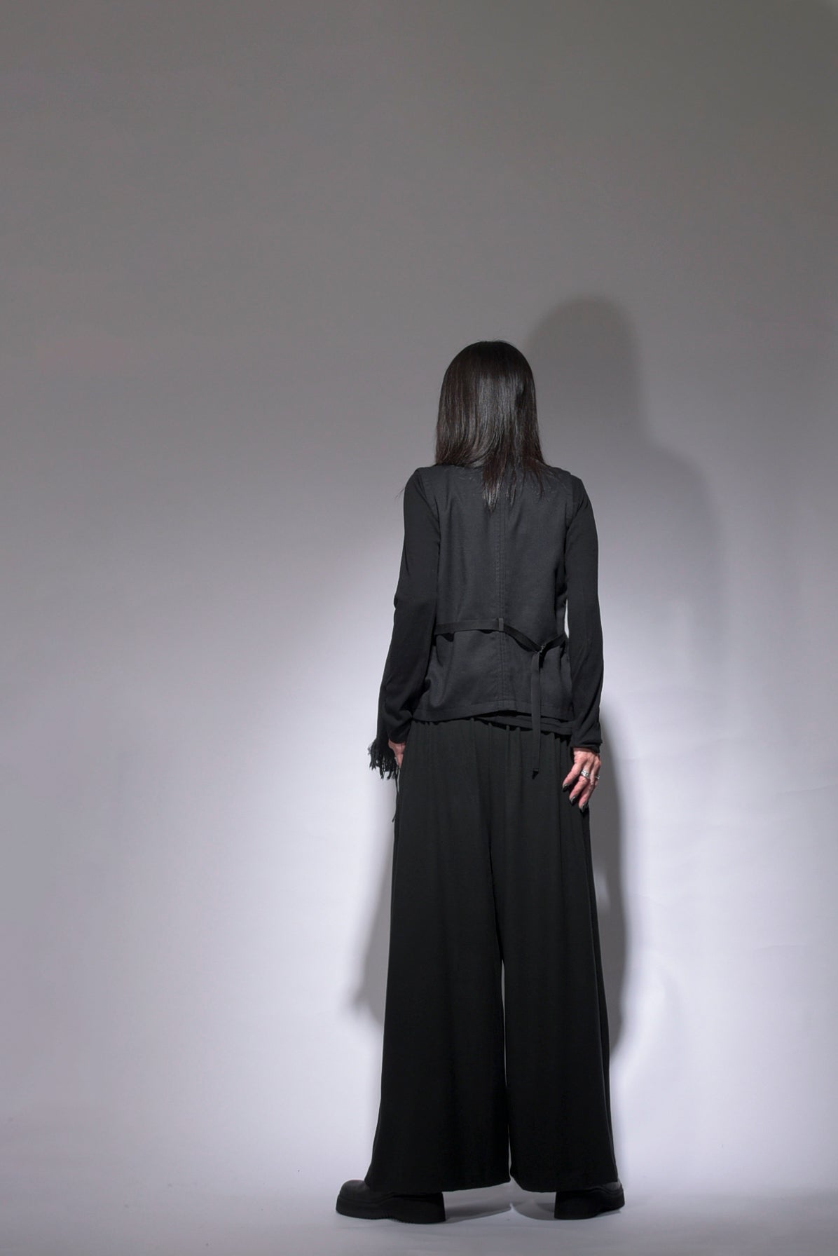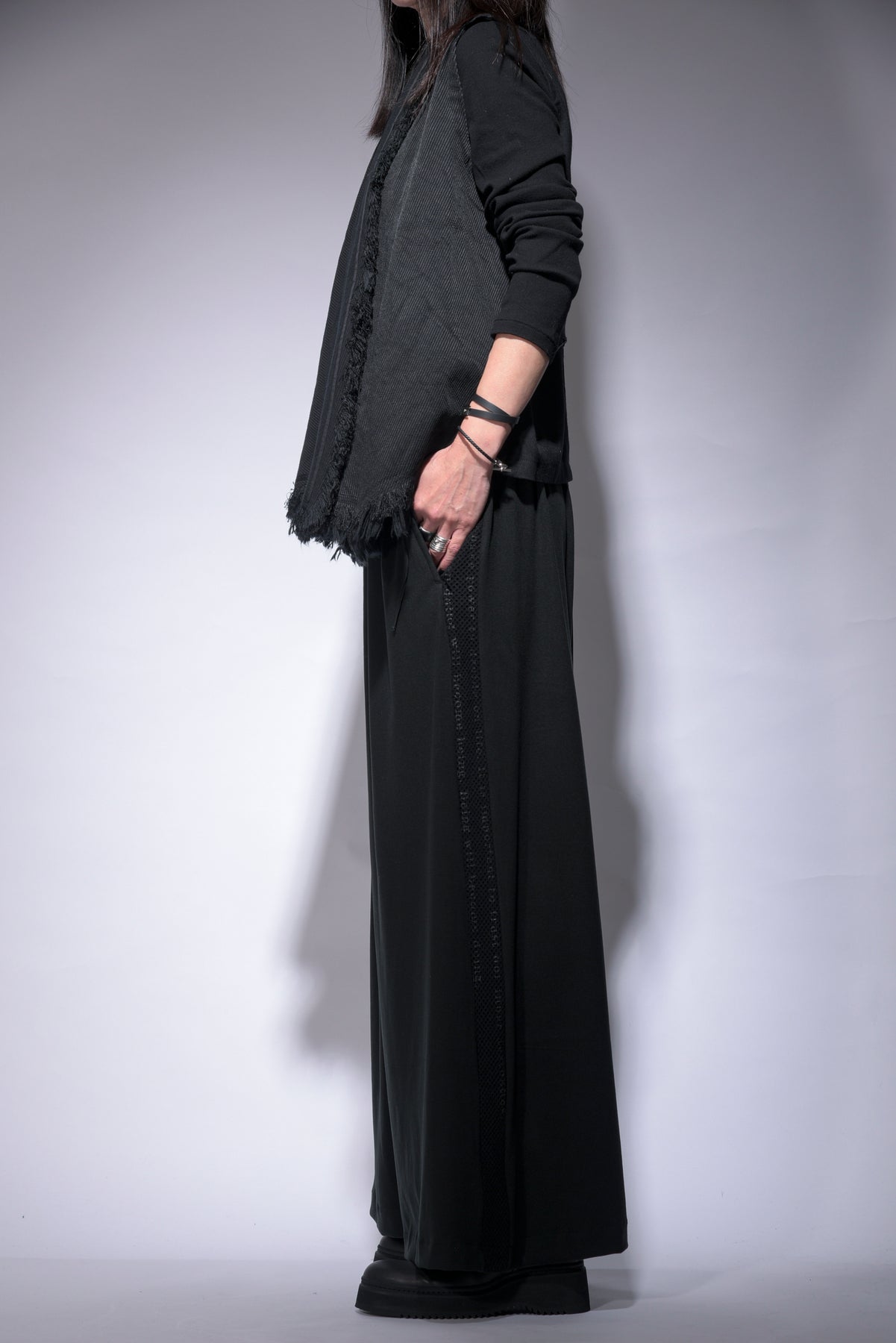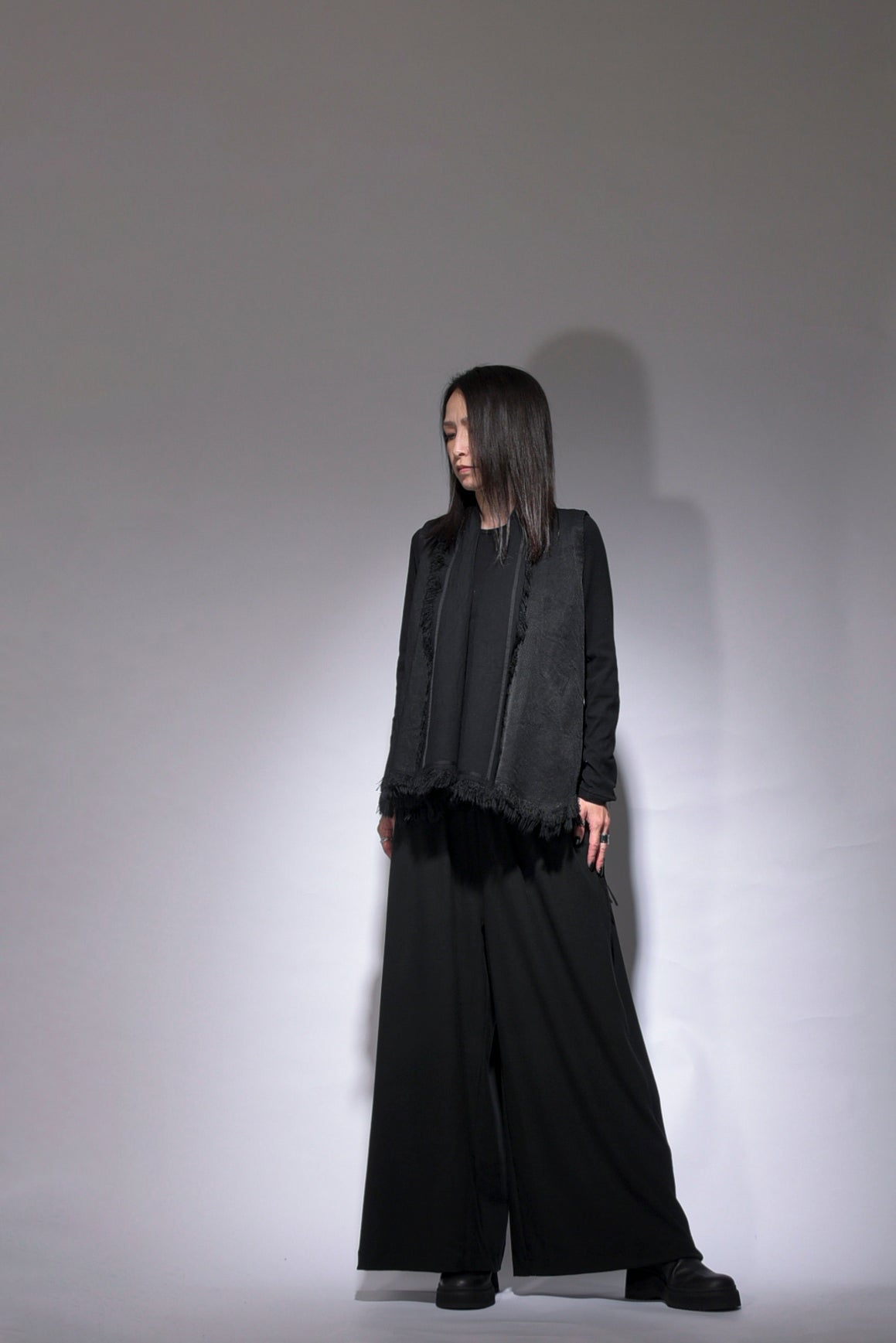 バルキー性のある細番手の糸で構成し、特殊起毛によって膨らみとソフト感を併せ持ったストレッチジャージーに。しなやかできれいな落ち感があり、ワイドパンツでもボリュームが出すぎず使い勝手が良いです。薄手で体のラインに沿いますが、適度に股上を長くしてありますのでラフな感じも出ていて大人っぽいモードなパンツです。