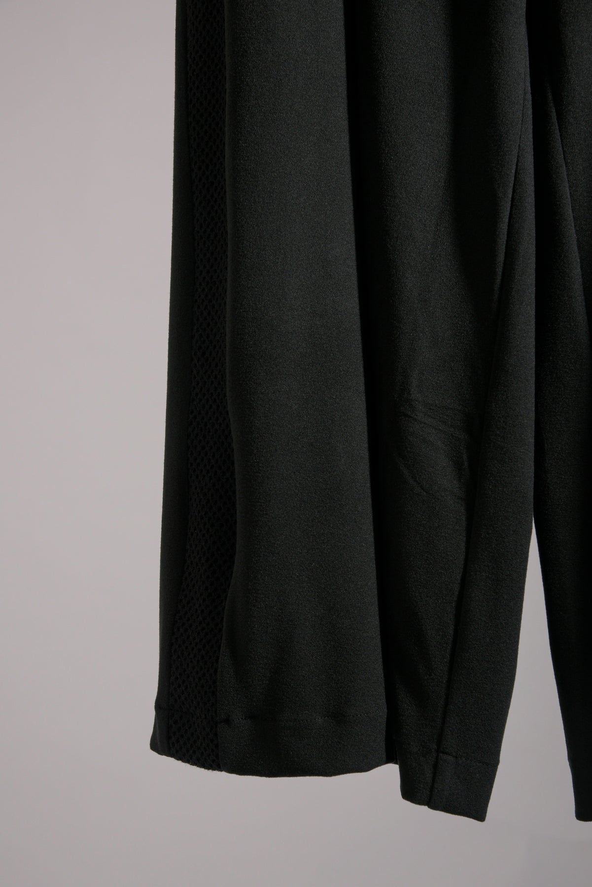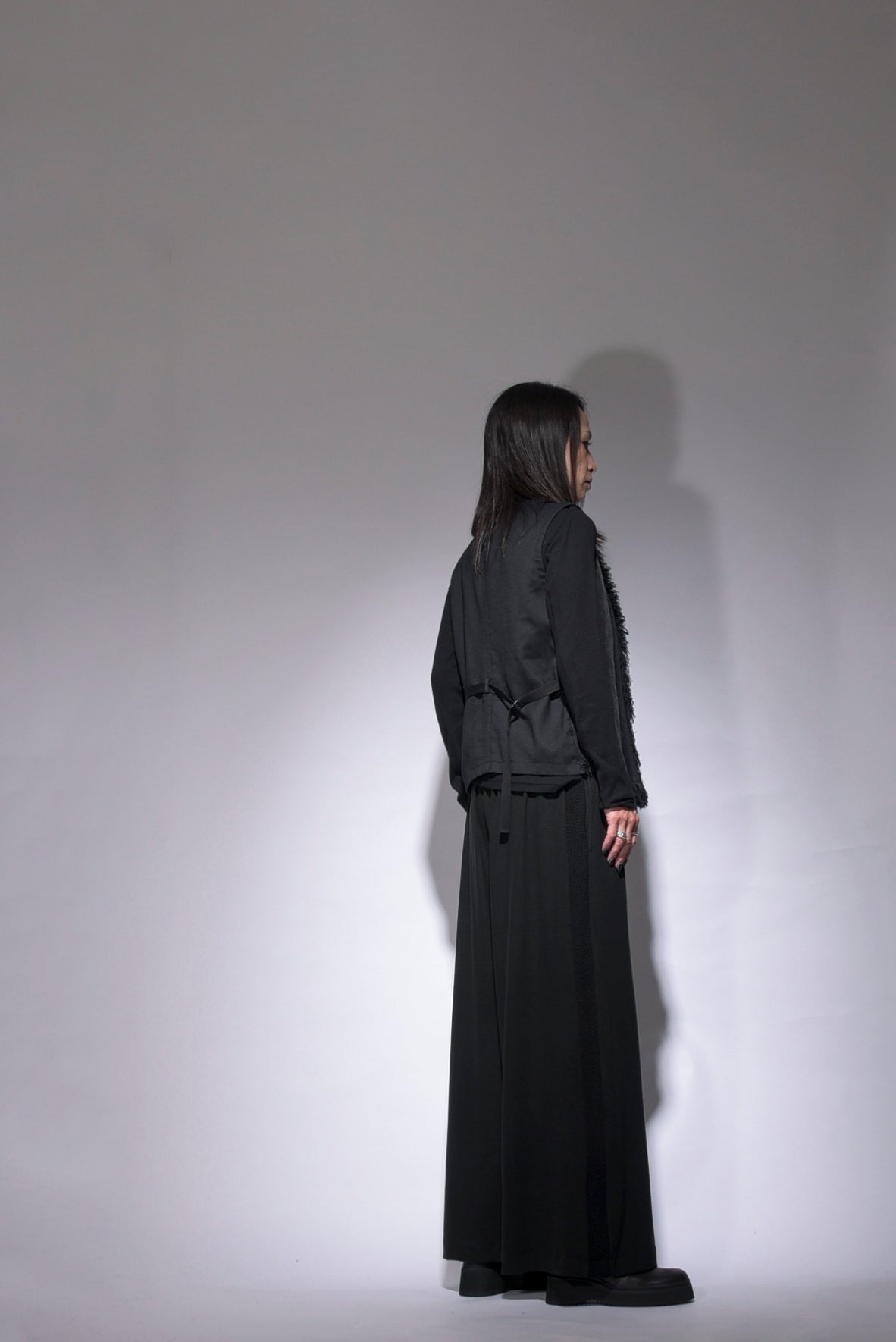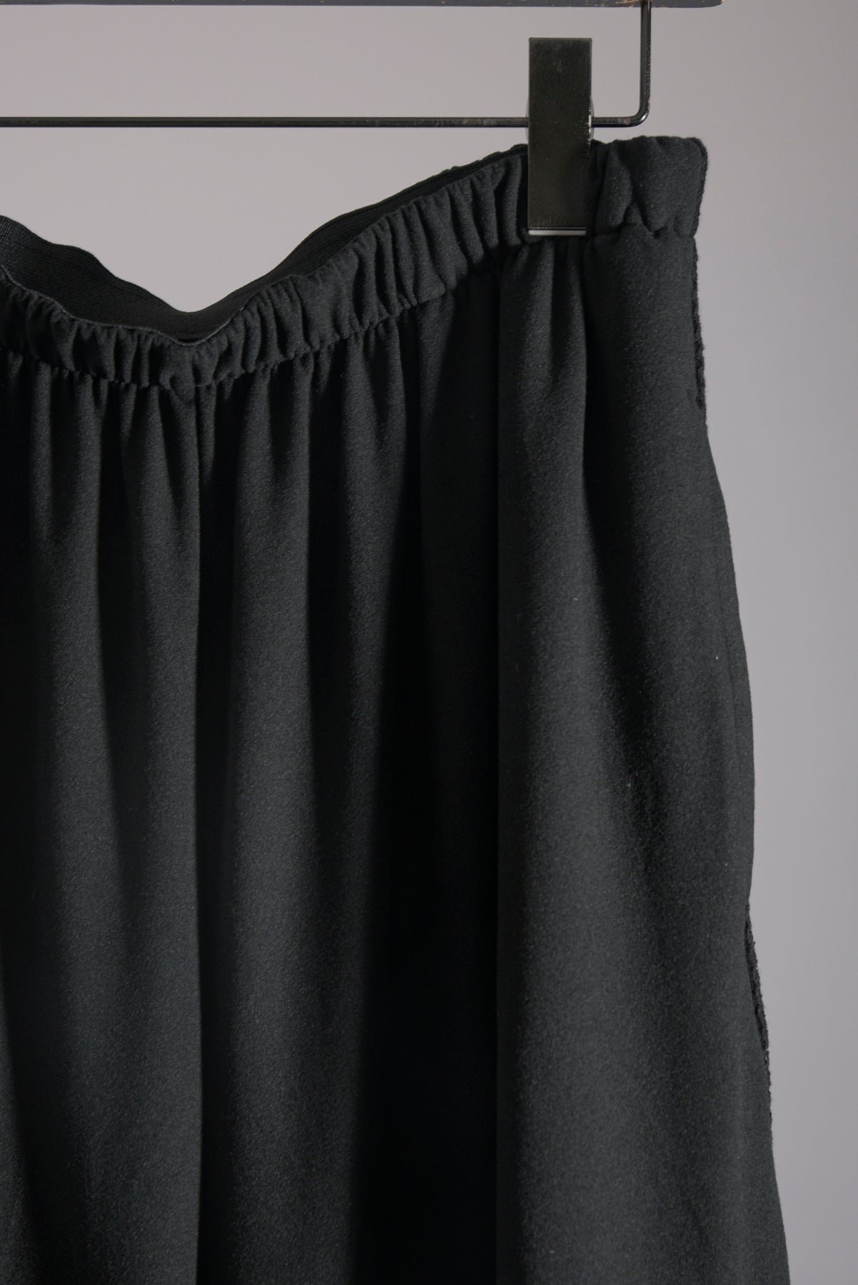 バルキー性のある細番手の糸で構成し、特殊起毛によって膨らみとソフト感を併せ持ったストレッチジャージーに。しなやかできれいな落ち感があり、ワイドパンツでもボリュームが出すぎず使い勝手が良いです。薄手で体のラインに沿いますが、適度に股上を長くしてありますのでラフな感じも出ていて大人っぽいモードなパンツです。