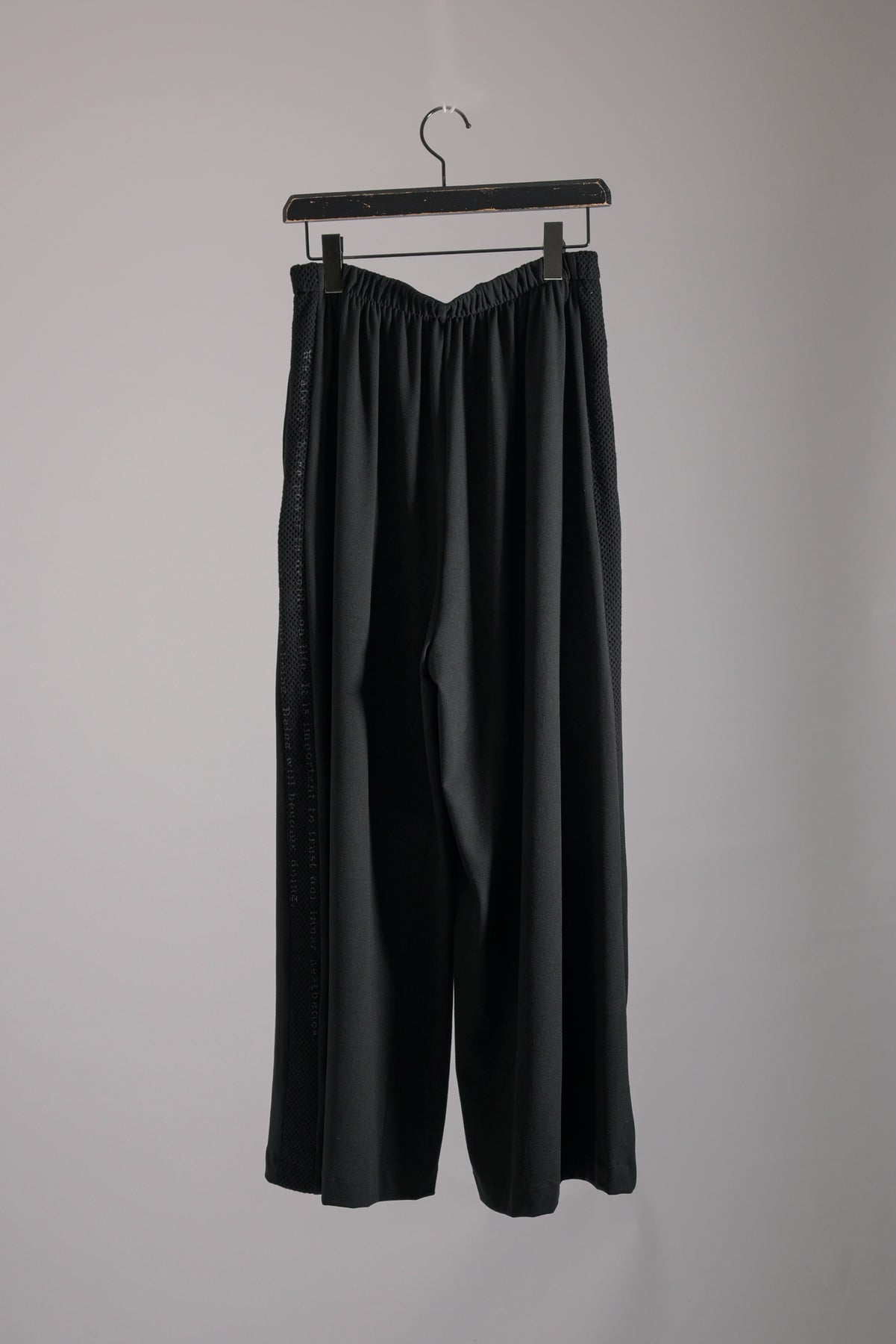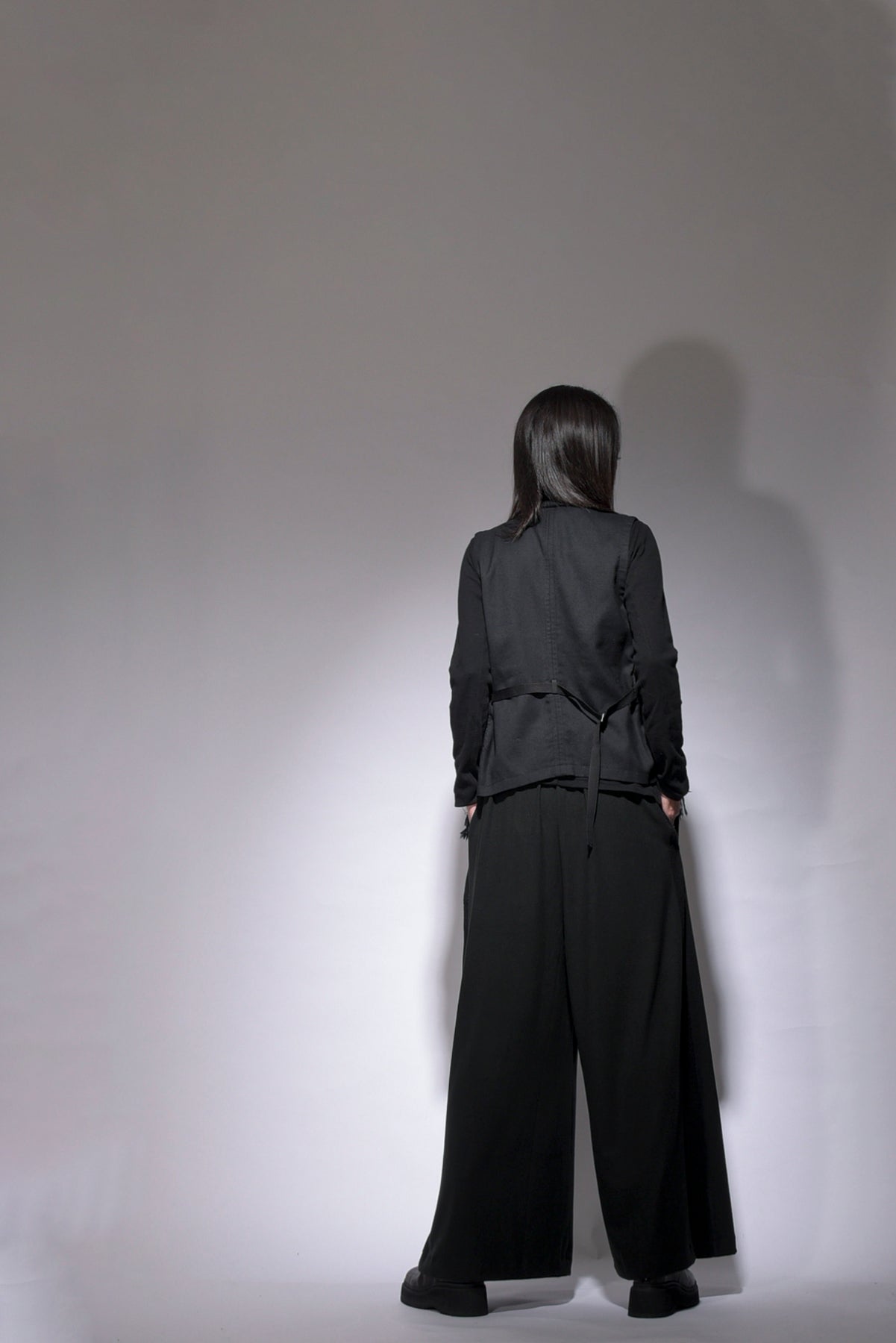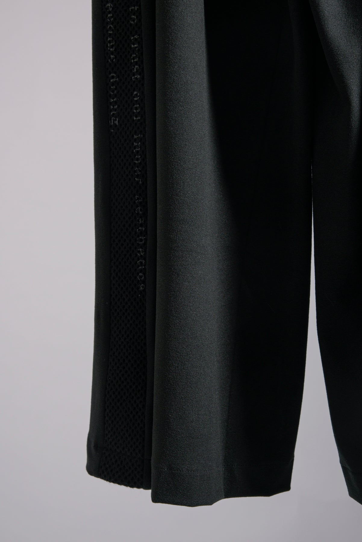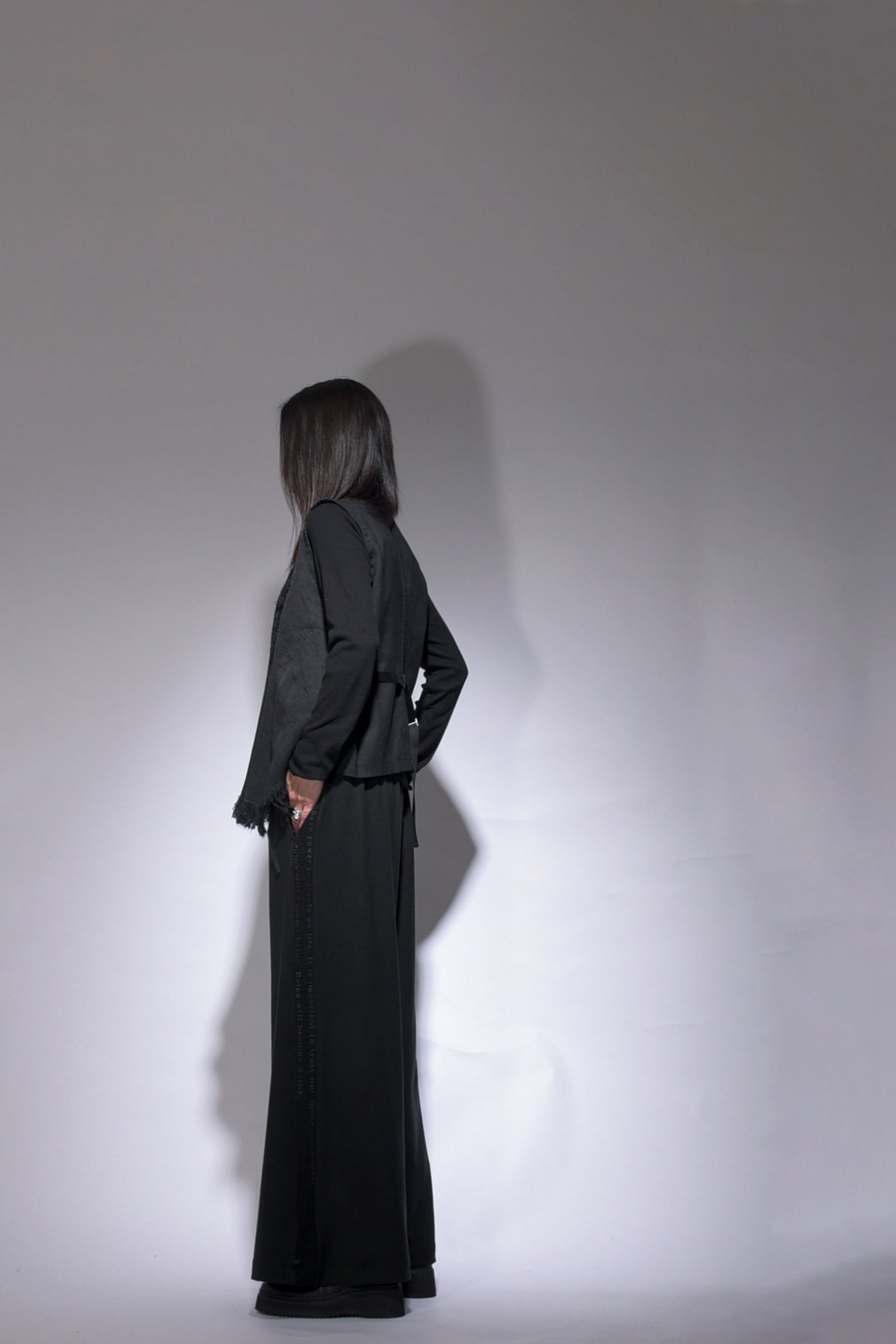 バルキー性のある細番手の糸で構成し、特殊起毛によって膨らみとソフト感を併せ持ったストレッチジャージーに。しなやかできれいな落ち感があり、ワイドパンツでもボリュームが出すぎず使い勝手が良いです。薄手で体のラインに沿いますが、適度に股上を長くしてありますのでラフな感じも出ていて大人っぽいモードなパンツです。