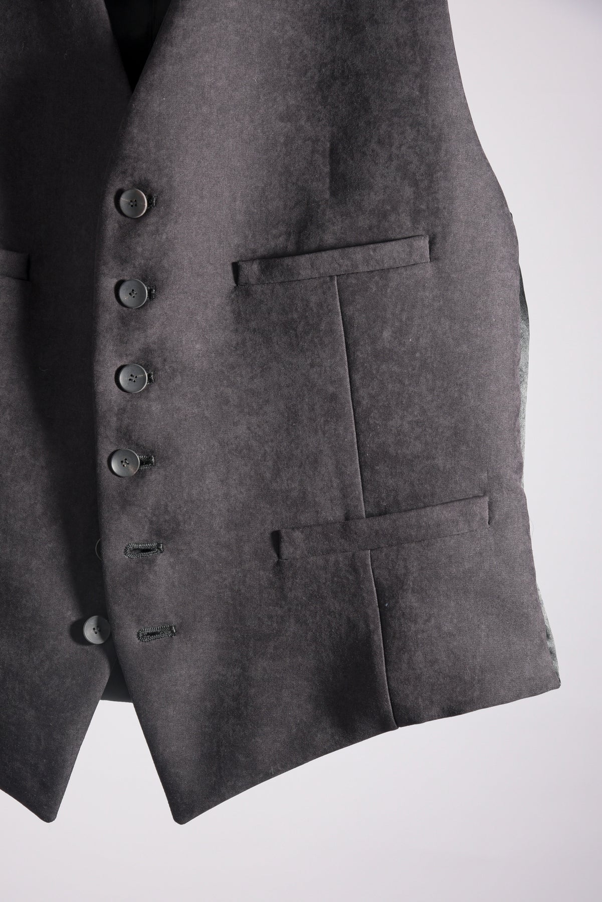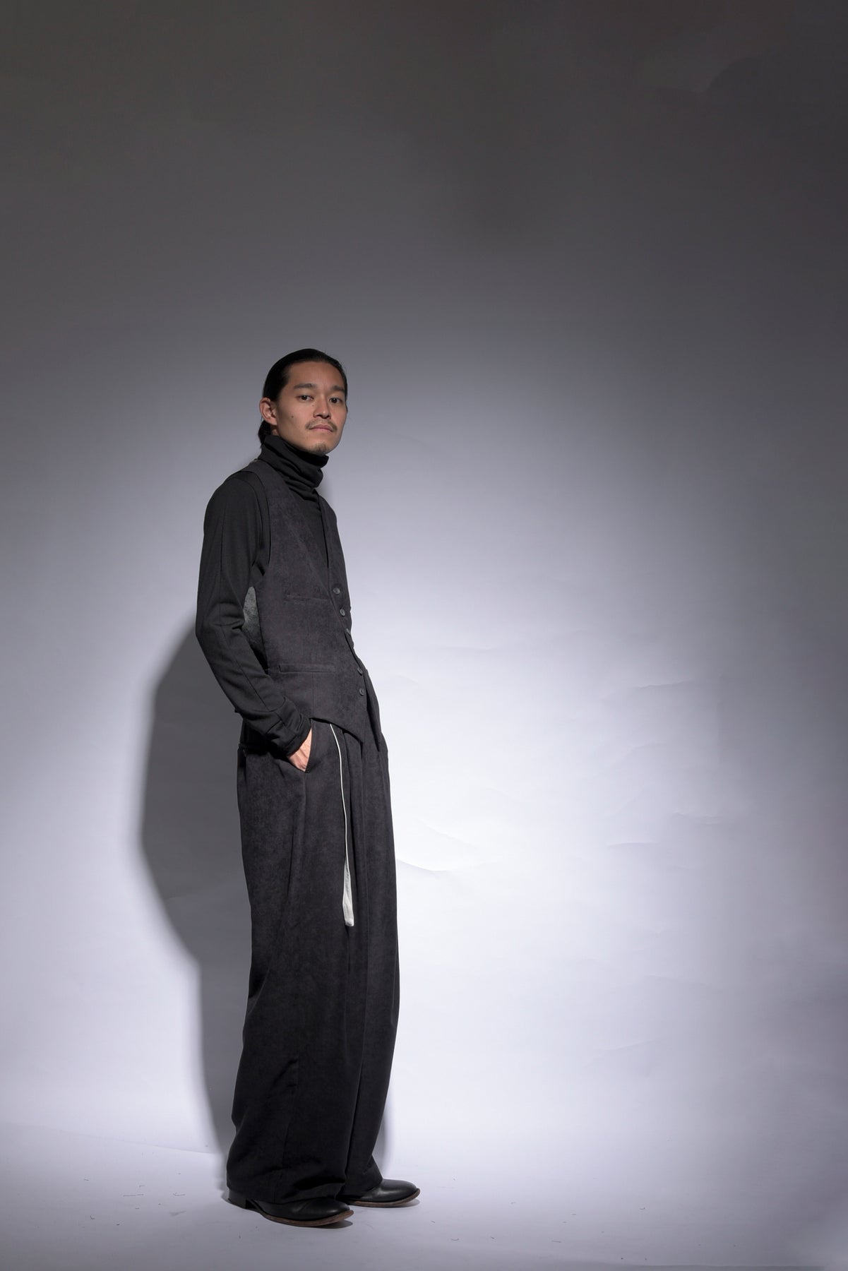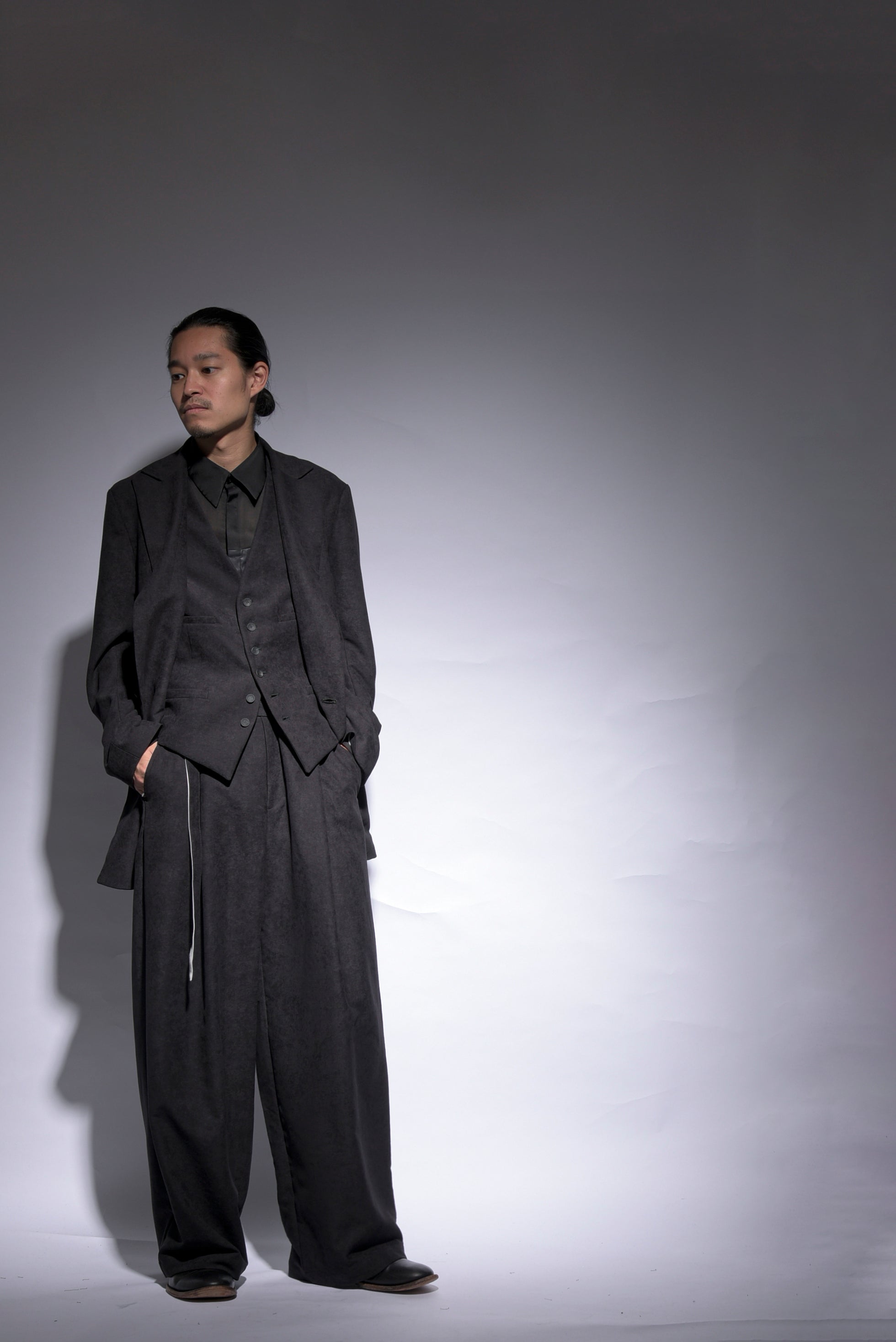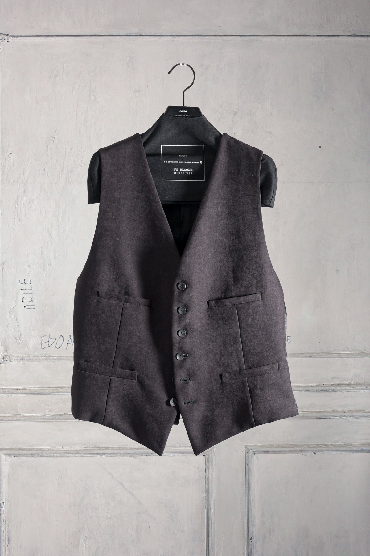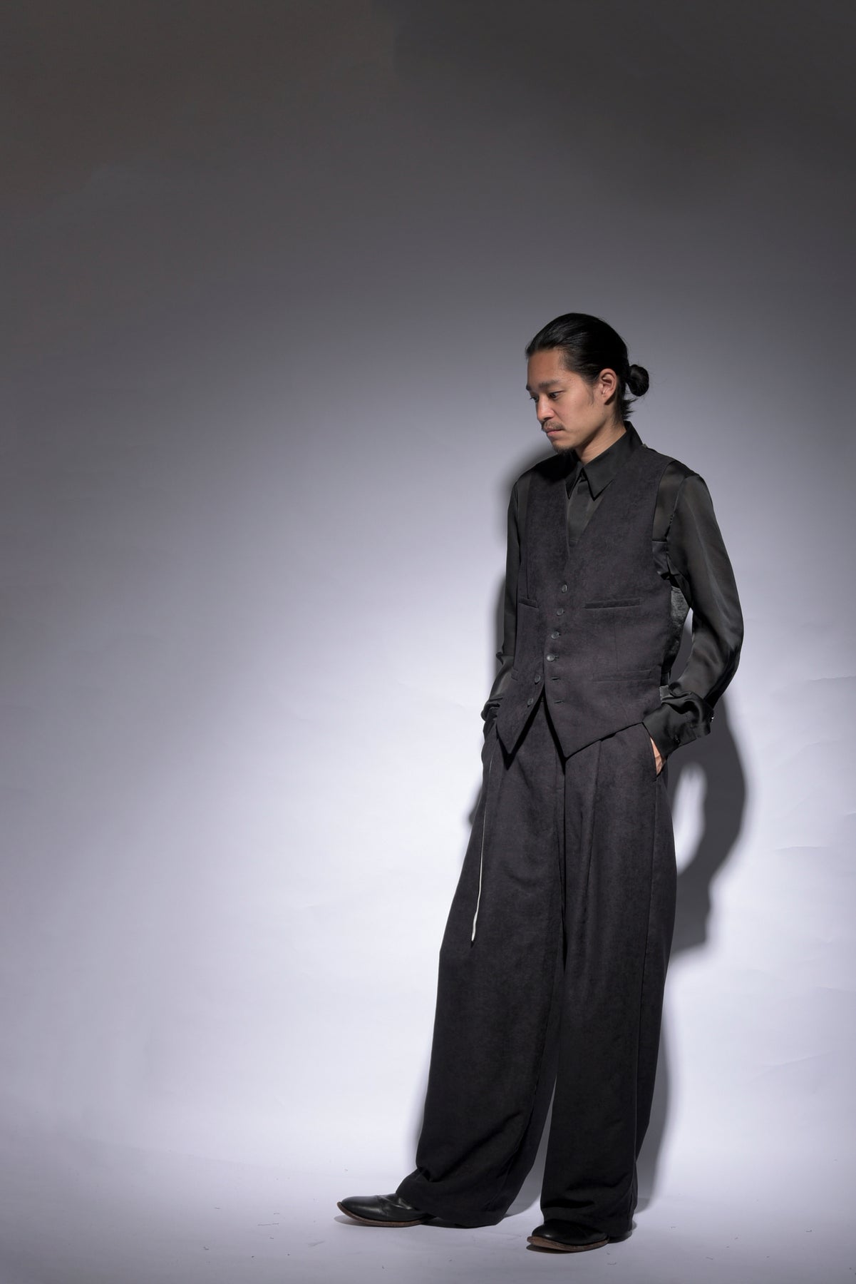 洗いをかけたような独特な風合いが特徴的なヴィンテージ割繊のベストです。生地に程よい厚みがあり、お洗濯が可能なイージーケア性があります。様々なスタイルに一枚加えることで全体が引き締まった印象に仕上げられるのぜひお持ちいただきたい1着です。同素材でジャケット、ワイドパンツもございますのでセットでのご着用もお勧めです。