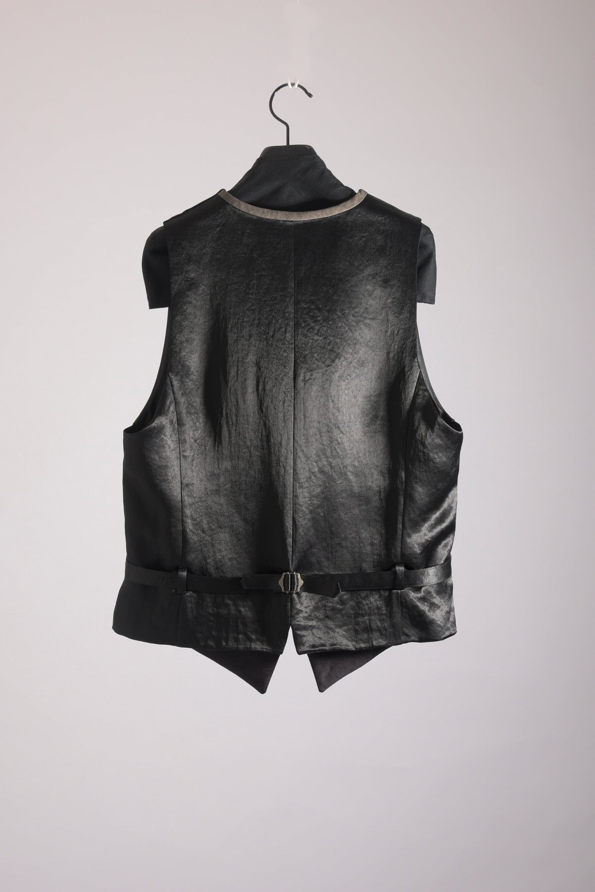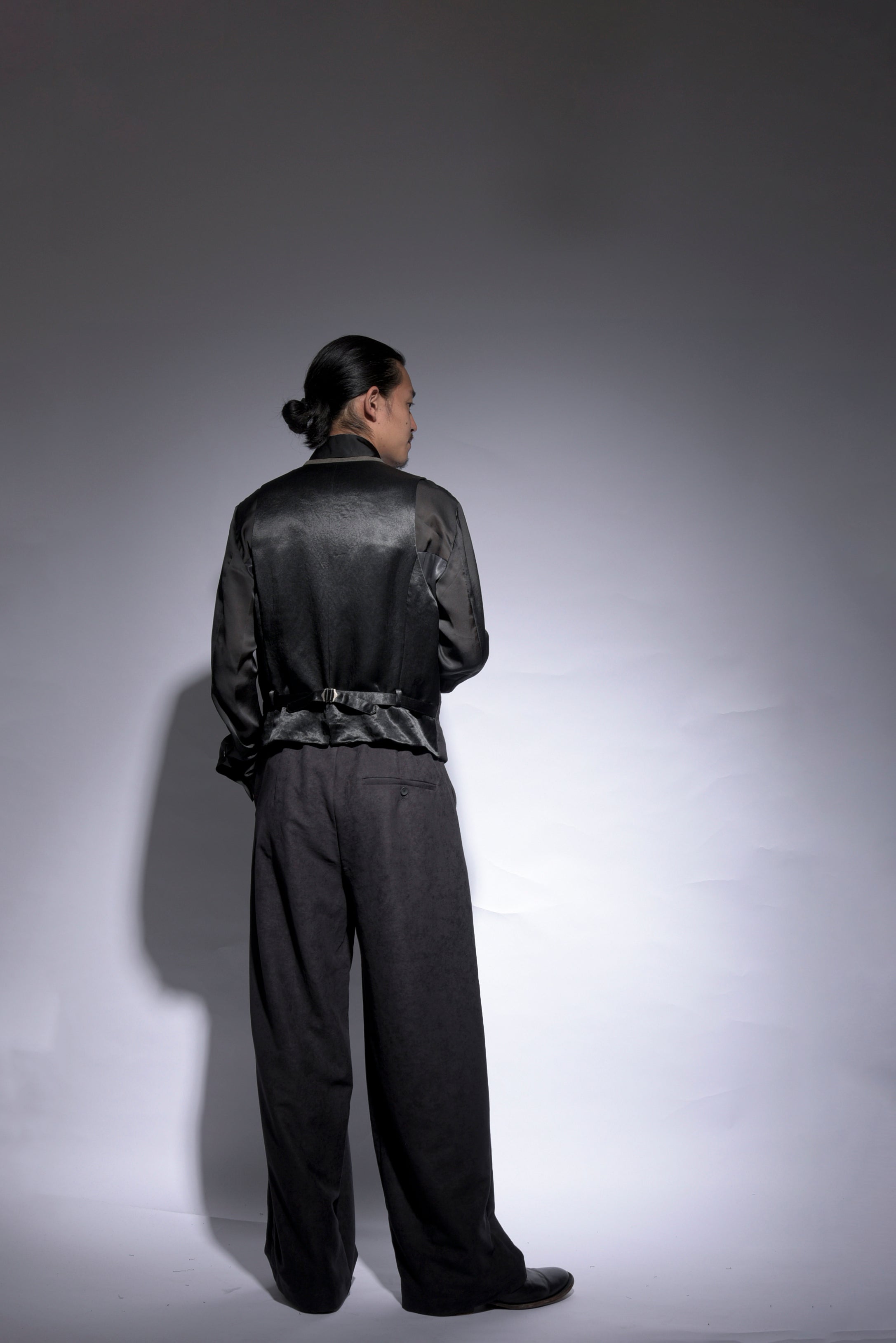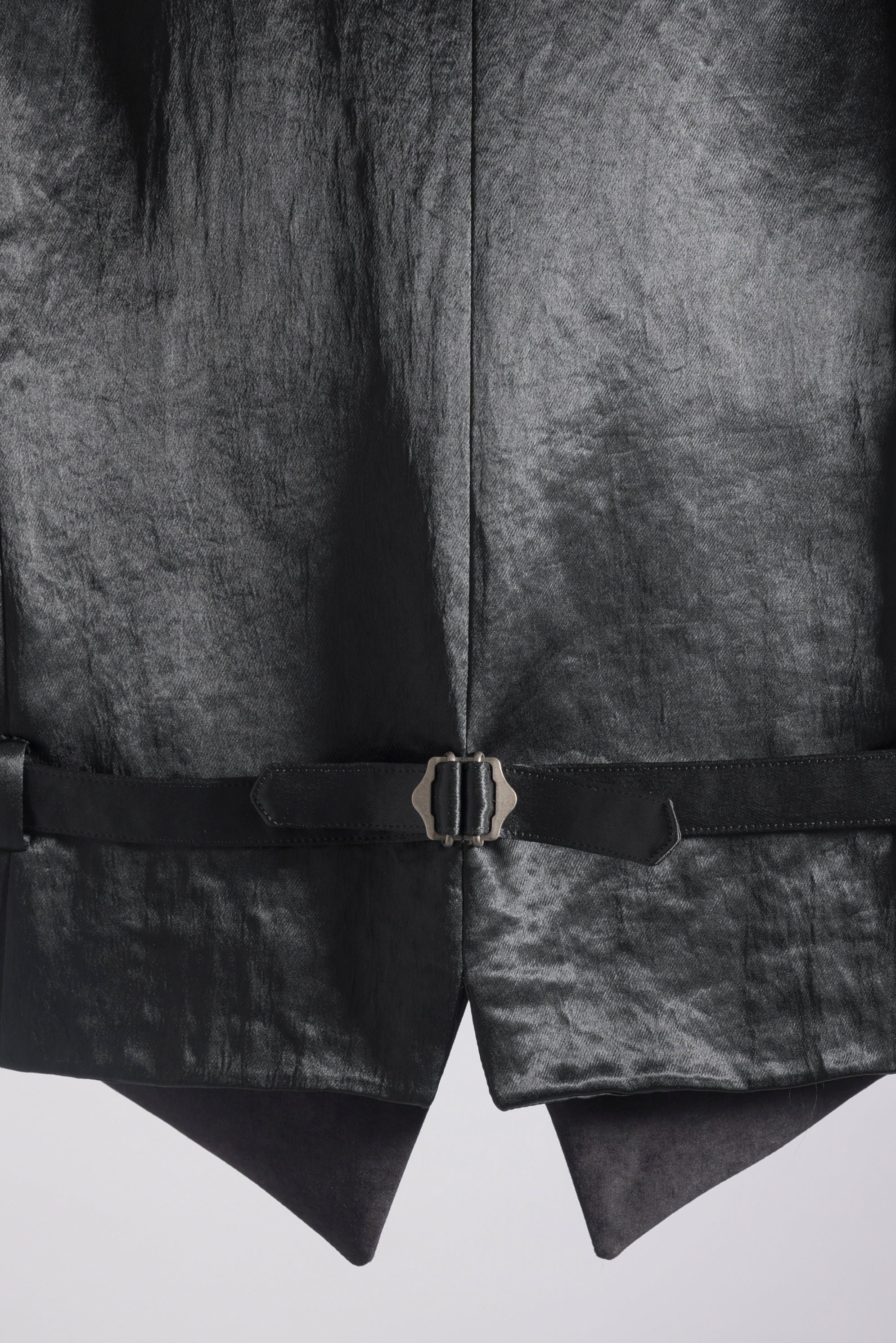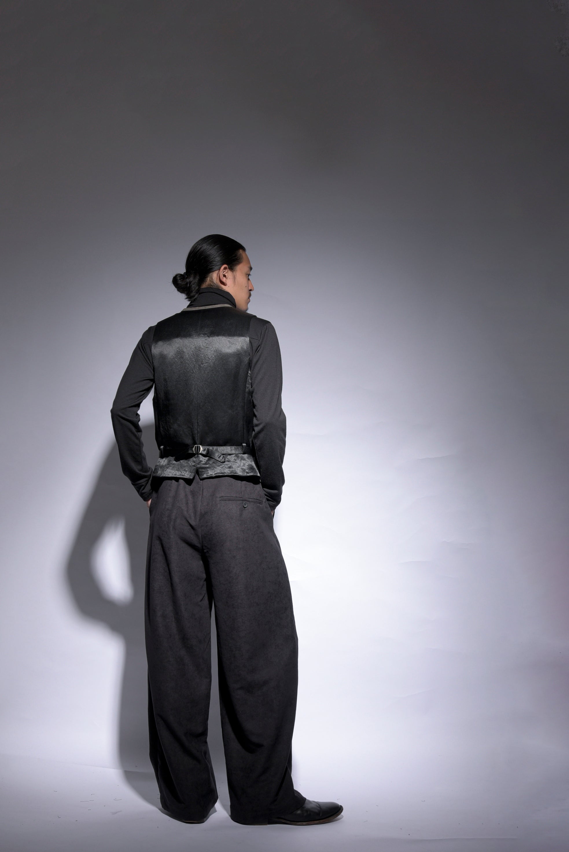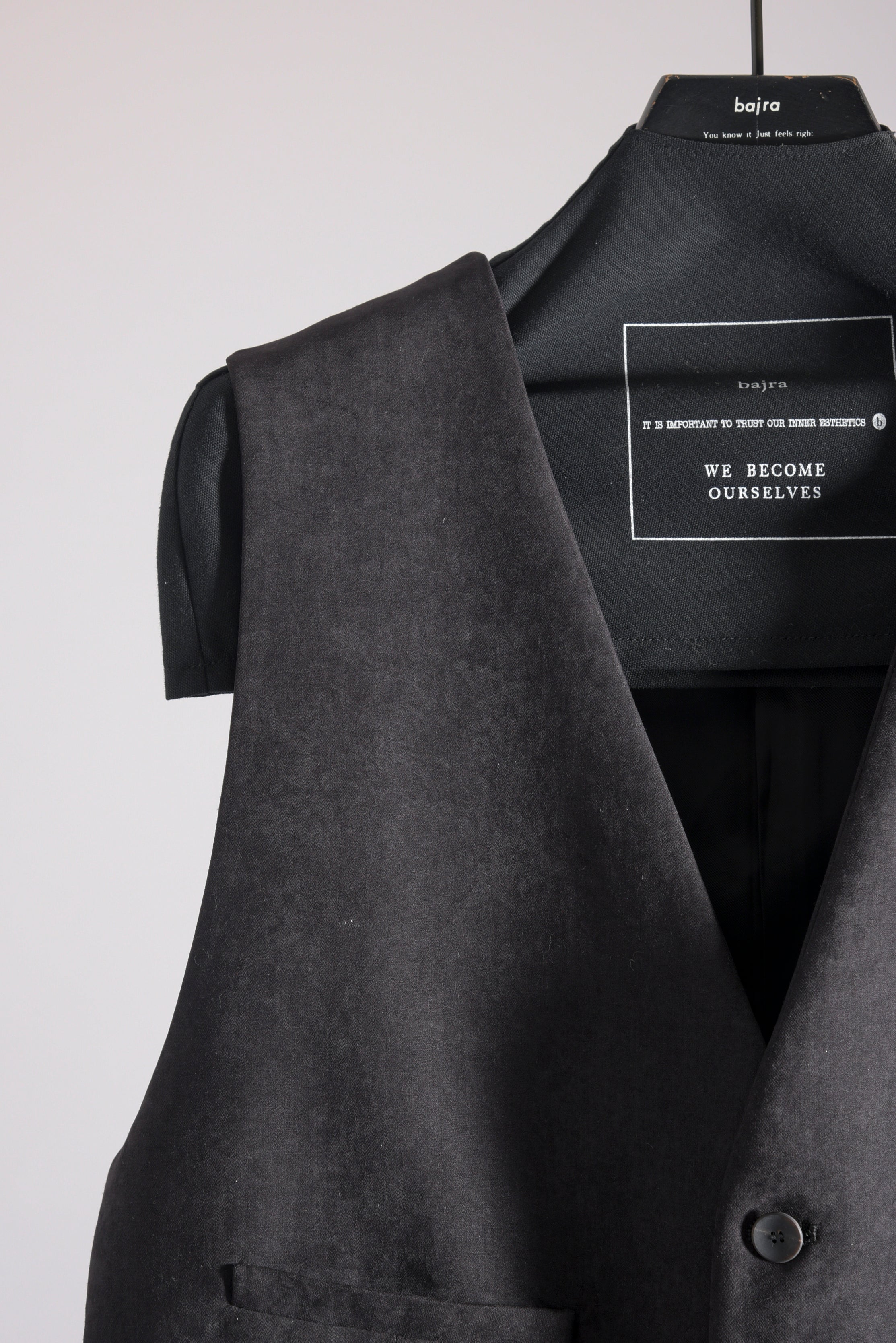 洗いをかけたような独特な風合いが特徴的なヴィンテージ割繊のベストです。生地に程よい厚みがあり、お洗濯が可能なイージーケア性があります。様々なスタイルに一枚加えることで全体が引き締まった印象に仕上げられるのぜひお持ちいただきたい1着です。同素材でジャケット、ワイドパンツもございますのでセットでのご着用もお勧めです。