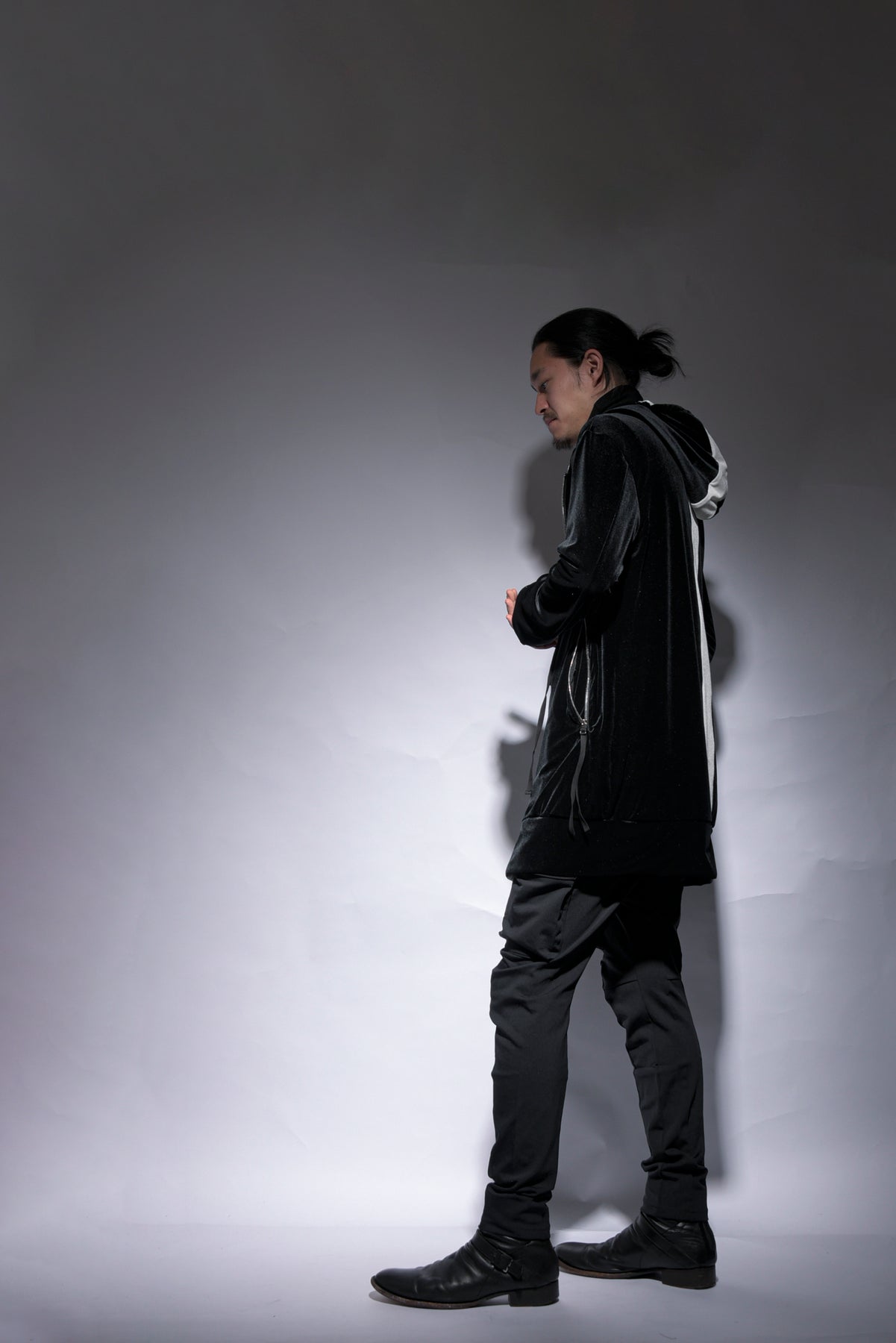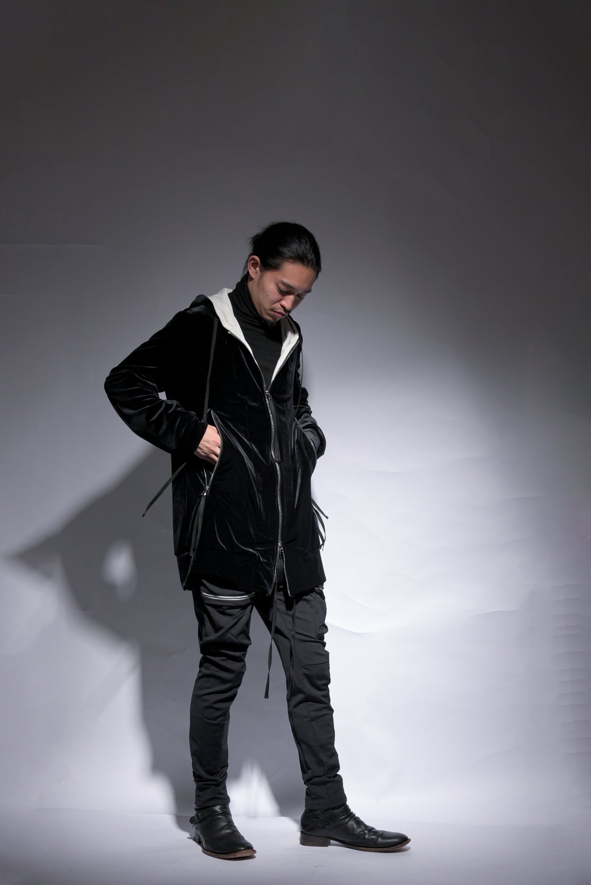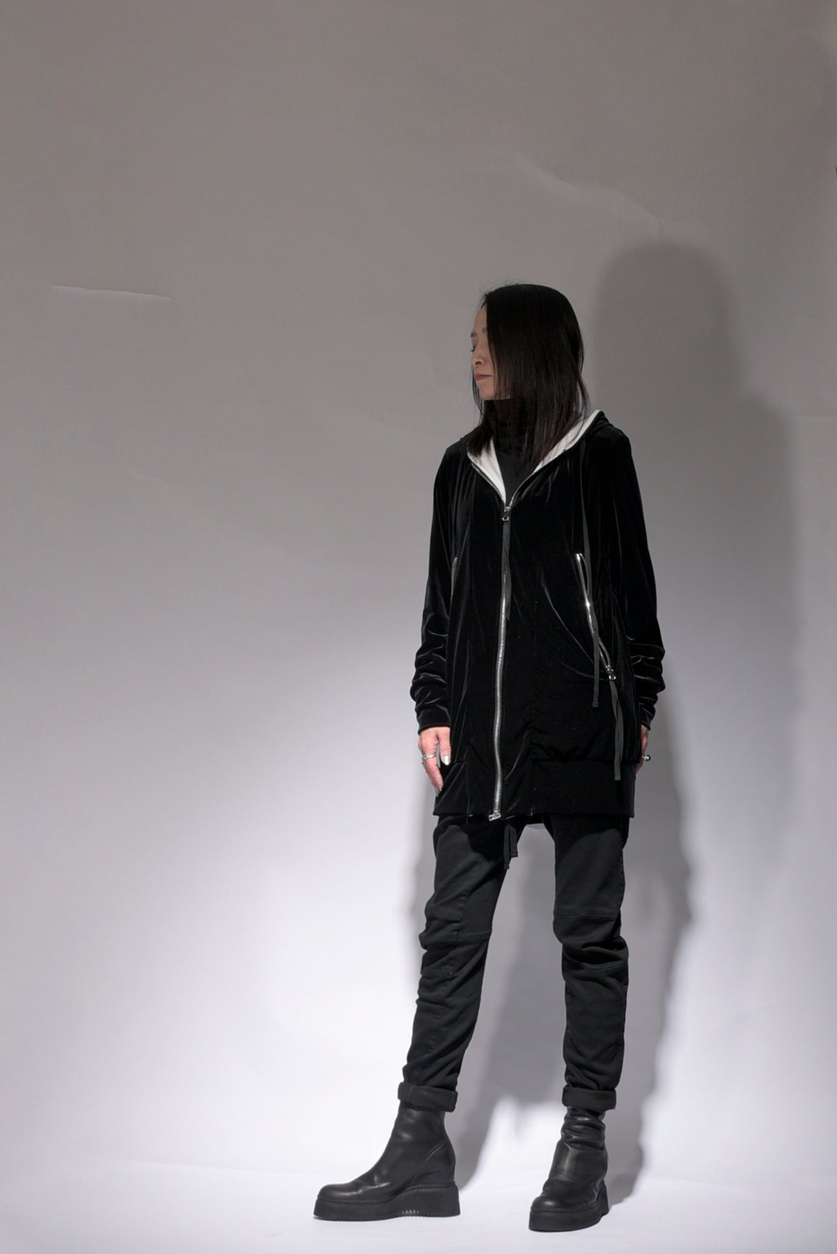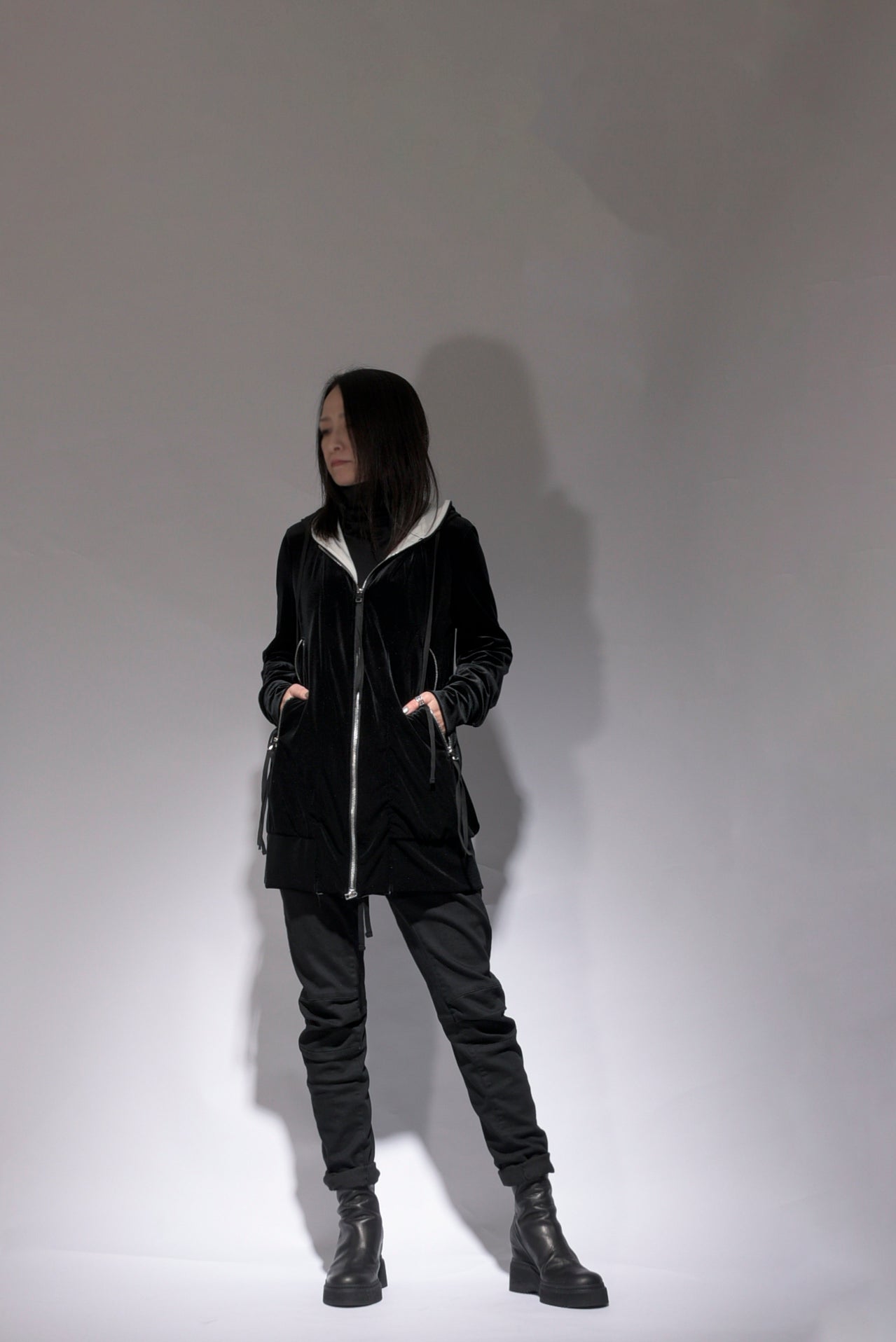 ブライトポリエステル(光沢感のある上品な光沢感が特徴)を使用したベロア素材、ポリエステルを一緒に編み込むことでキックバックに優れたストレッチ性があります。カーディガンのように気軽に羽織れるロングパーカーです。厚すぎず薄すぎずでブルゾンやコートの中にもご着用いただける、お持ちいただくととても便利な1着です。