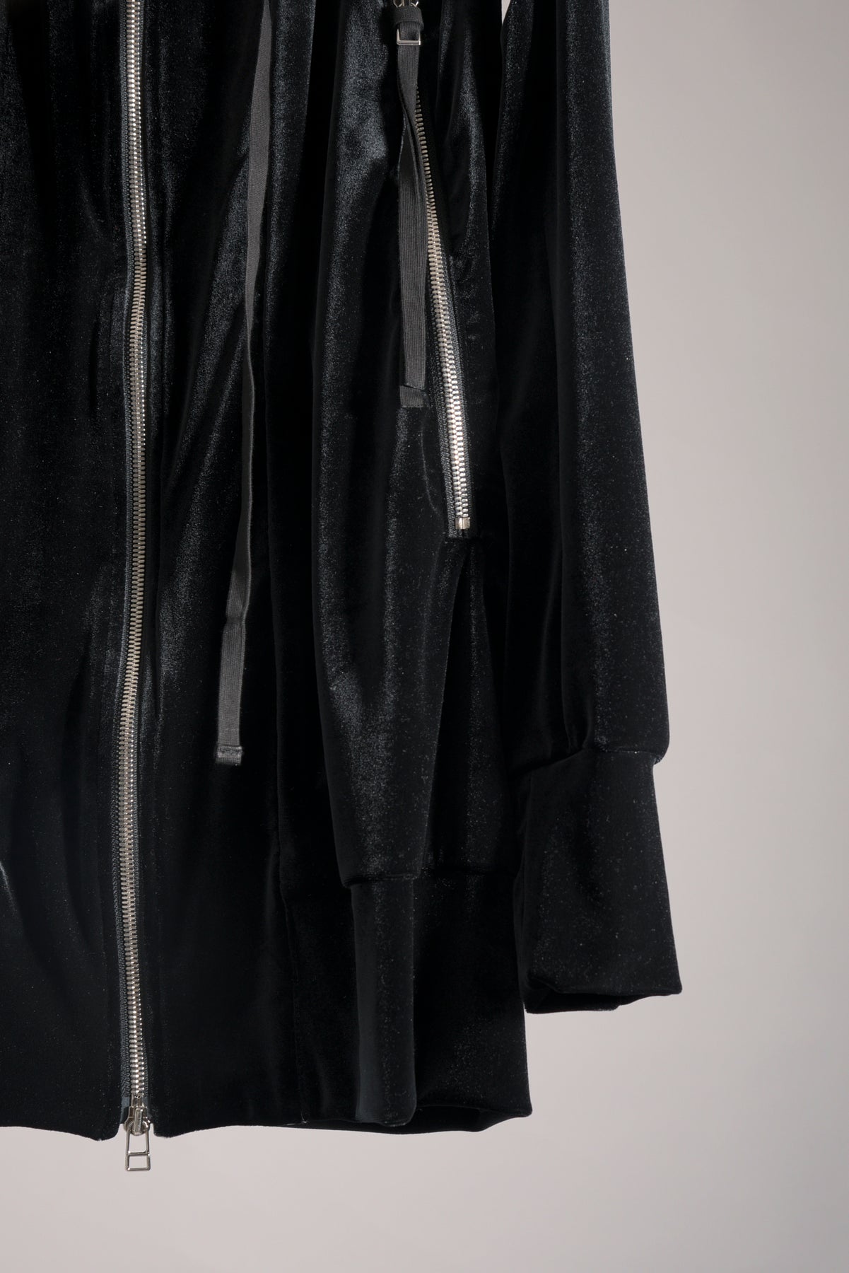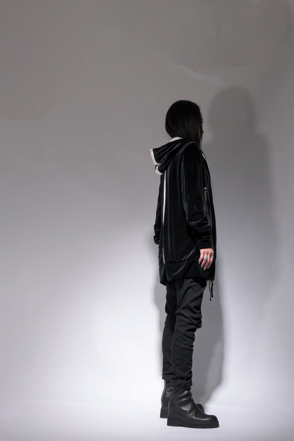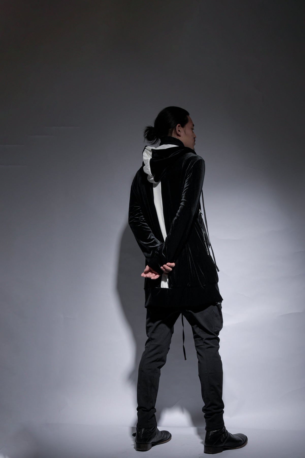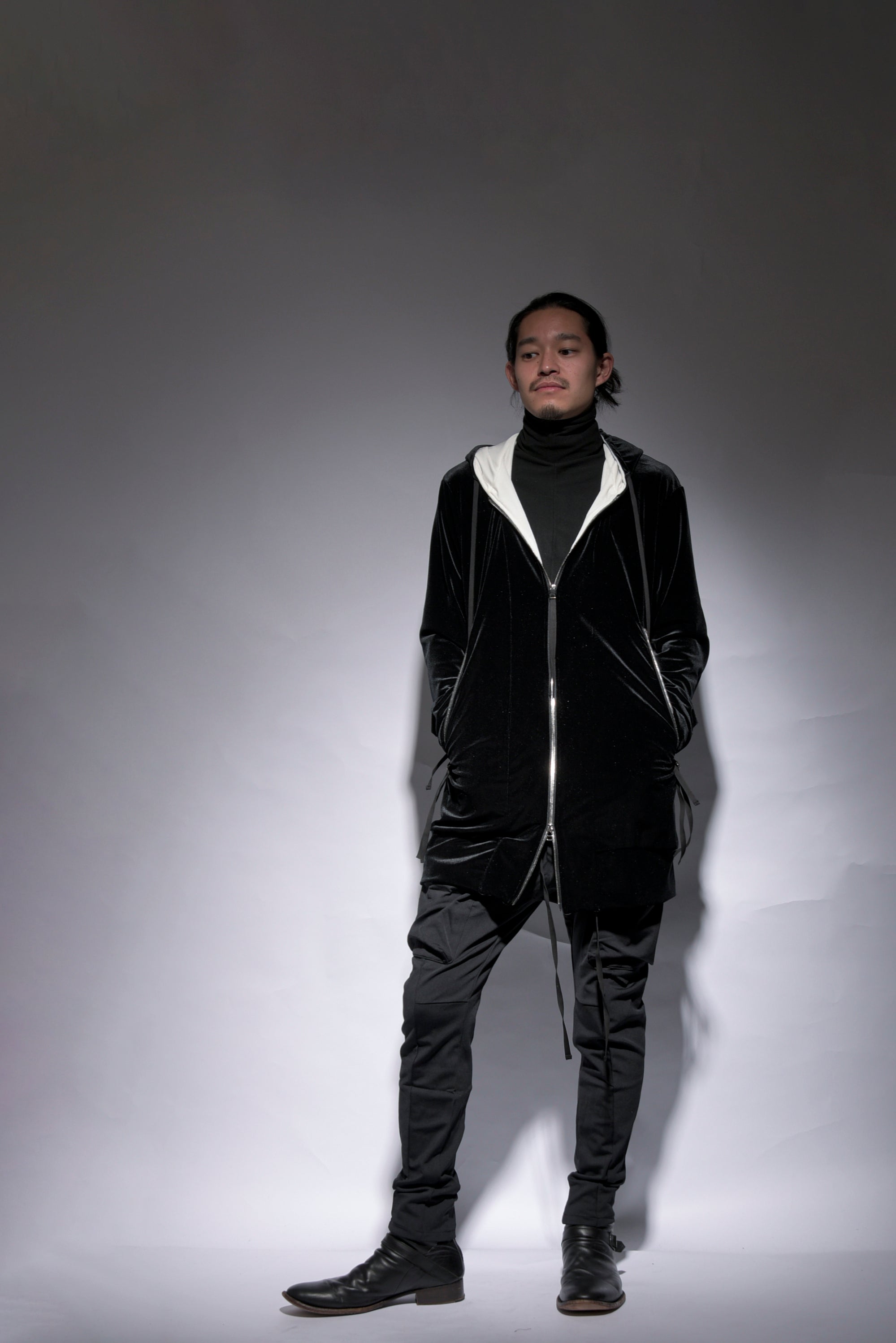 ブライトポリエステル(光沢感のある上品な光沢感が特徴)を使用したベロア素材、ポリエステルを一緒に編み込むことでキックバックに優れたストレッチ性があります。カーディガンのように気軽に羽織れるロングパーカーです。厚すぎず薄すぎずでブルゾンやコートの中にもご着用いただける、お持ちいただくととても便利な1着です。