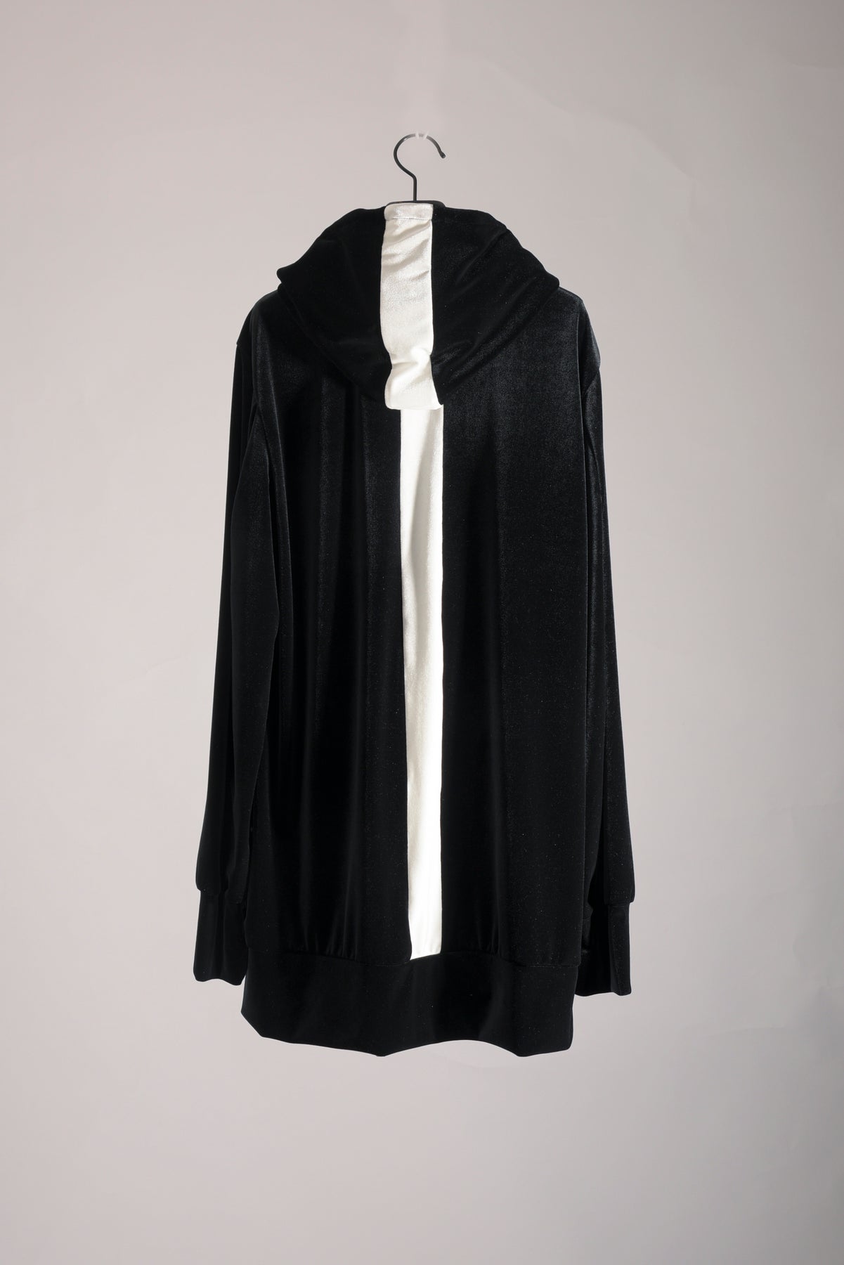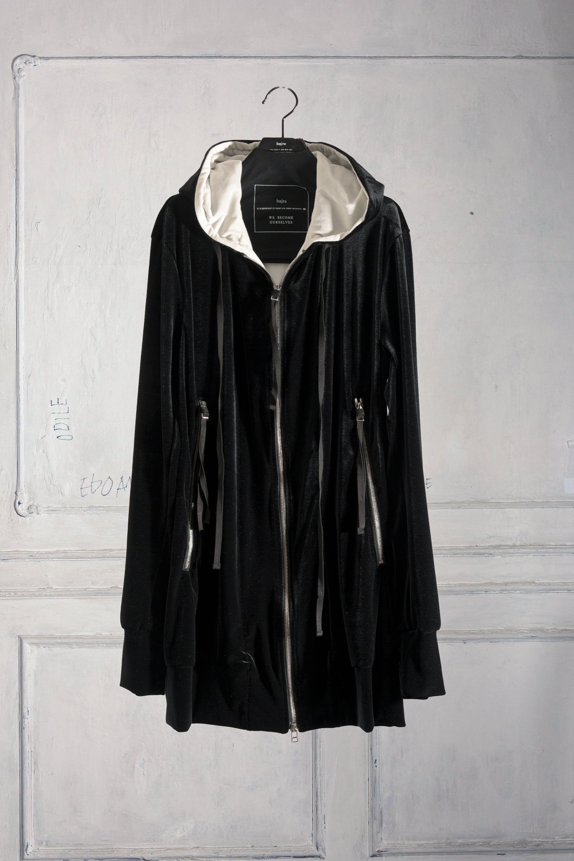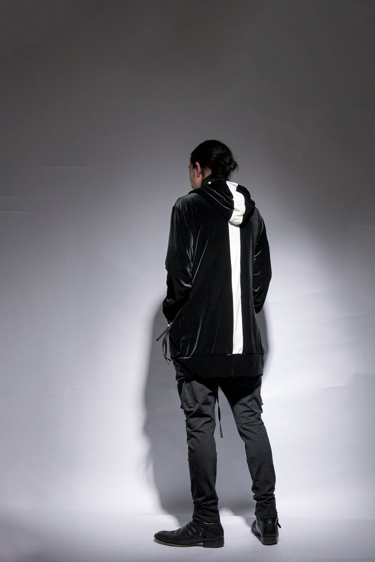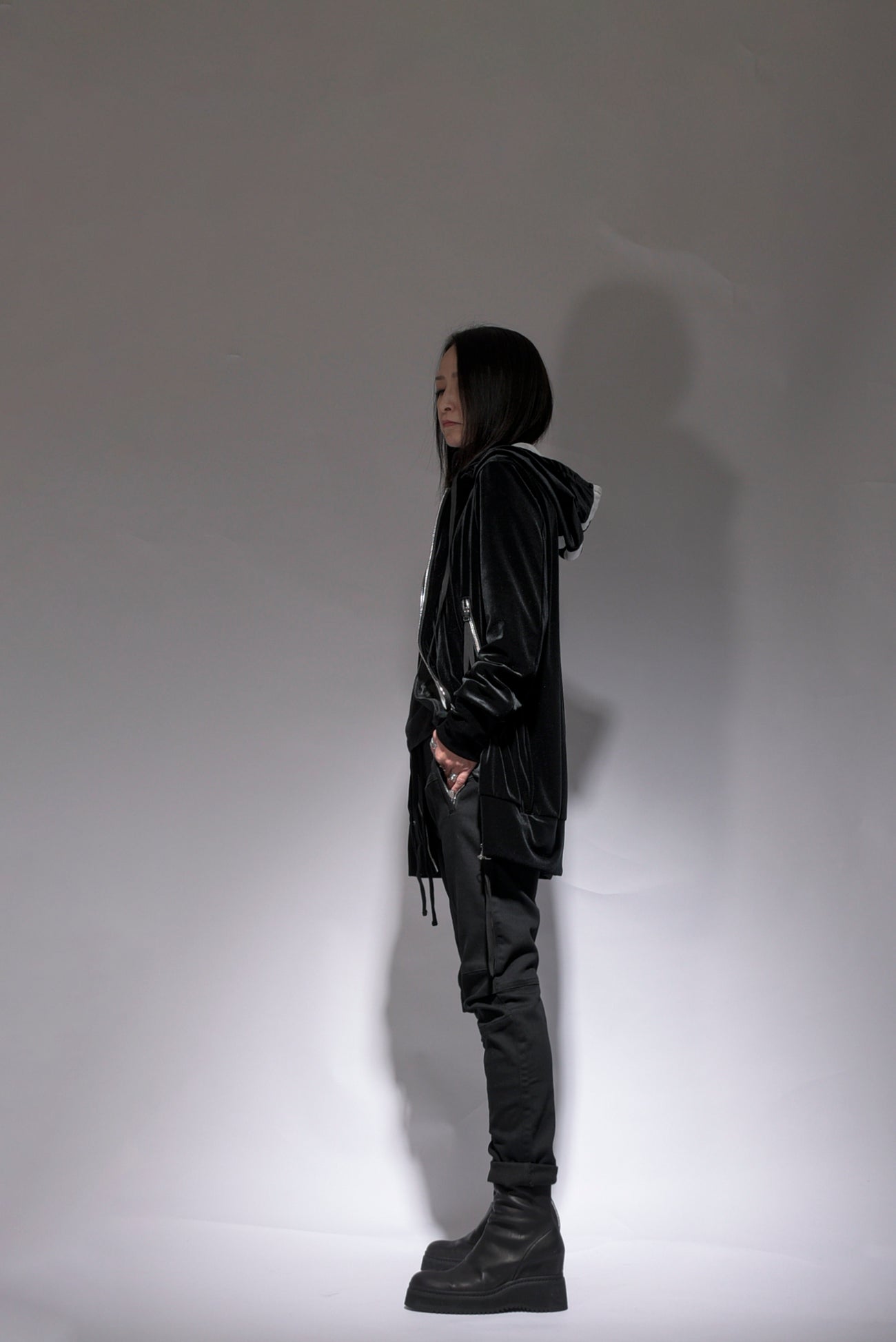 ブライトポリエステル(光沢感のある上品な光沢感が特徴)を使用したベロア素材、ポリエステルを一緒に編み込むことでキックバックに優れたストレッチ性があります。カーディガンのように気軽に羽織れるロングパーカーです。厚すぎず薄すぎずでブルゾンやコートの中にもご着用いただける、お持ちいただくととても便利な1着です。