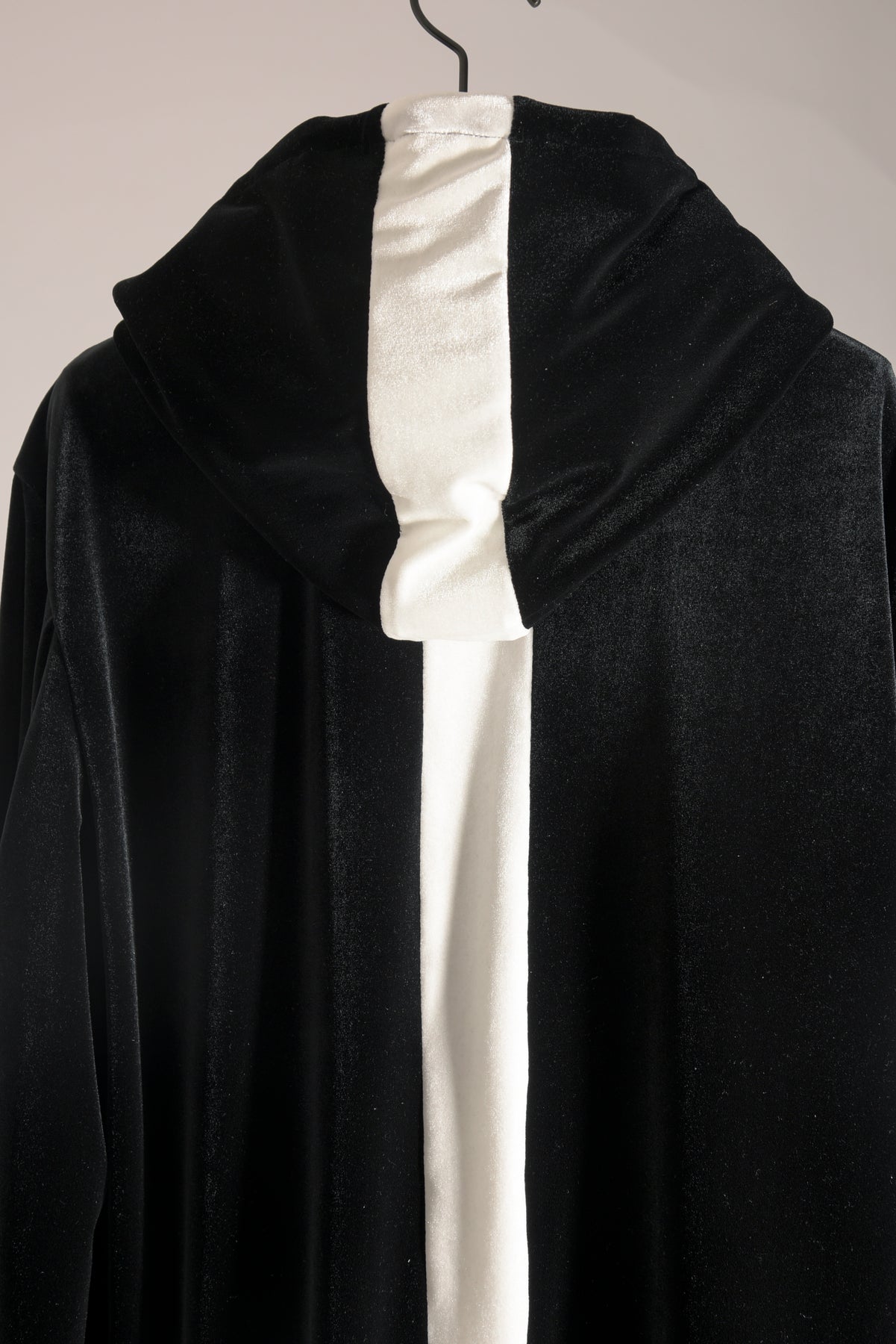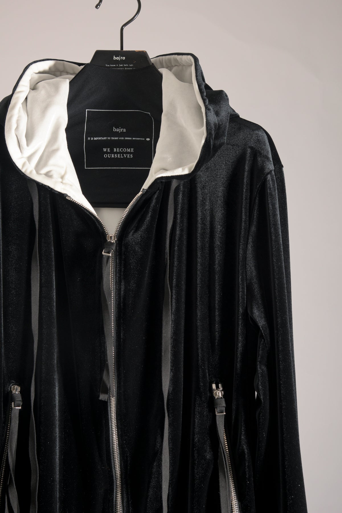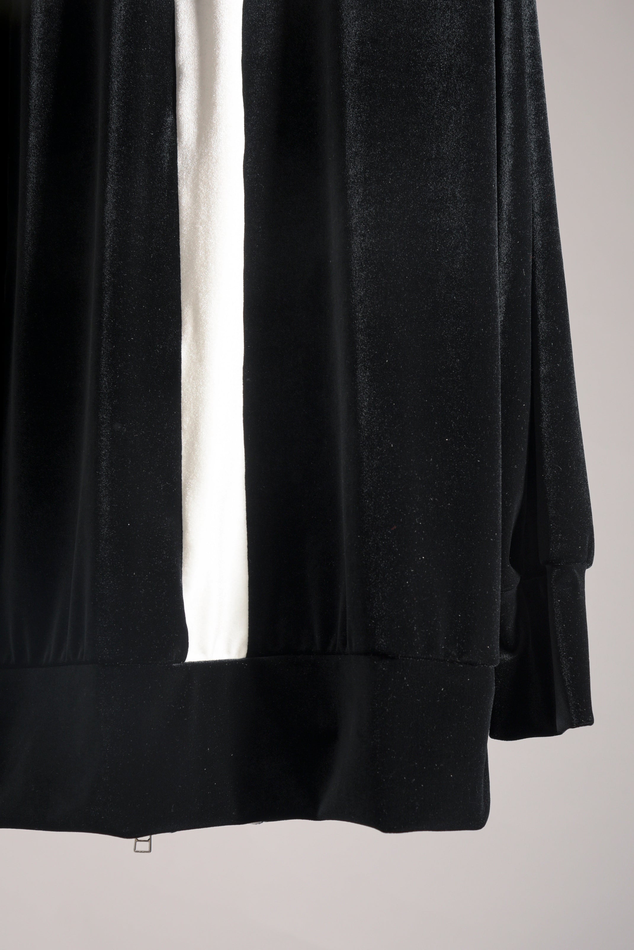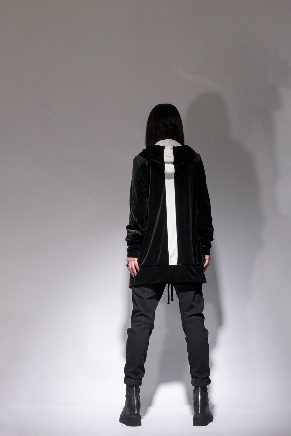 ブライトポリエステル(光沢感のある上品な光沢感が特徴)を使用したベロア素材、ポリエステルを一緒に編み込むことでキックバックに優れたストレッチ性があります。カーディガンのように気軽に羽織れるロングパーカーです。厚すぎず薄すぎずでブルゾンやコートの中にもご着用いただける、お持ちいただくととても便利な1着です。
