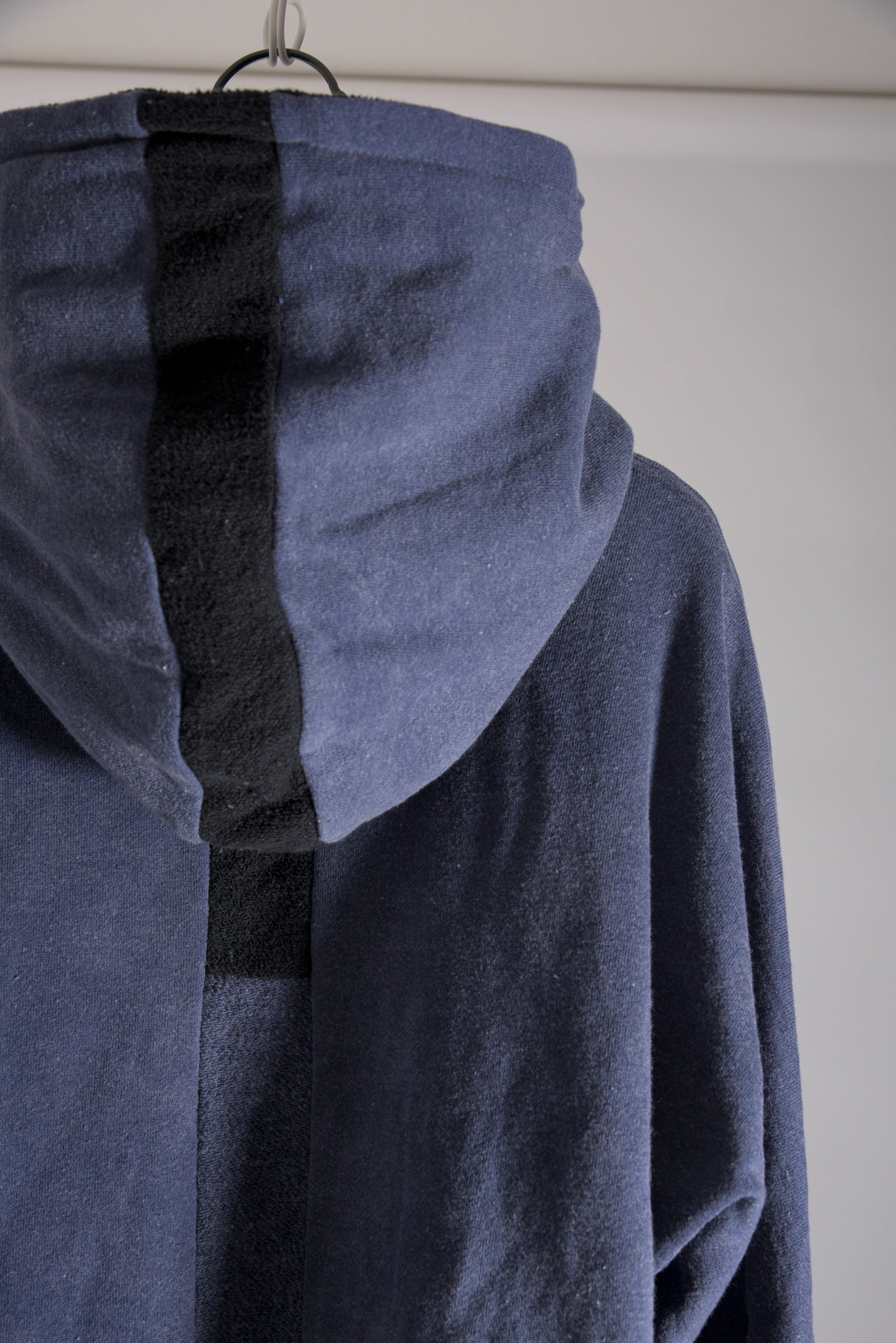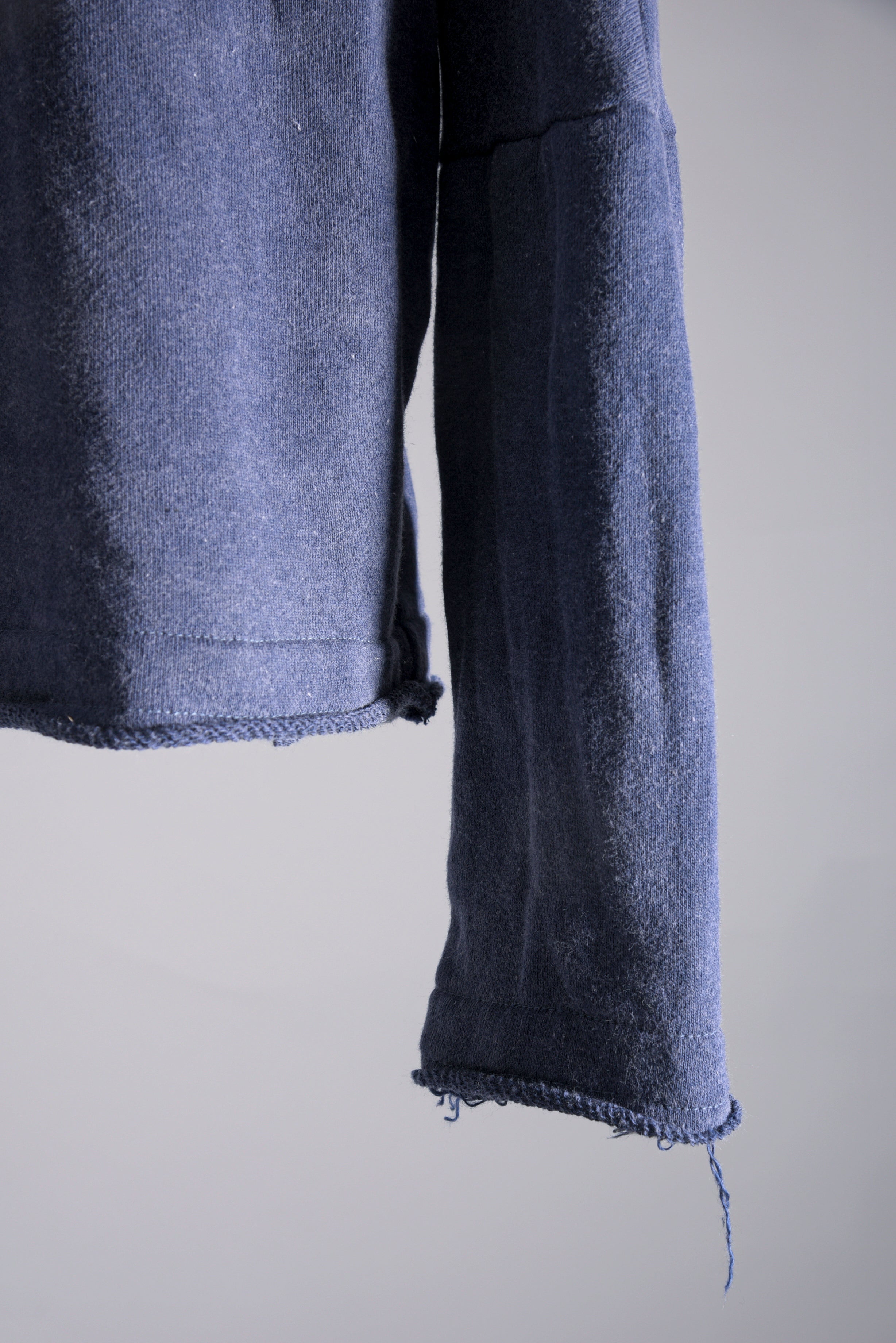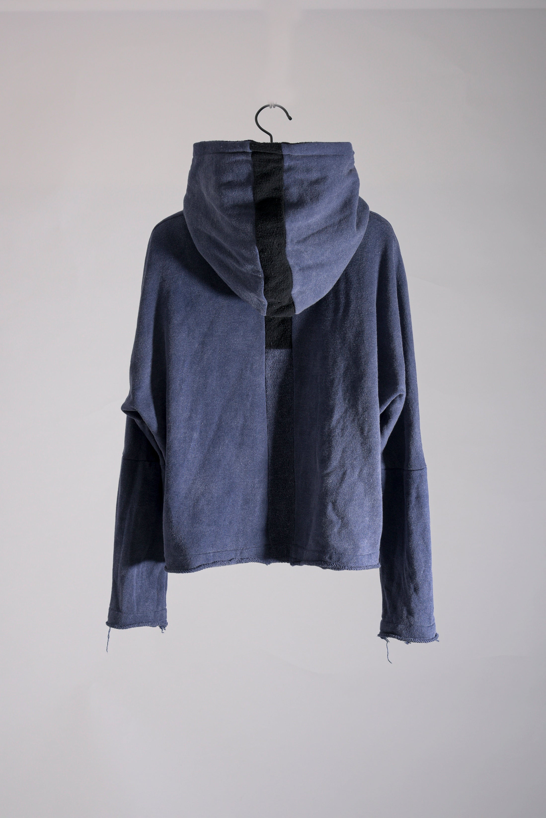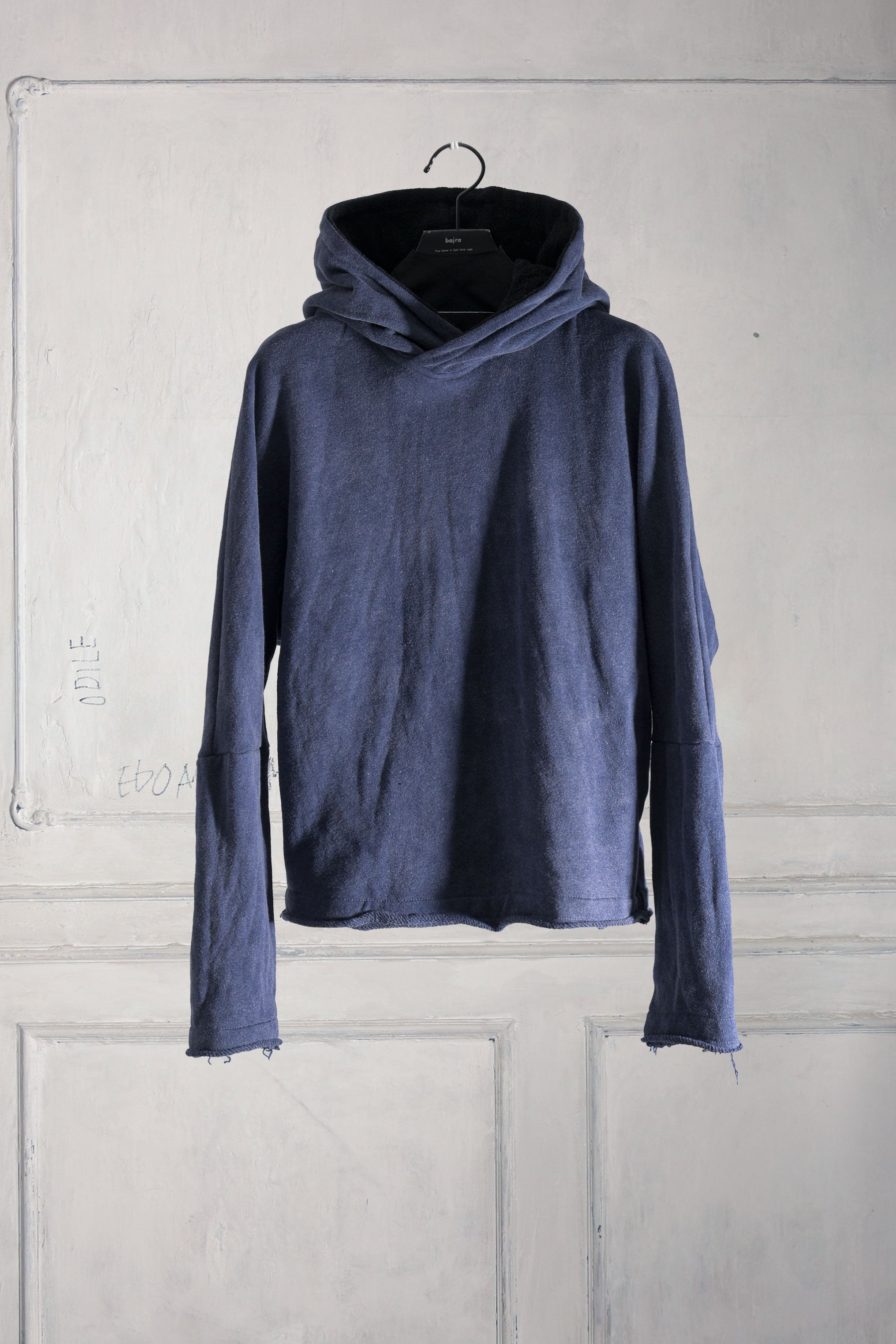 反応染料で染色をした後、脱色加工をすることにより色落ち、色ムラ感、シワ感を出したコットン裏毛のフーデッドプルオーバーです。断ち切り始末などのディティールにより製品洗いの風合いも程よく表現されています。A色はブラック単色です。