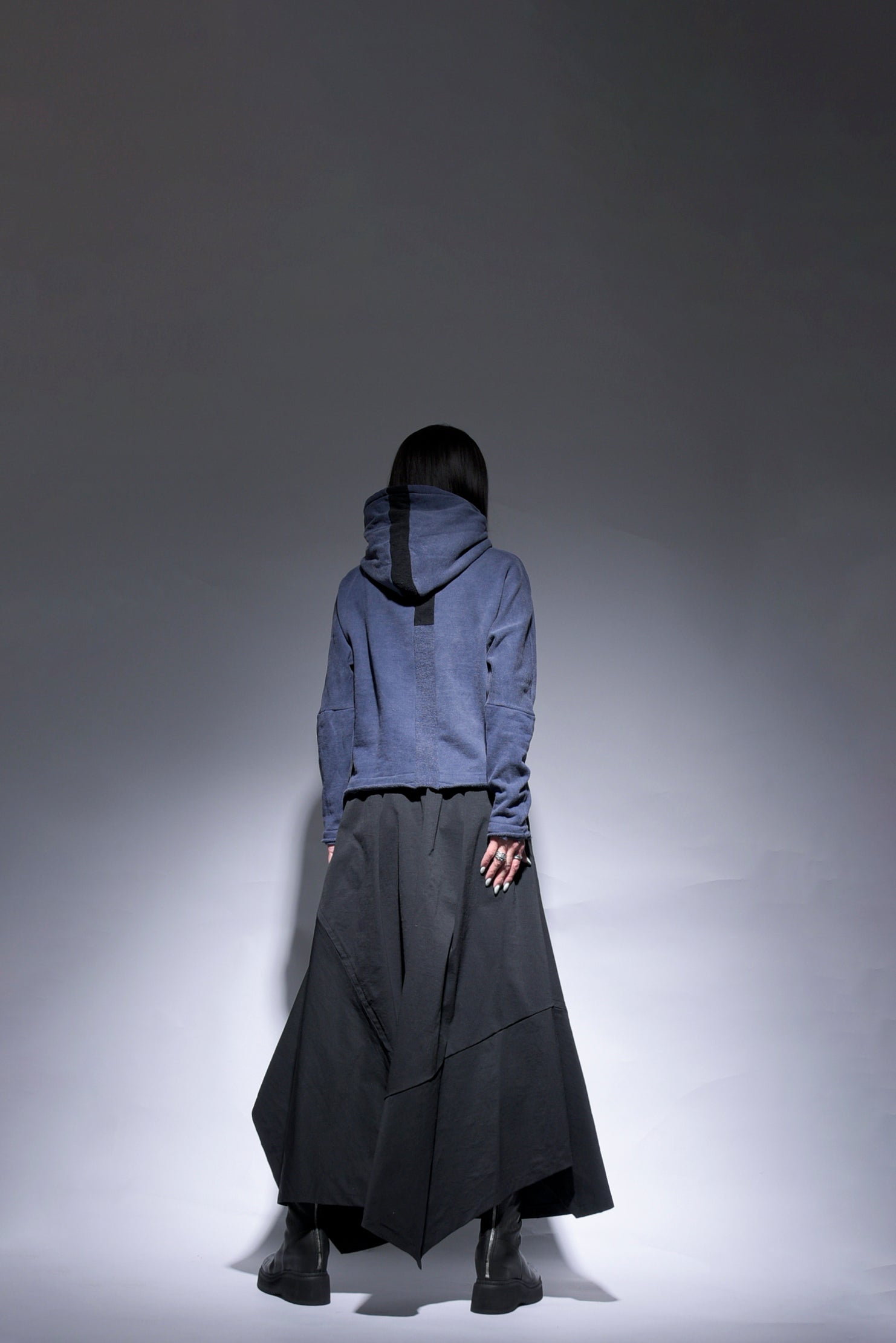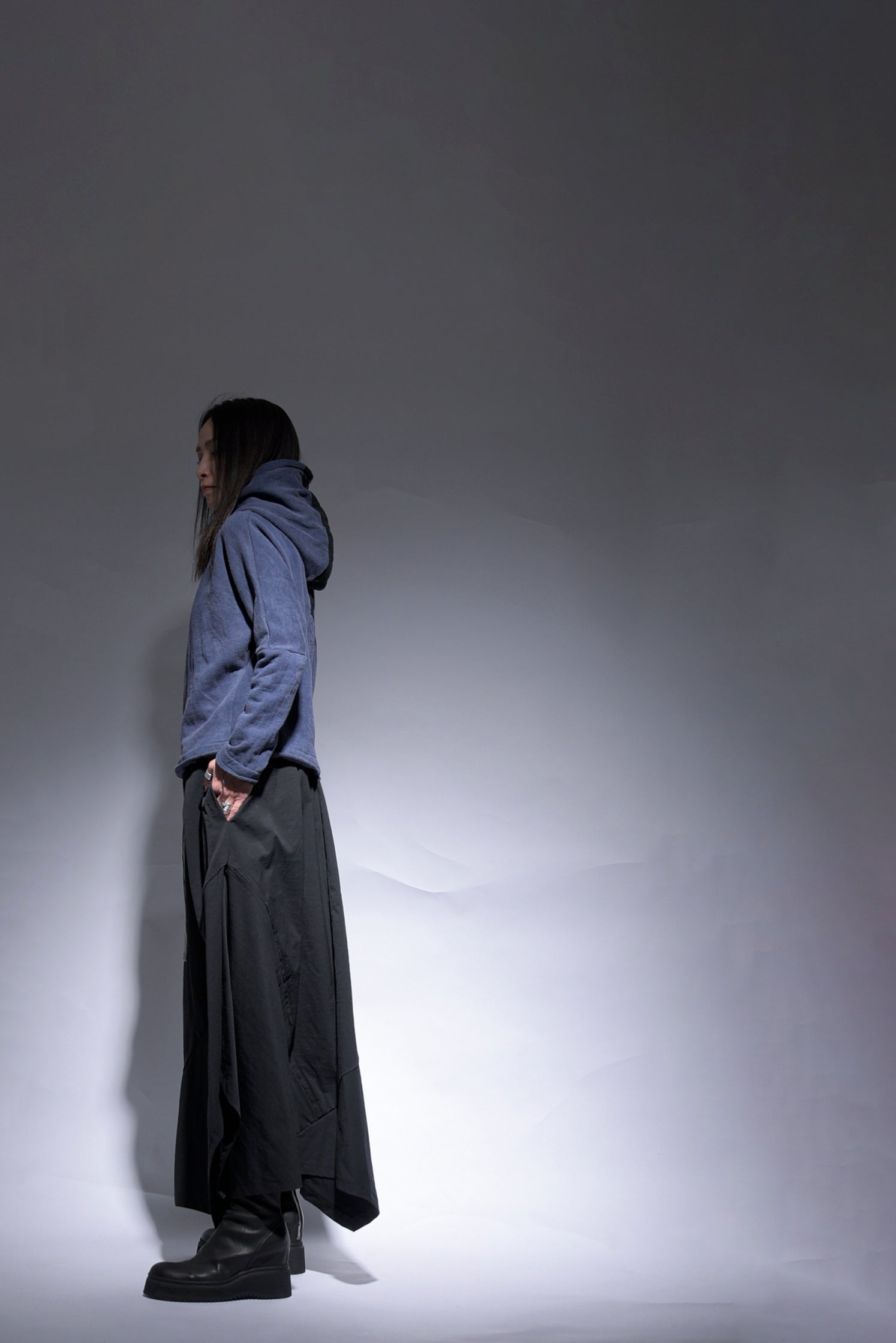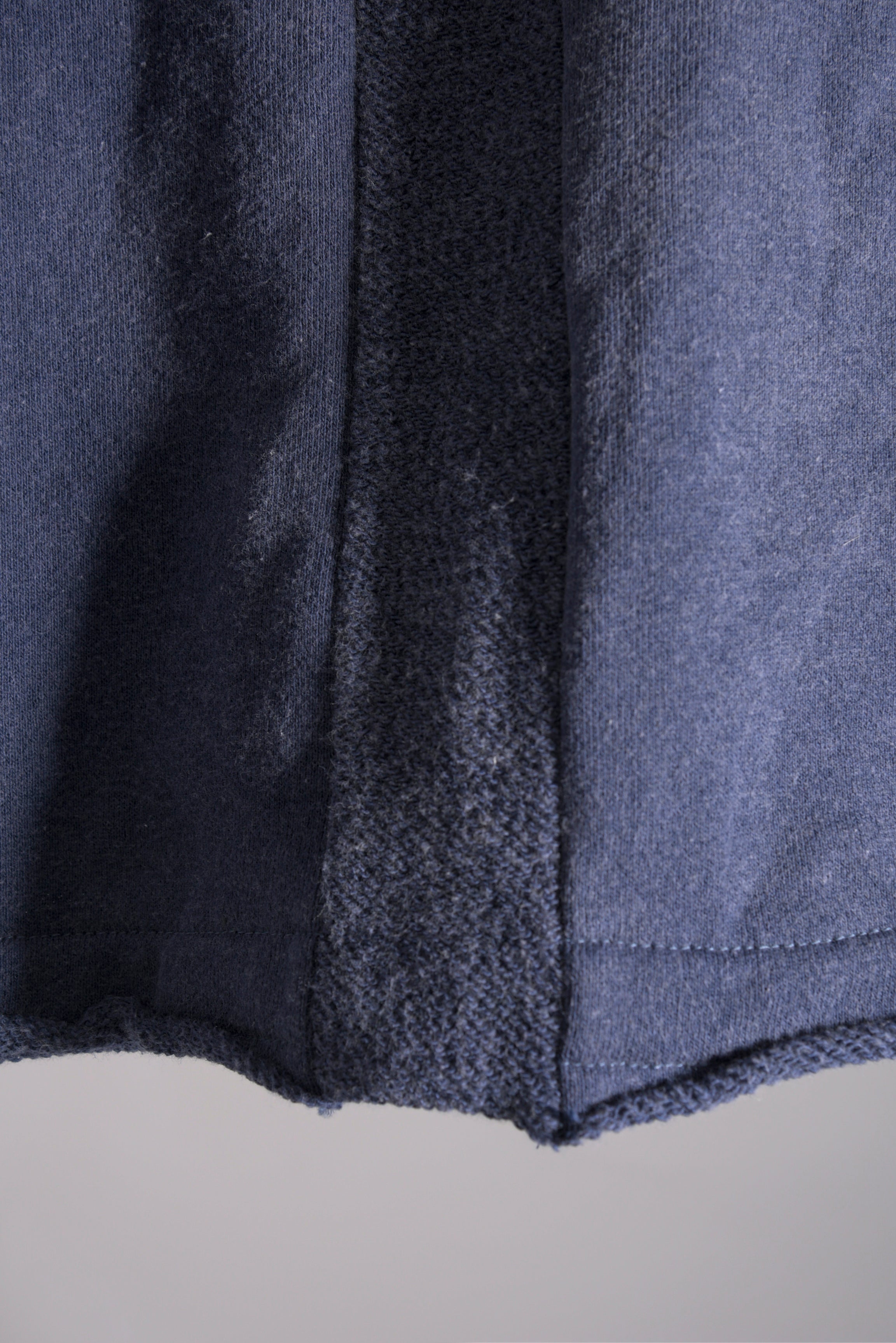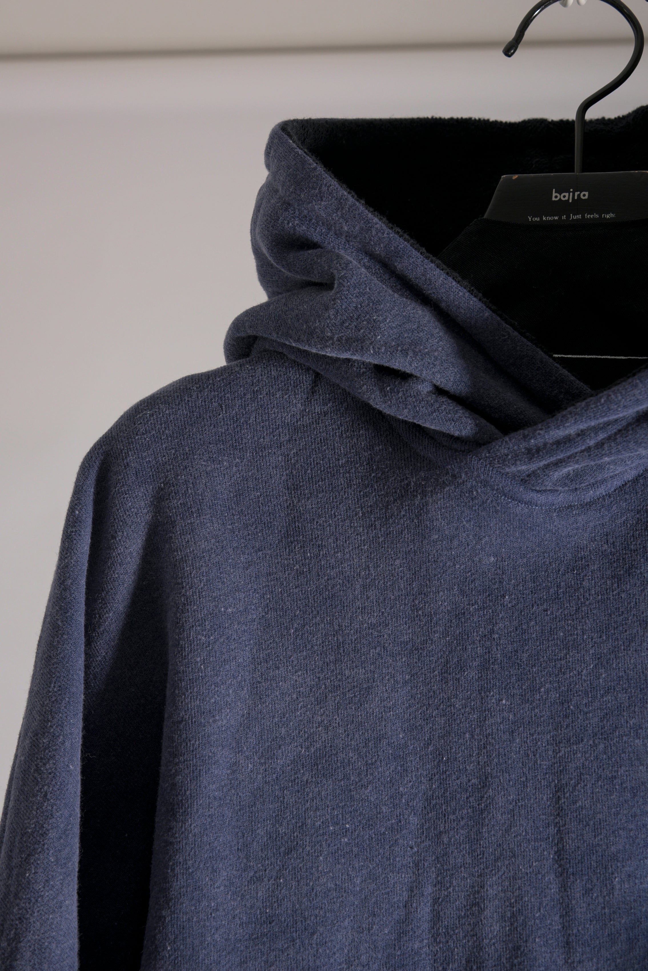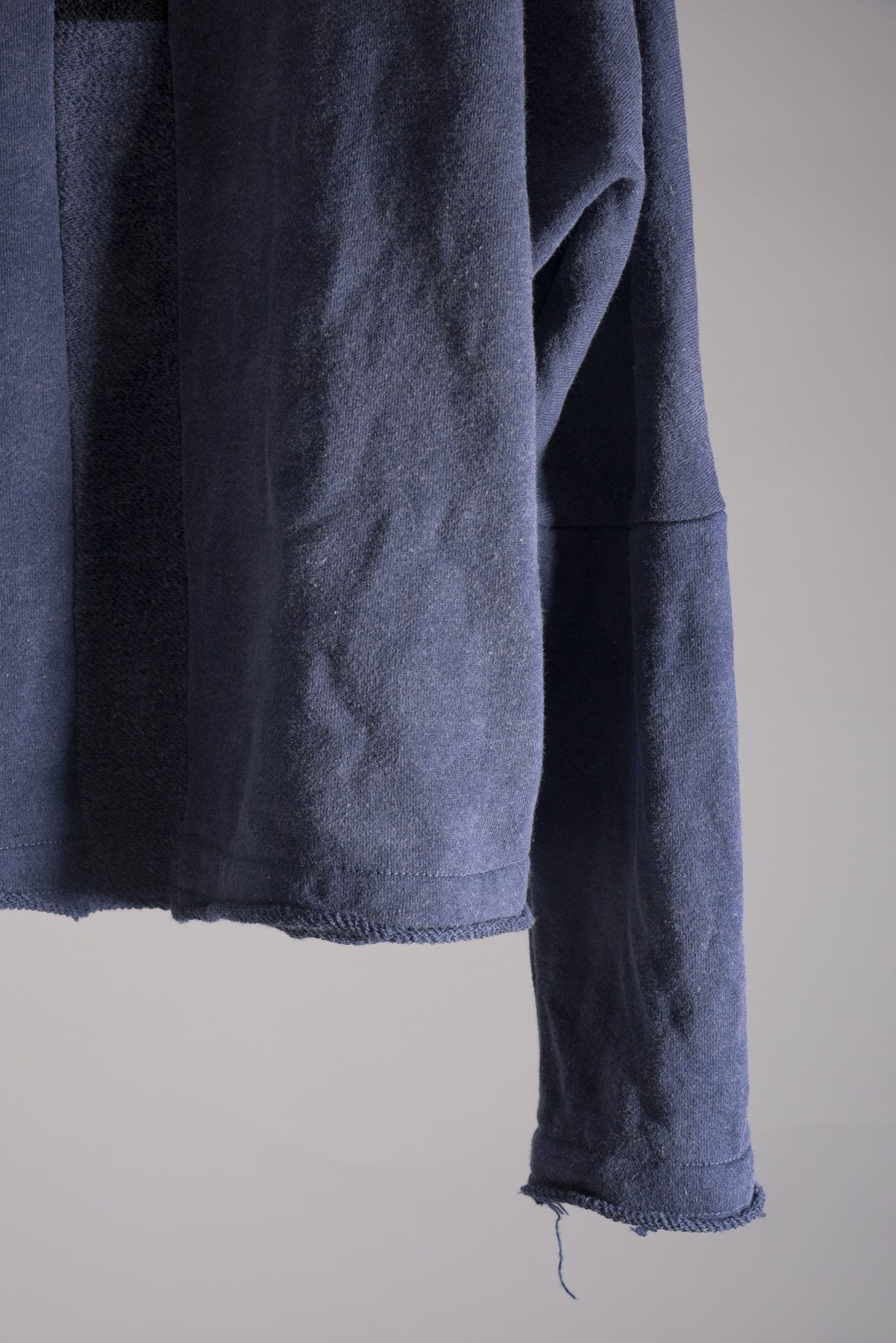 反応染料で染色をした後、脱色加工をすることにより色落ち、色ムラ感、シワ感を出したコットン裏毛のフーデッドプルオーバーです。断ち切り始末などのディティールにより製品洗いの風合いも程よく表現されています。A色はブラック単色です。