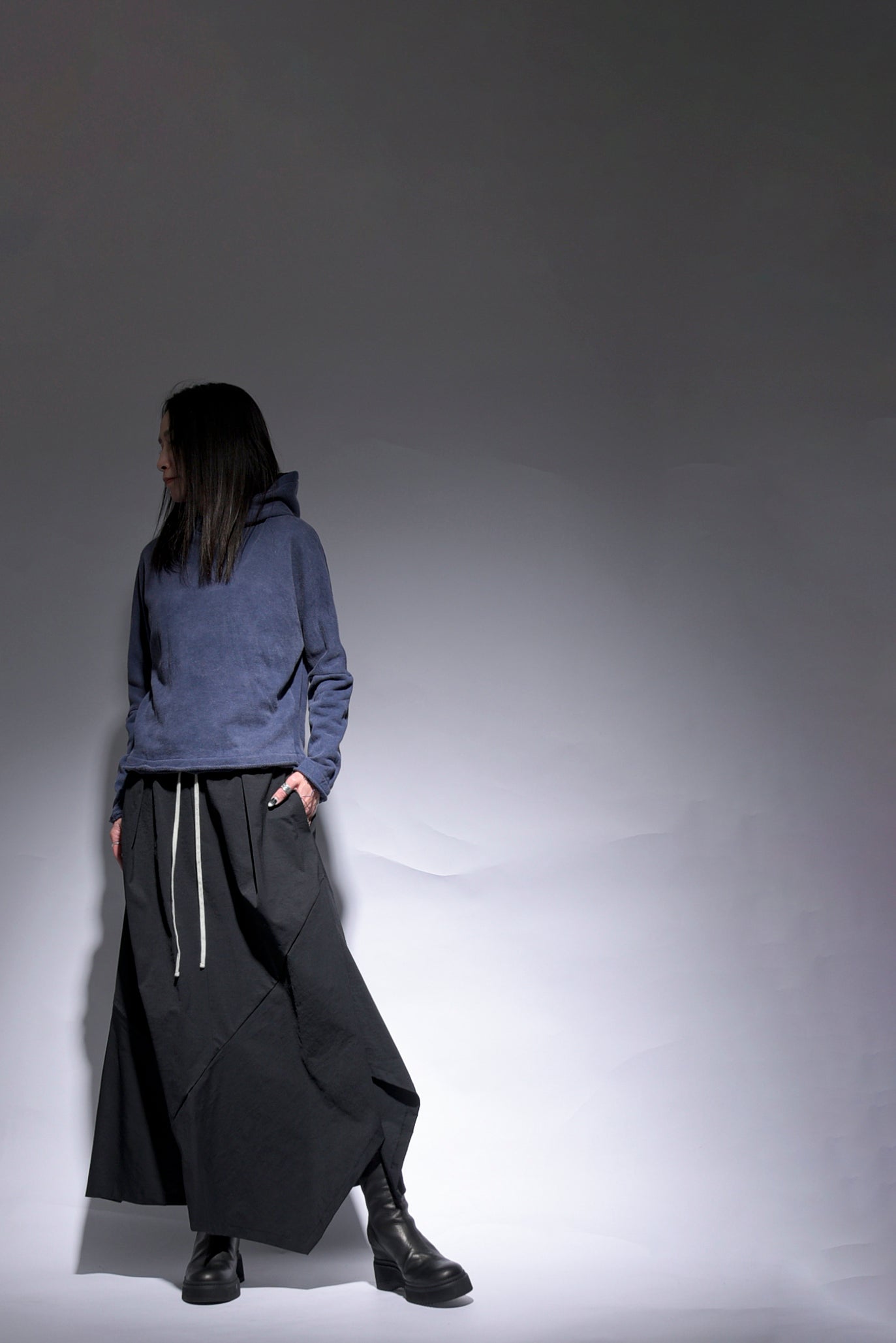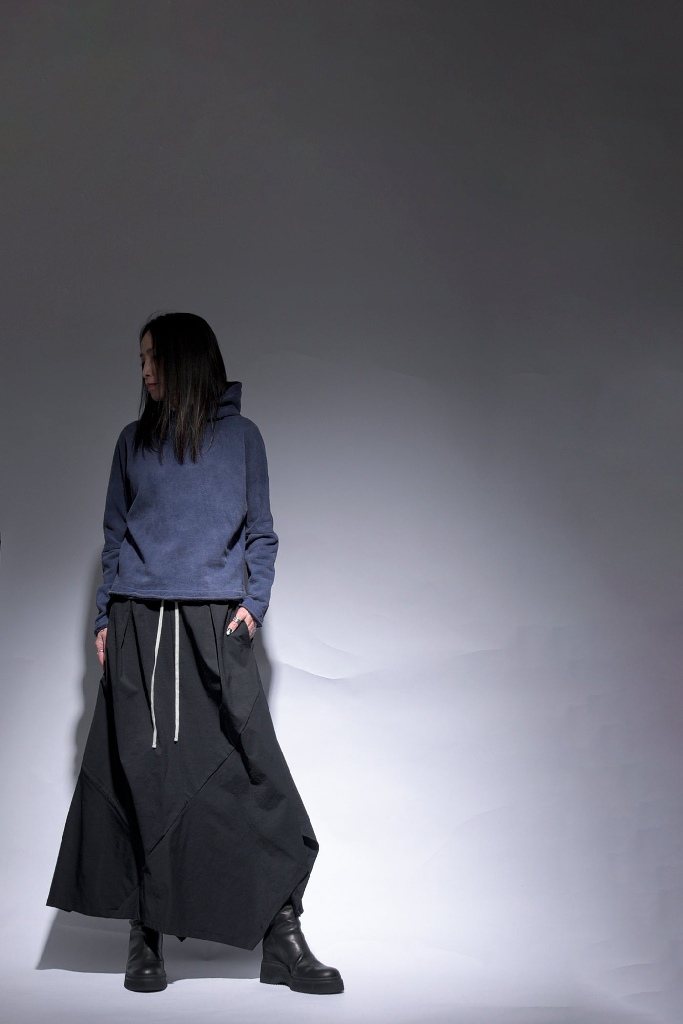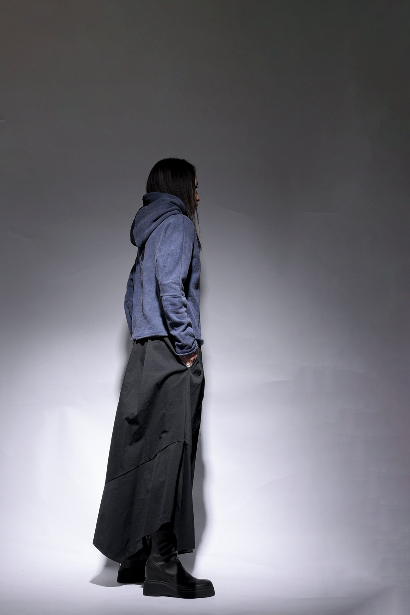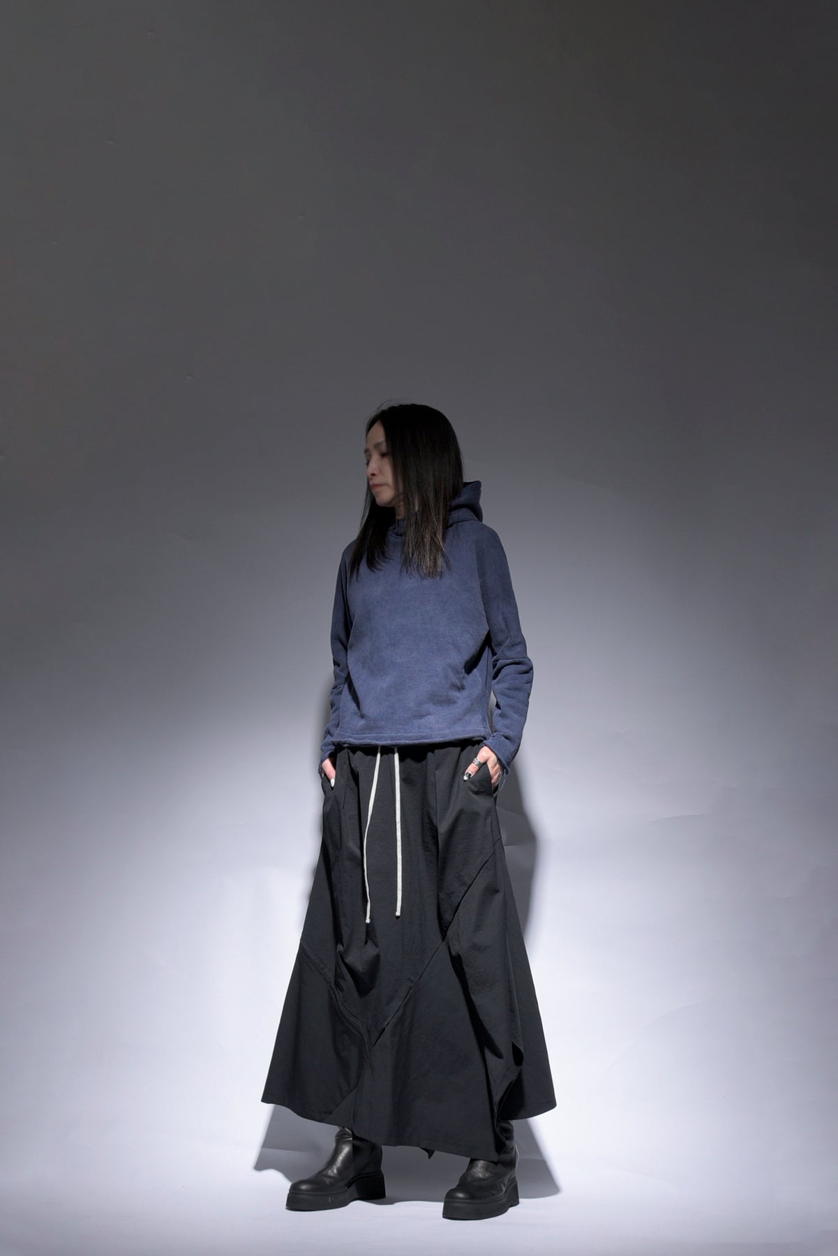 反応染料で染色をした後、脱色加工をすることにより色落ち、色ムラ感、シワ感を出したコットン裏毛のフーデッドプルオーバーです。断ち切り始末などのディティールにより製品洗いの風合いも程よく表現されています。A色はブラック単色です。