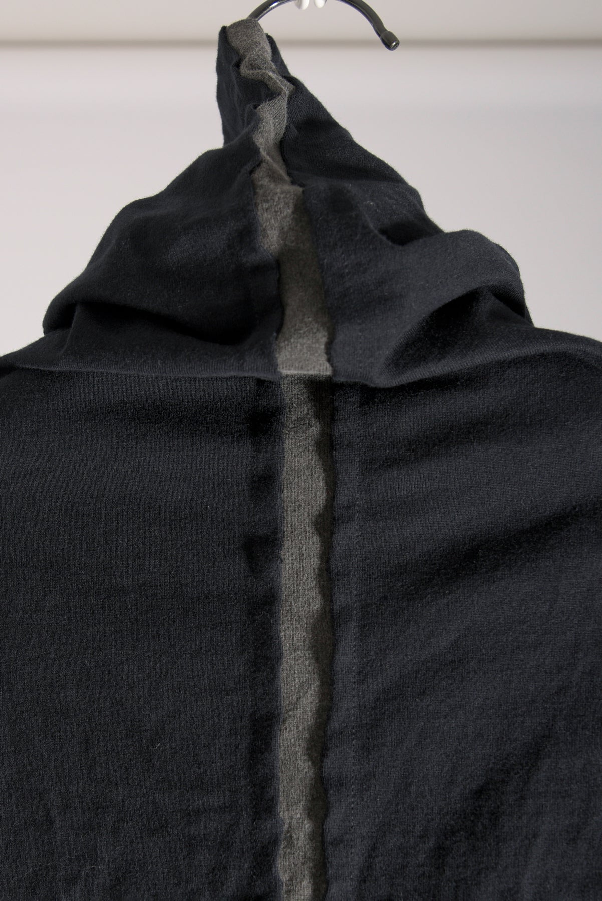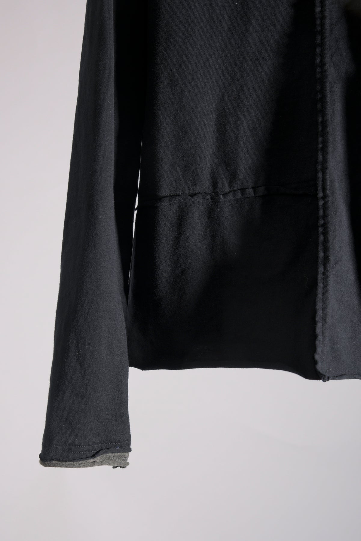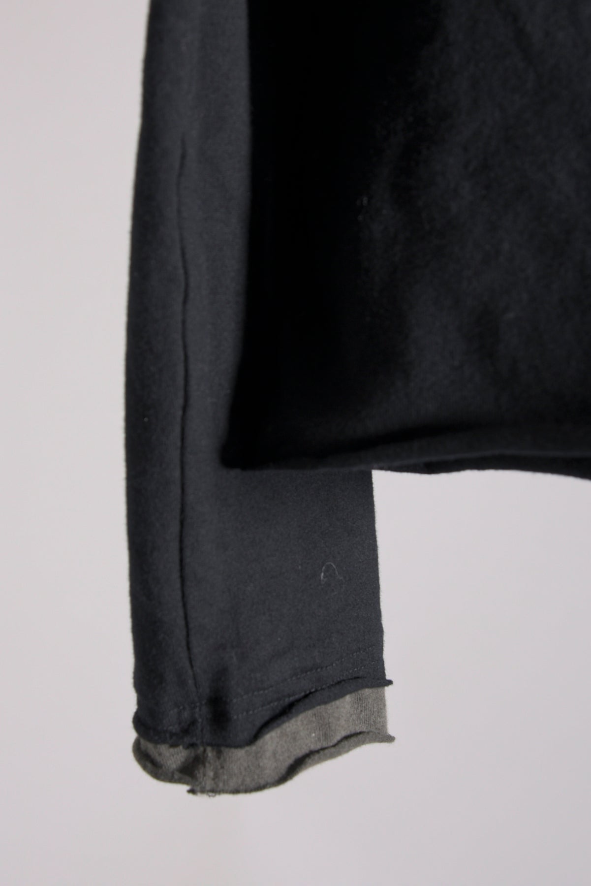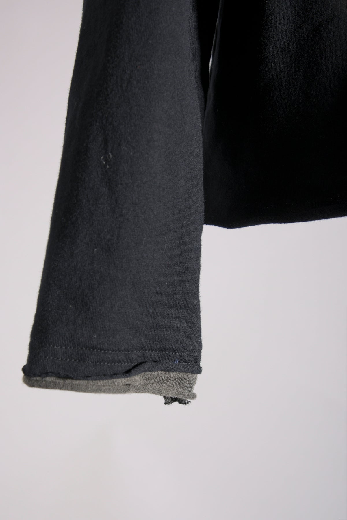 反応染料で染色をした後、脱色加工をすることにより色落ち、色ムラ感、シワ感を出したコットン天竺のプルオーバーです。断ち切り始末などのディティールにより製品洗いの風合いも程よく表現されています。インナーにもお勧めです◎ A色はブラック単色です。