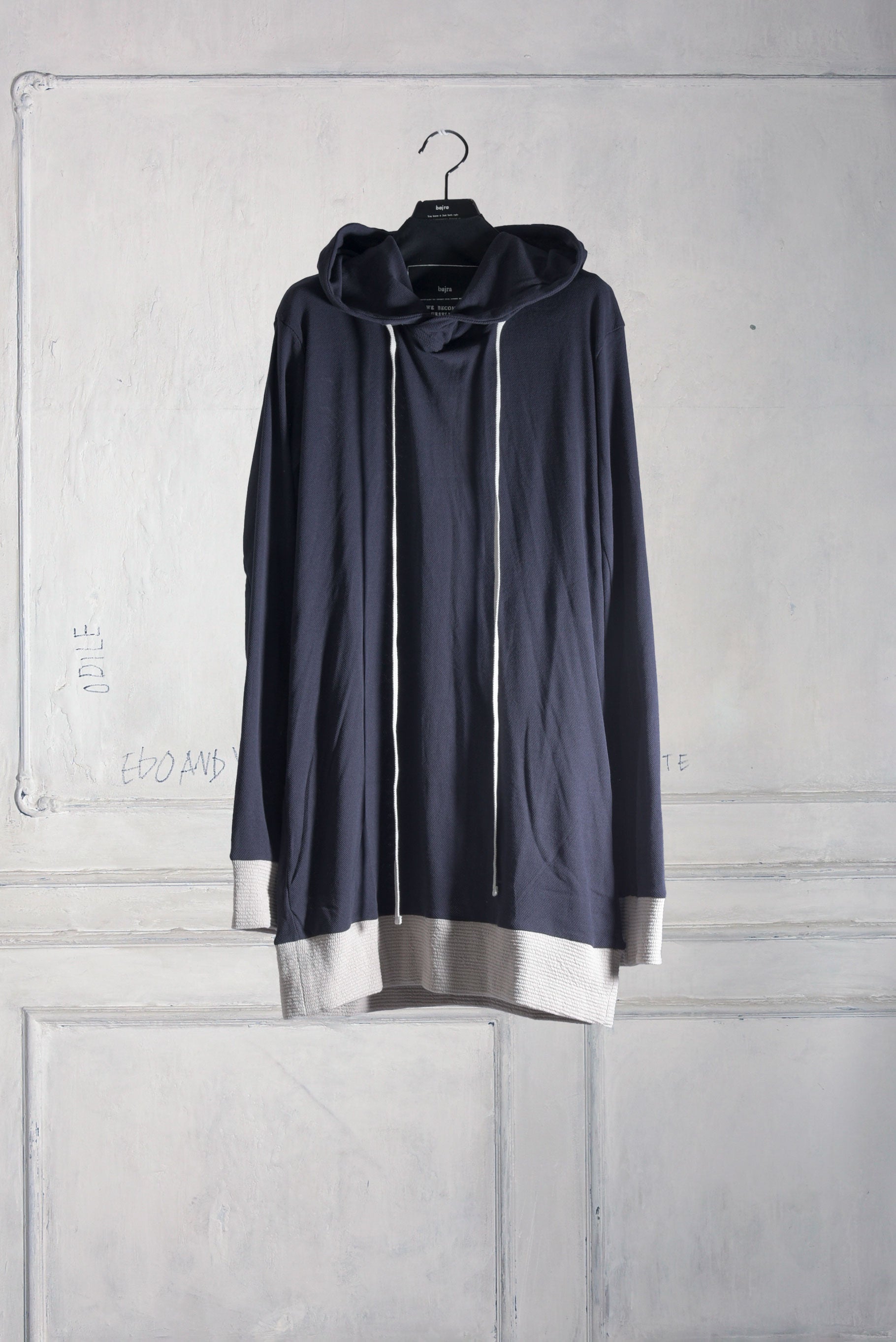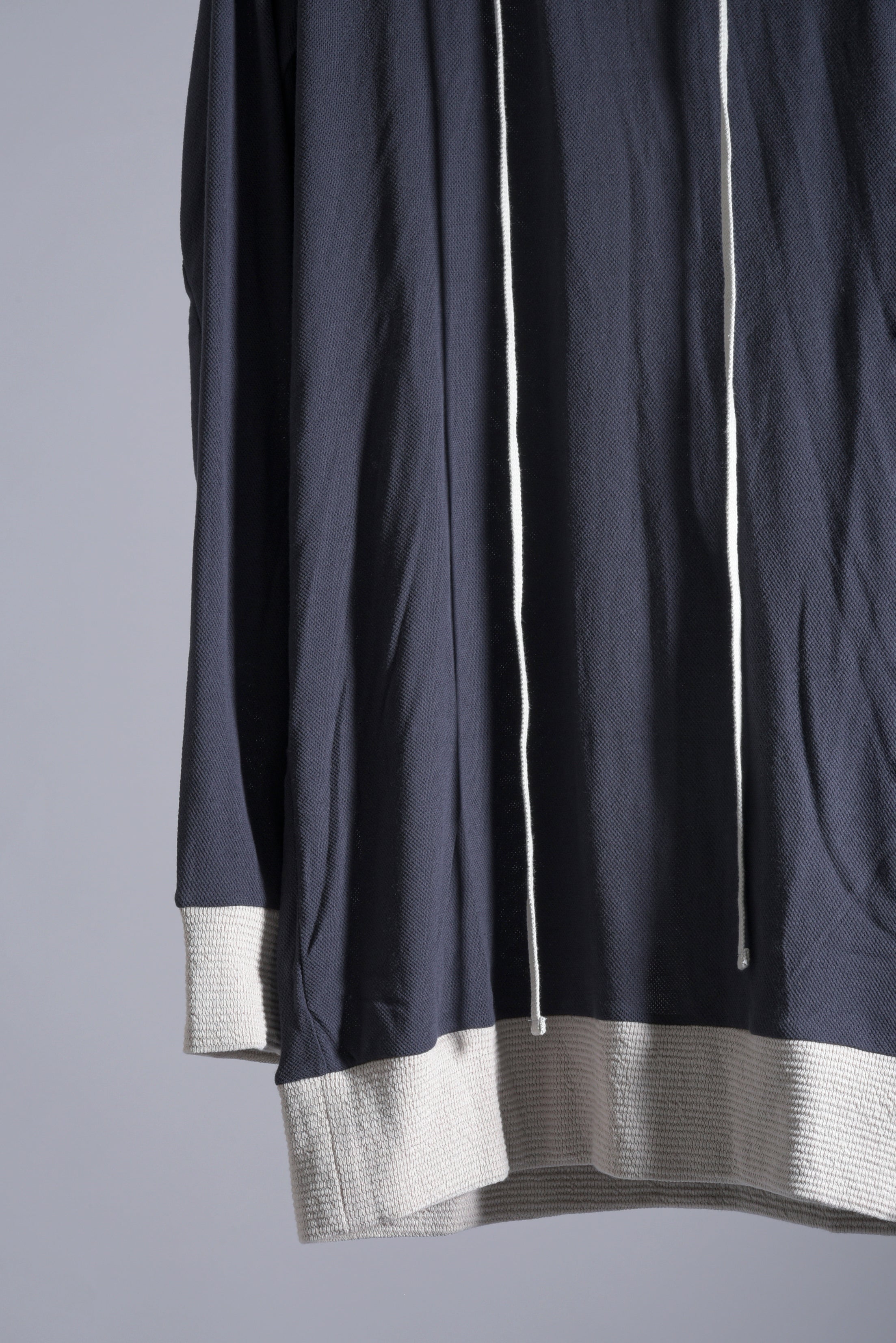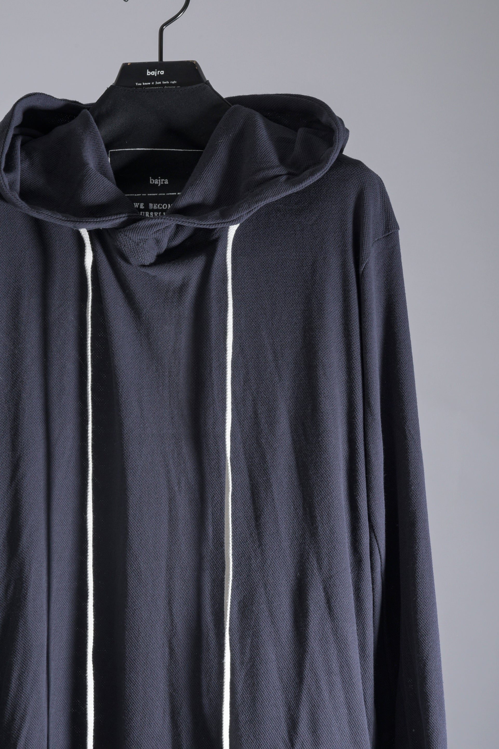 強撚糸で編み上げた優れたキックバック性のコットンメッシュのフーディーです。メッシュの持つ通気性と上質なコットンのさらりとした素材感がとても気持ちの良い1着。後ろ中心のラインと裾、袖口の異素材掛け合わせがbajraらしさを引き立てています。