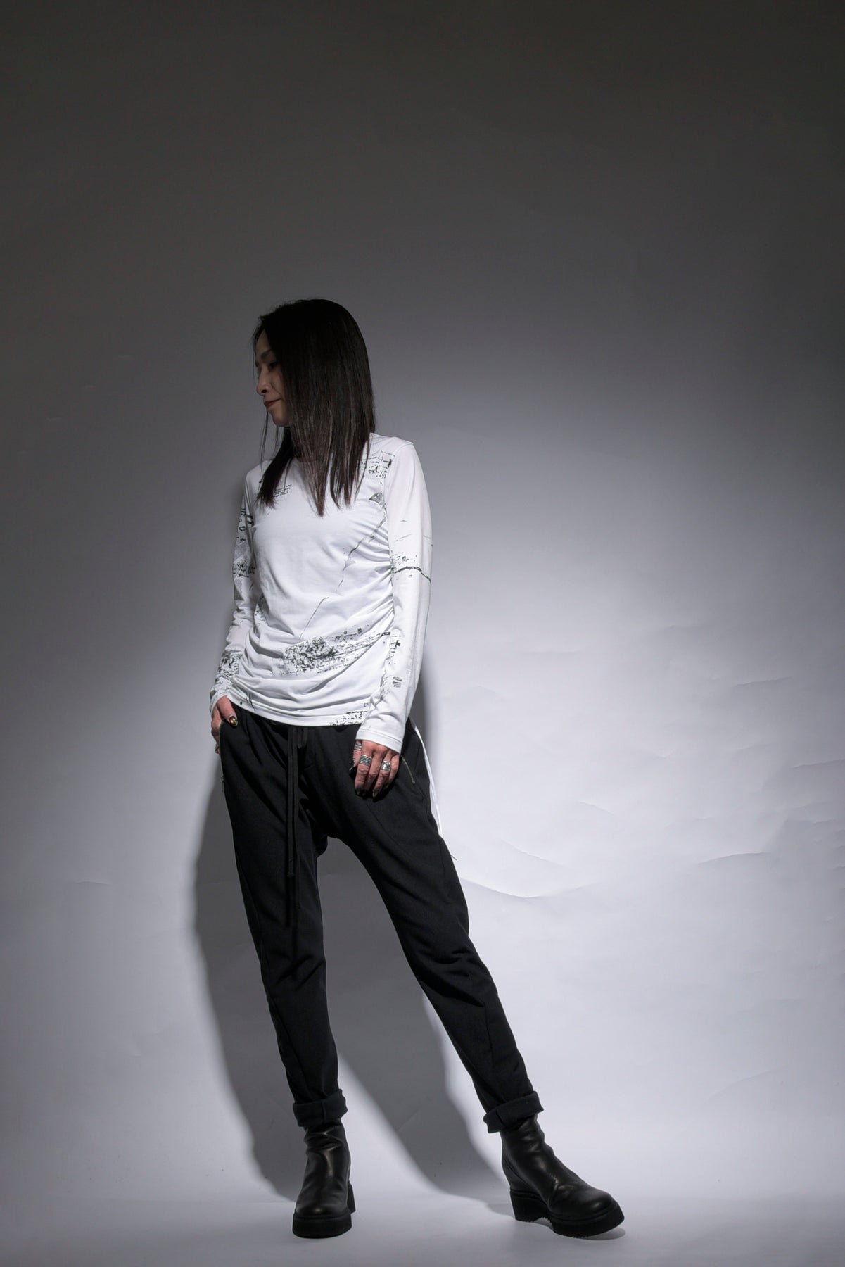 左脇には紐を通してありますのでコーディネートによって着丈のバランスを調整することが可能です。同シリーズで半袖も展開しています。(半袖は紐は通していません。)