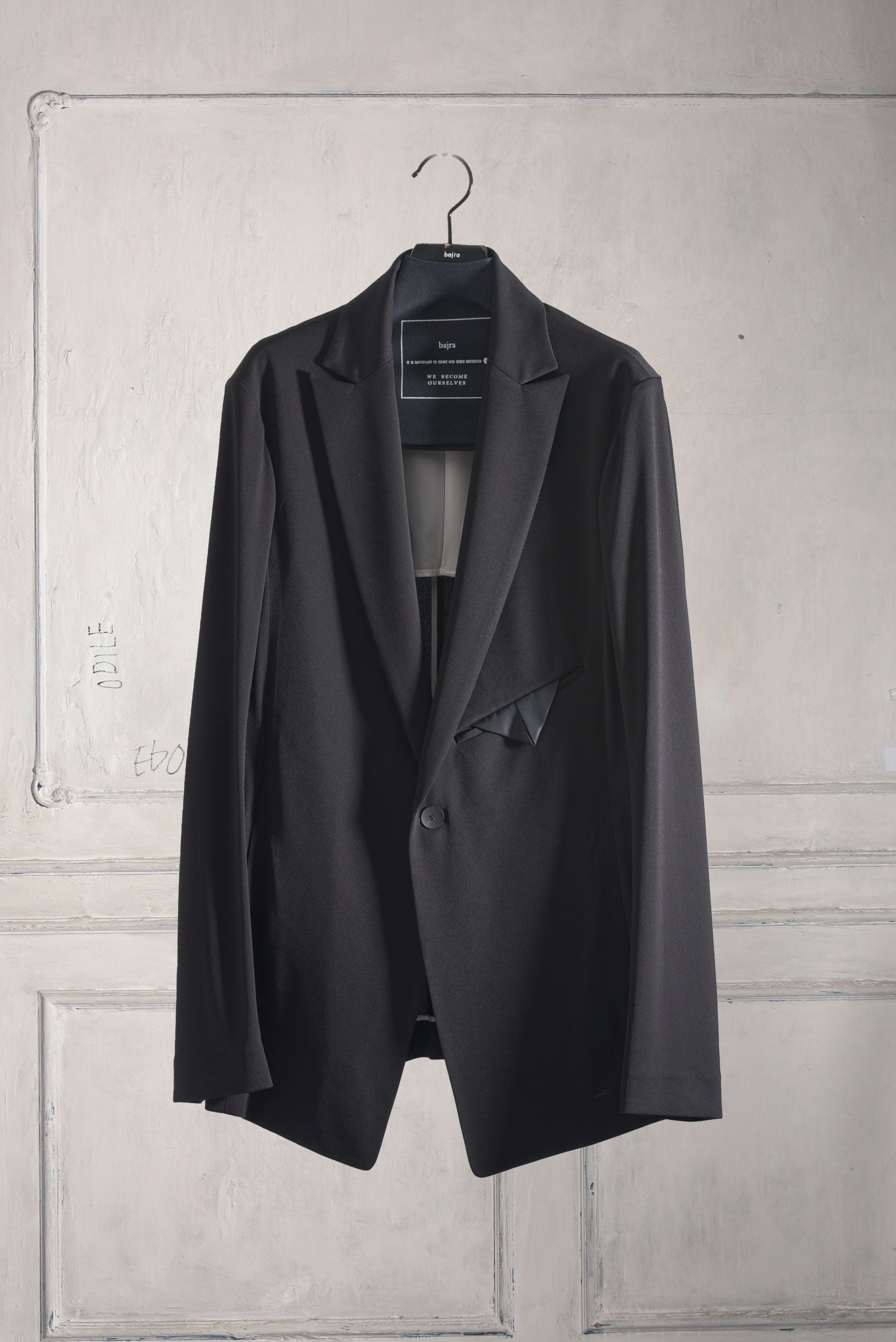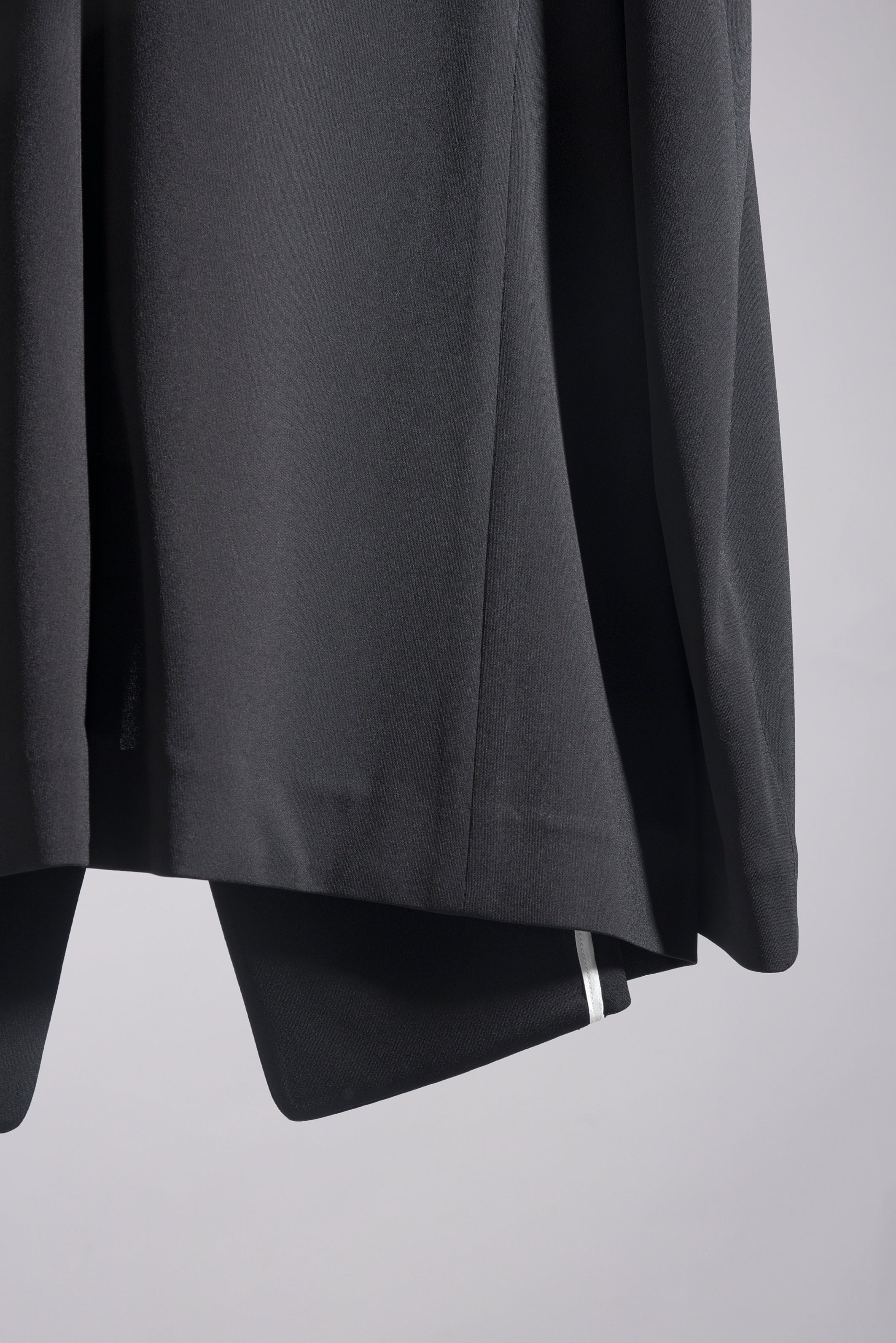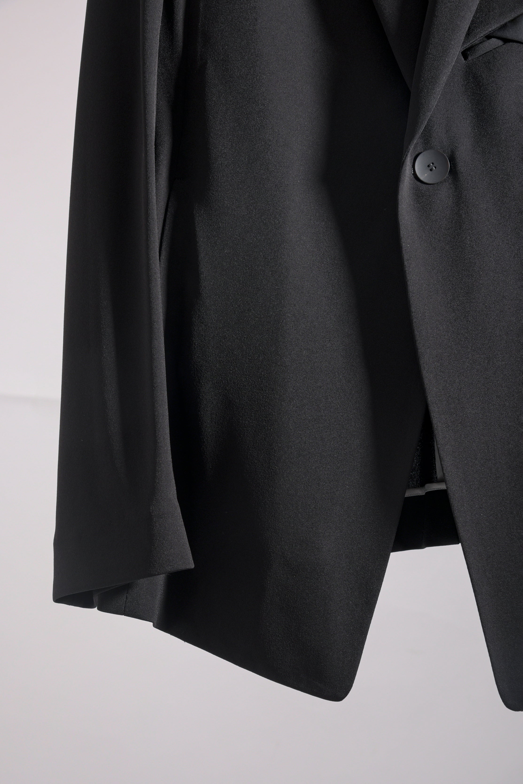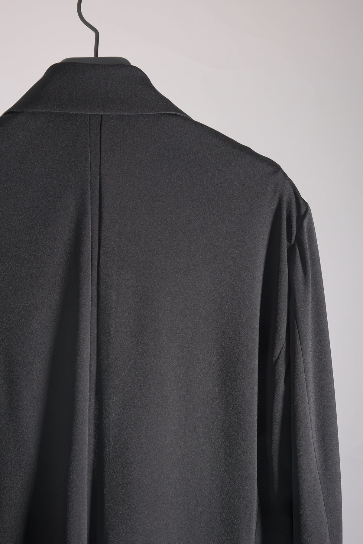 トリアセテートの強撚スムースをハイゲージで編み立てたストレスフリーのbajraレギュラー商品のジャケット。後身ベンツはフックベンツ仕様で抜け感のあるフォーマルとしても使え、デイリーユース感の強い軽くソフトな羽織タイプのノーマル丈ジャケット。157BP01のパンツとセットアップとしても使えお勧めです。今回はサイズ2を着用しています。