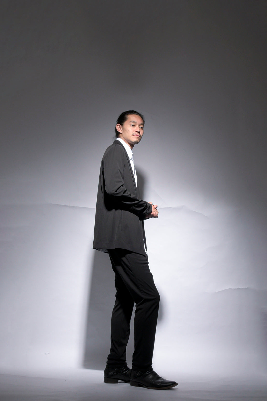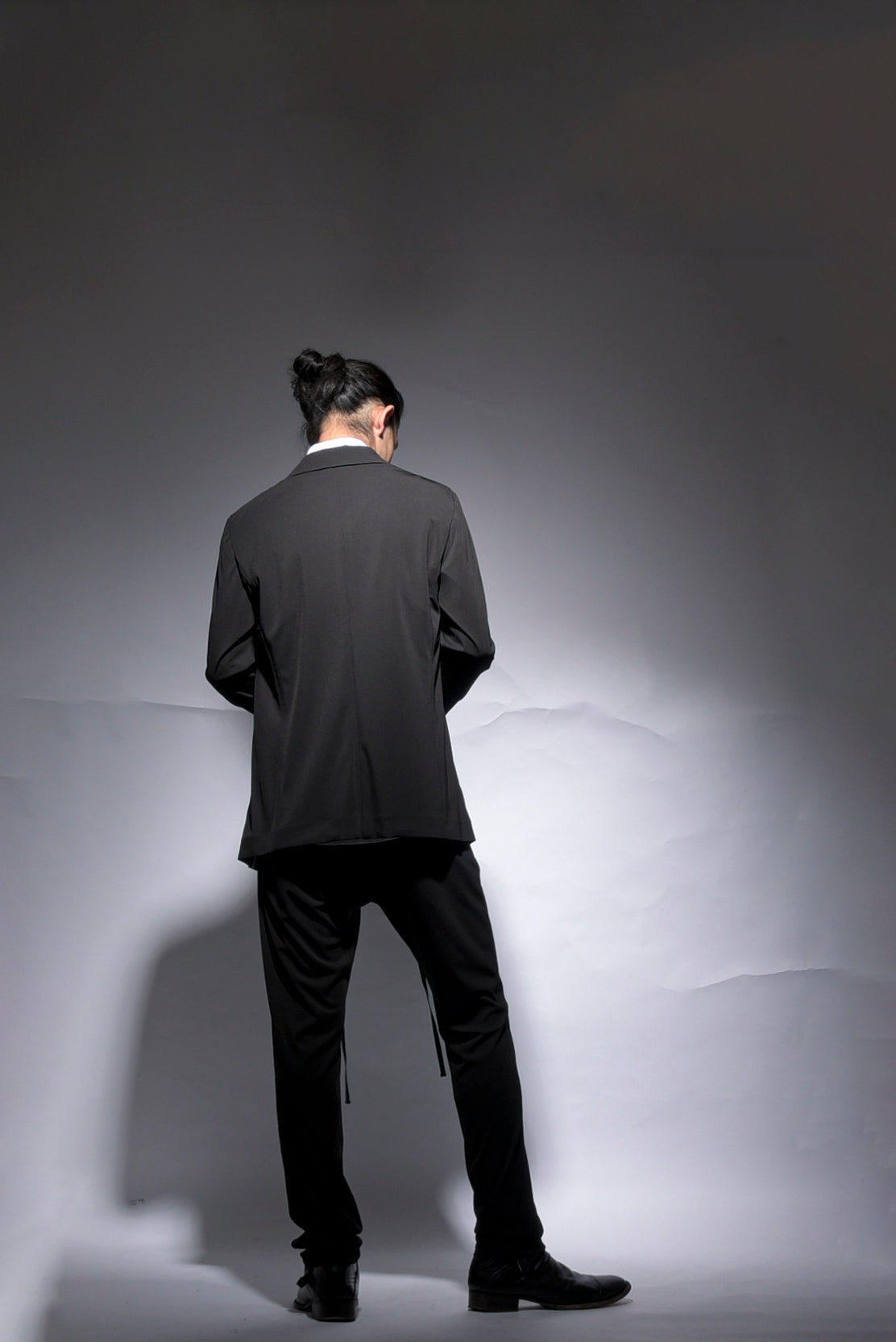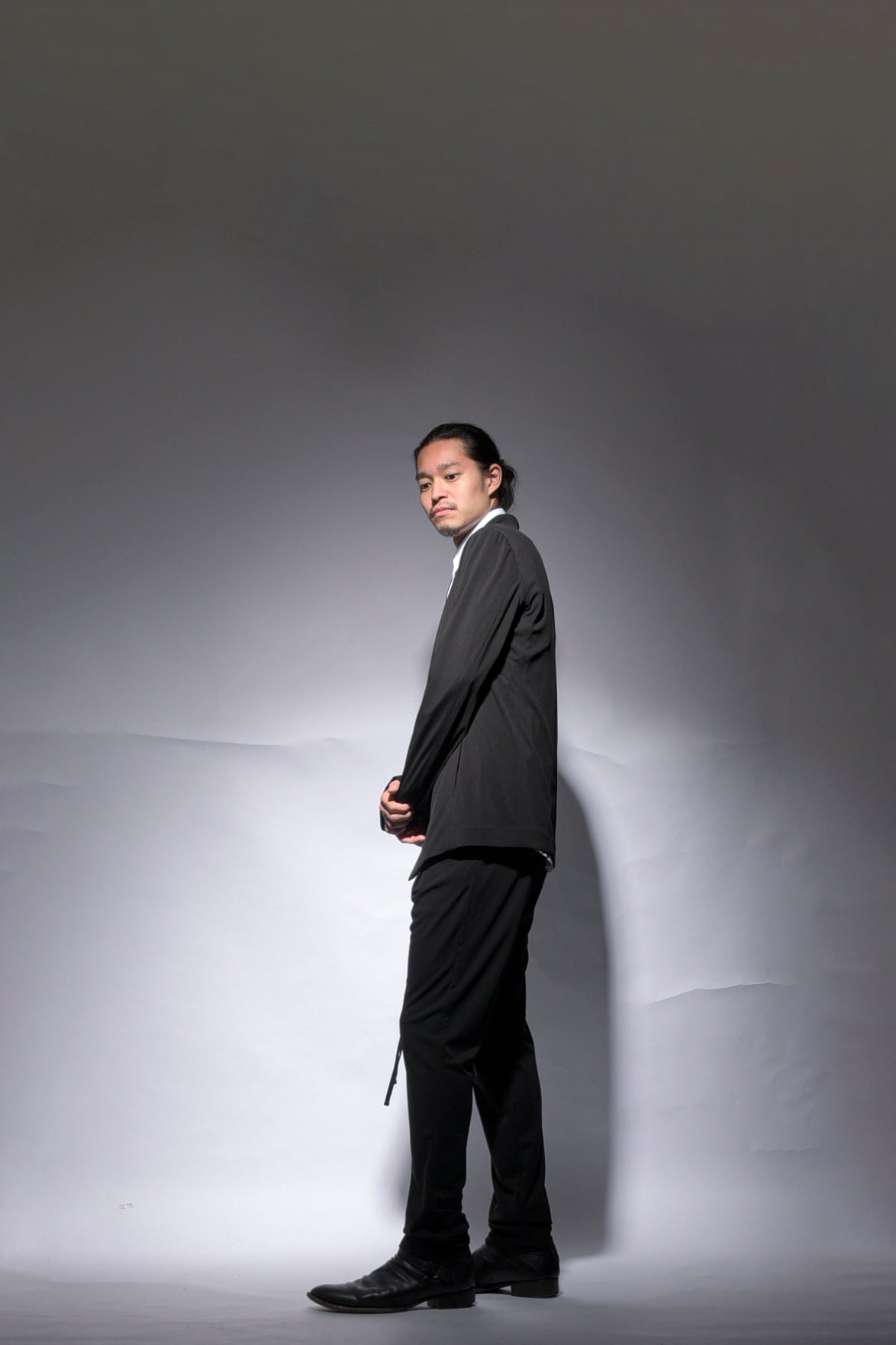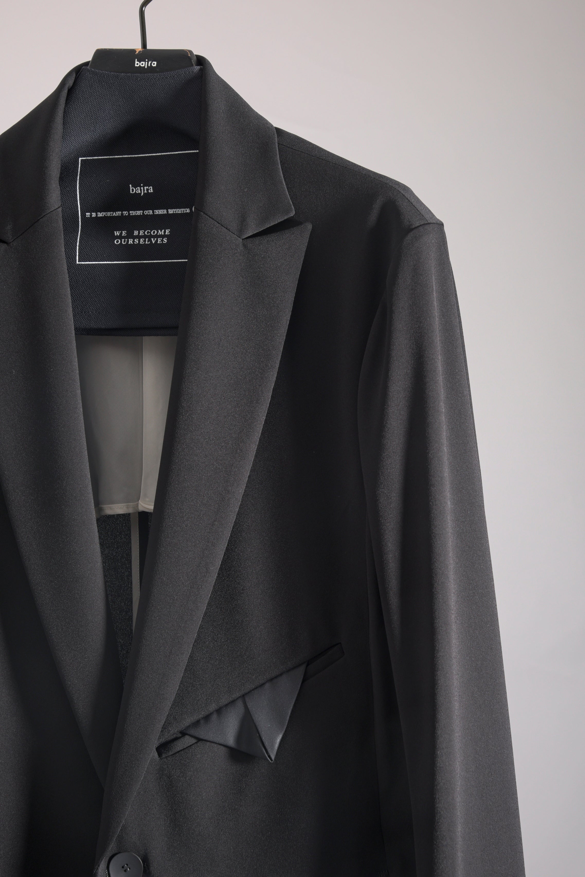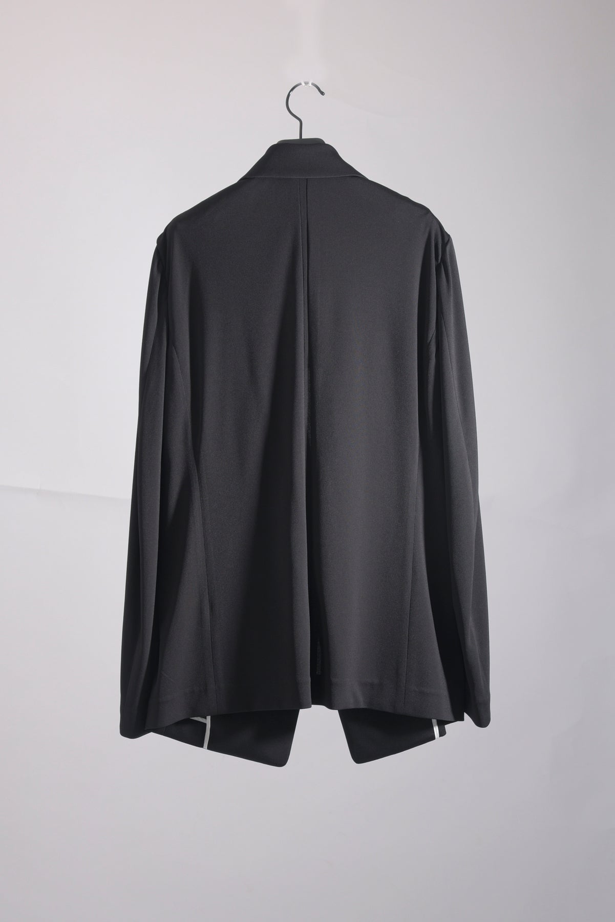 トリアセテートの強撚スムースをハイゲージで編み立てたストレスフリーのbajraレギュラー商品のジャケット。後身ベンツはフックベンツ仕様で抜け感のあるフォーマルとしても使え、デイリーユース感の強い軽くソフトな羽織タイプのノーマル丈ジャケット。157BP01のパンツとセットアップとしても使えお勧めです。今回はサイズ2を着用しています。