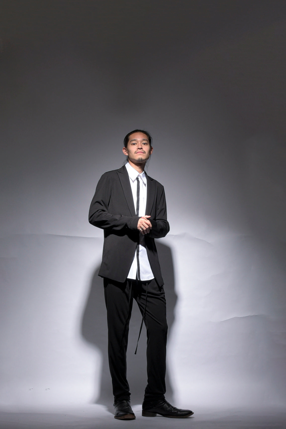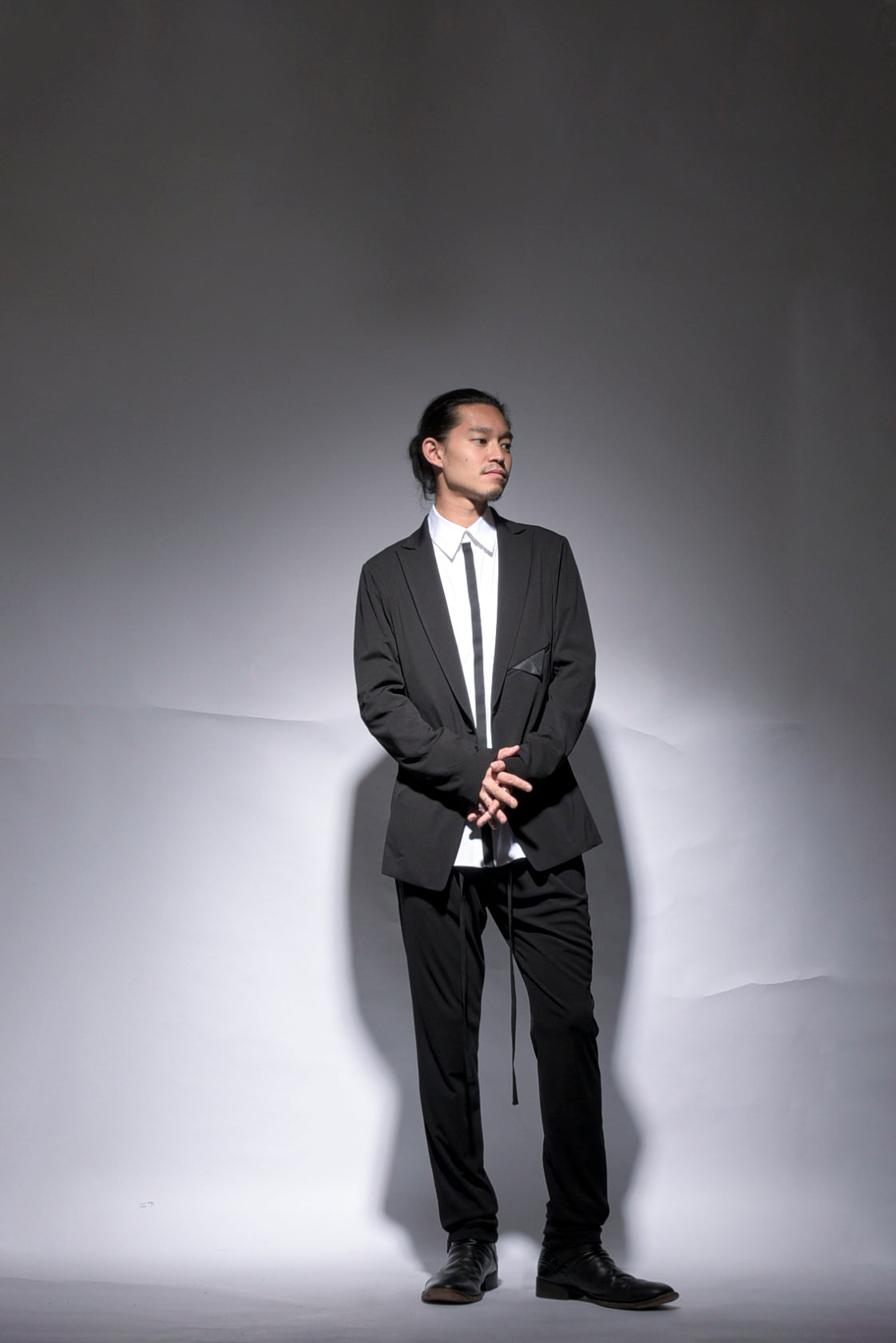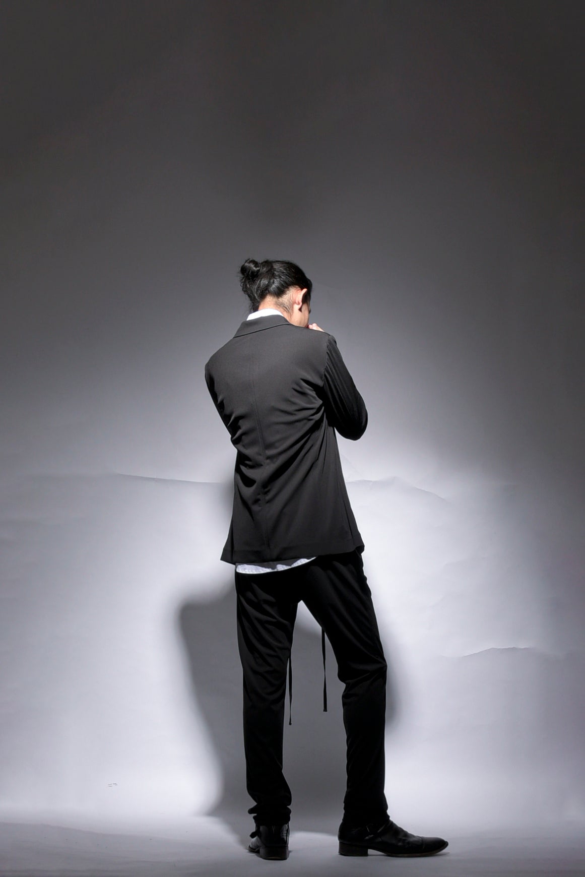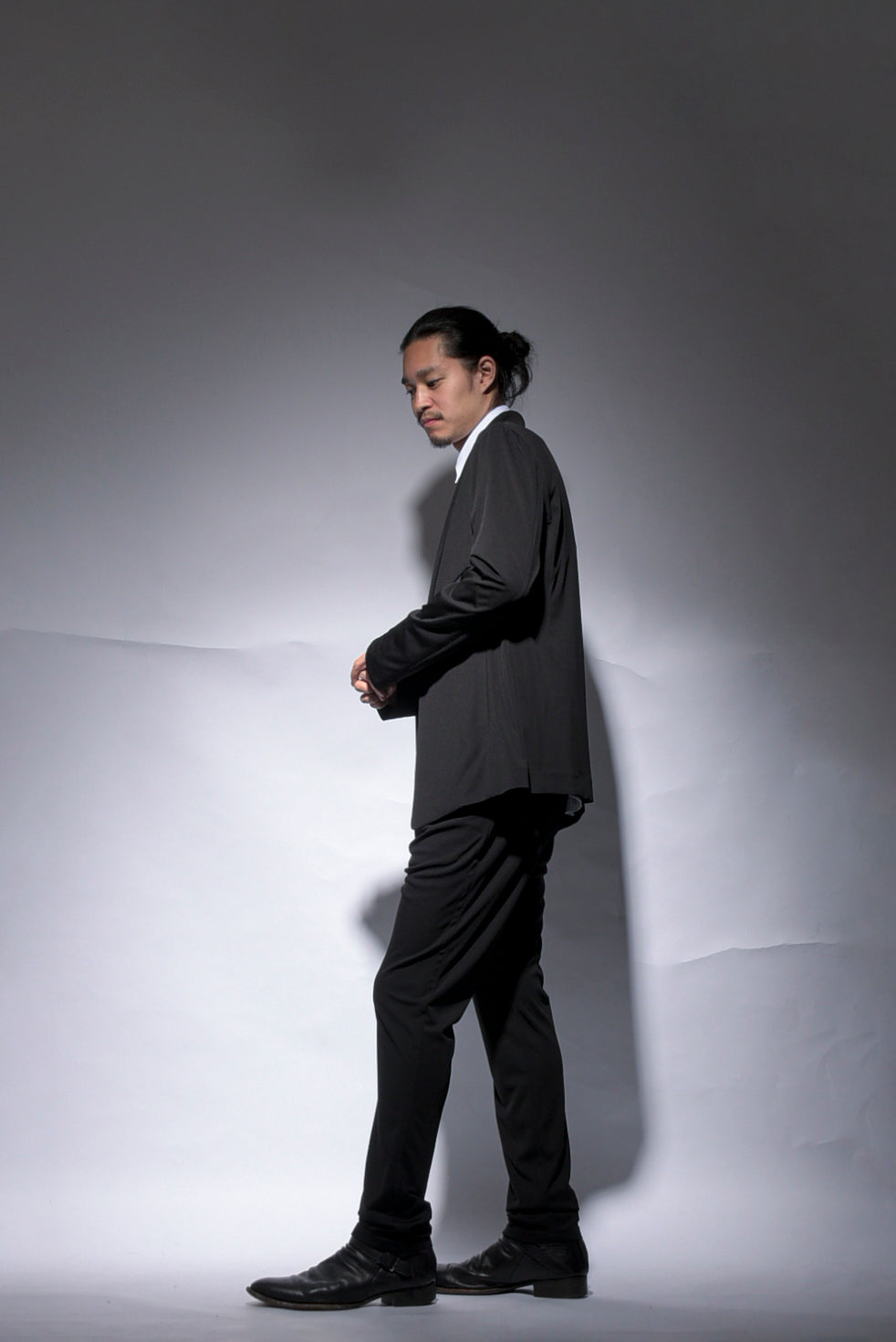 トリアセテートの強撚スムースをハイゲージで編み立てたストレスフリーのbajraレギュラー商品のジャケット。後身ベンツはフックベンツ仕様で抜け感のあるフォーマルとしても使え、デイリーユース感の強い軽くソフトな羽織タイプのノーマル丈ジャケット。157BP01のパンツとセットアップとしても使えお勧めです。今回はサイズ2を着用しています。