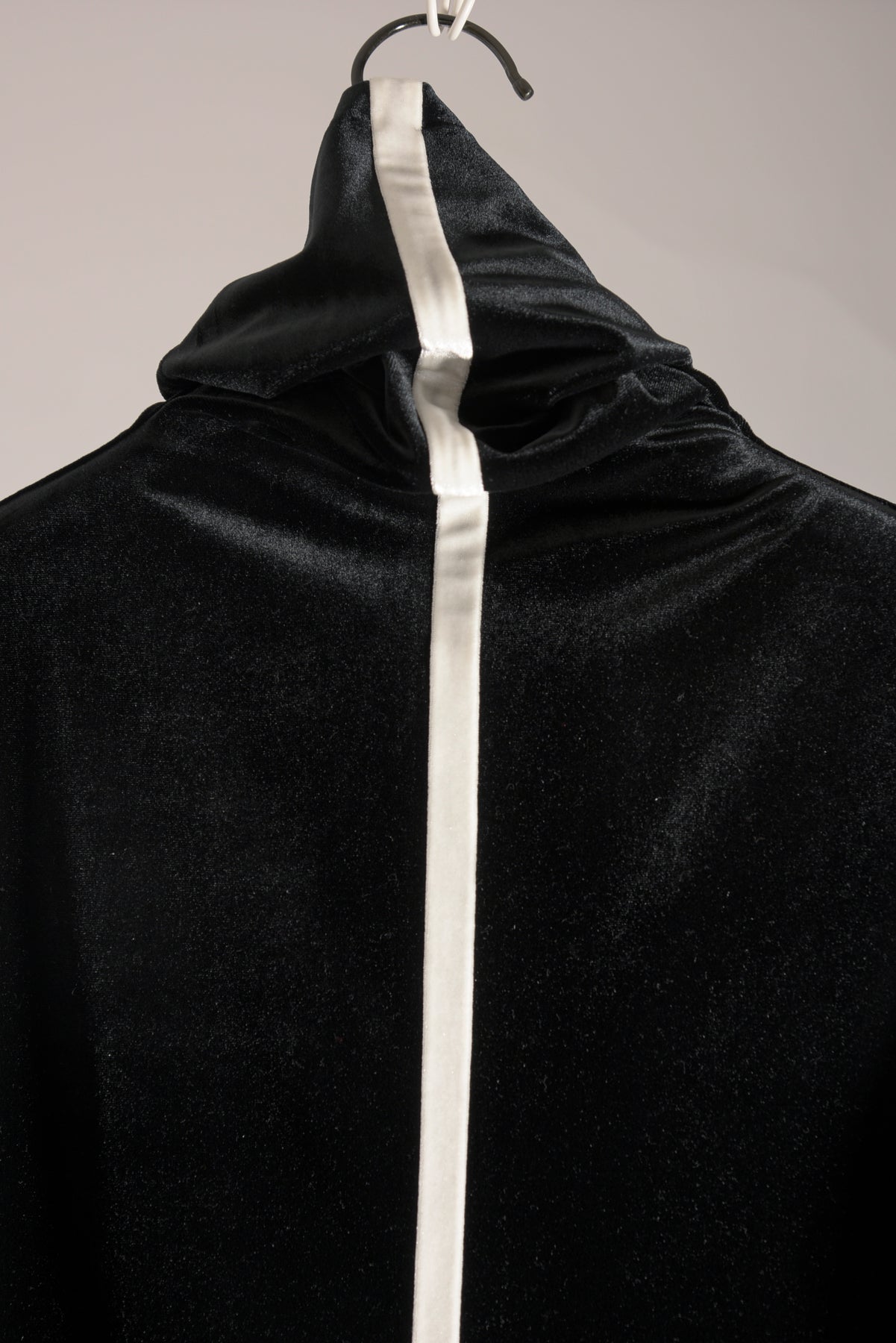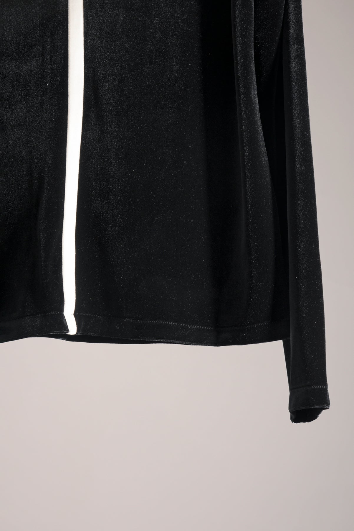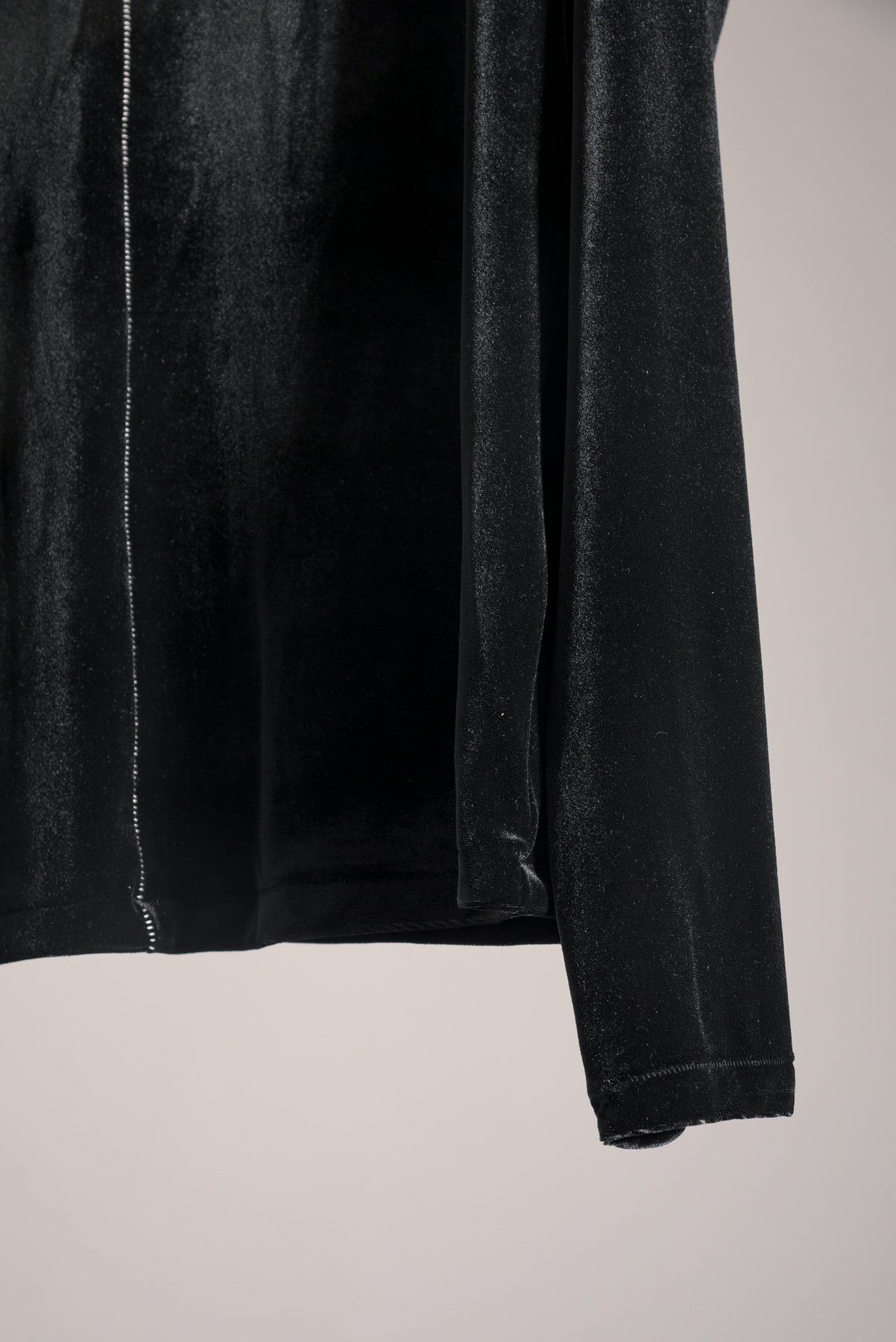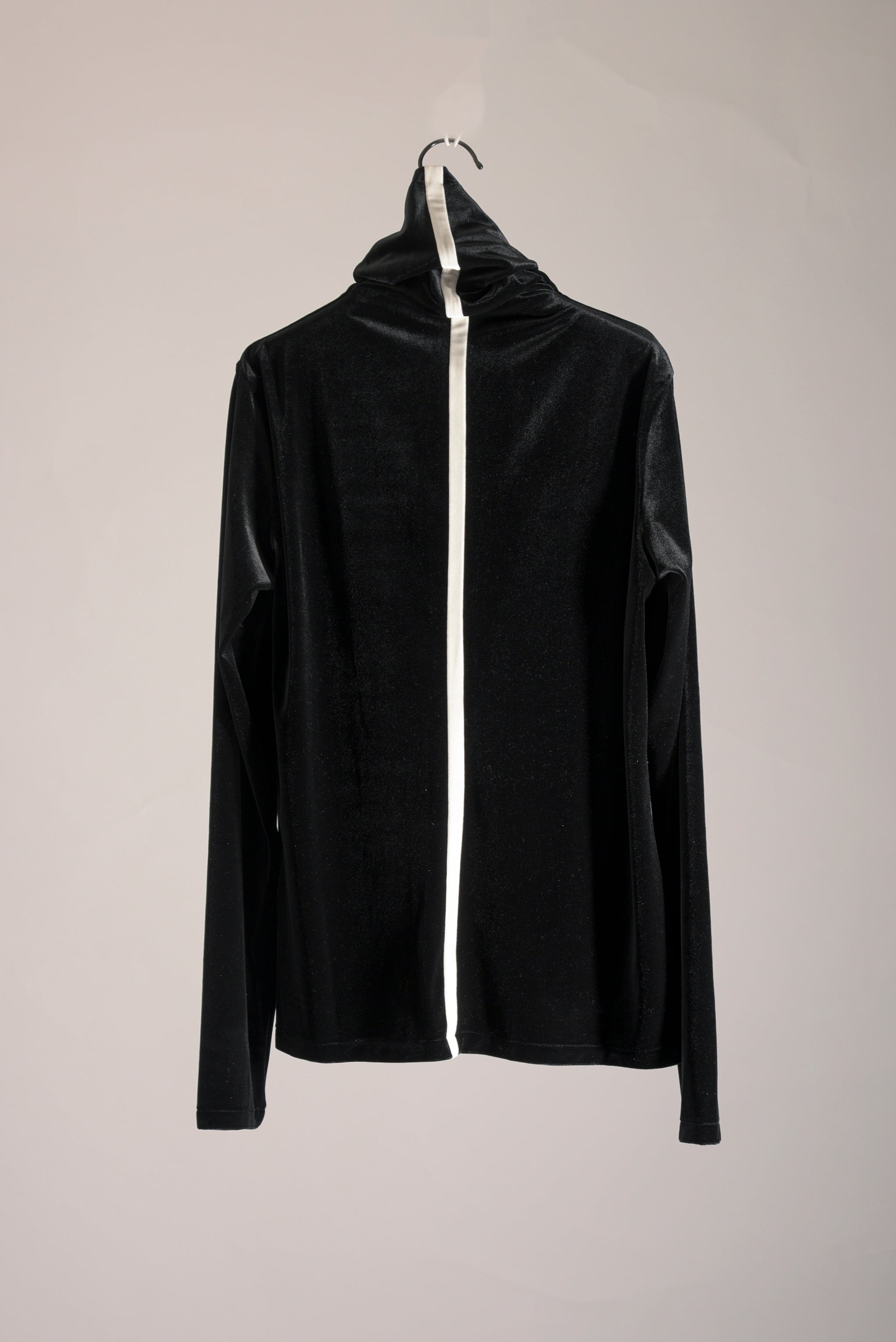 ブライトポリエステル(光沢感のある上品な光沢感が特徴)を使用したベロア素材、ポリエステルを一緒に編み込むことでキックバックに優れたストレッチ性があります。配色の前中心の接ぎと、後ろ中心のラインが効いたハイネックプルオーバーです。(A色は同色のALLブラックです。)