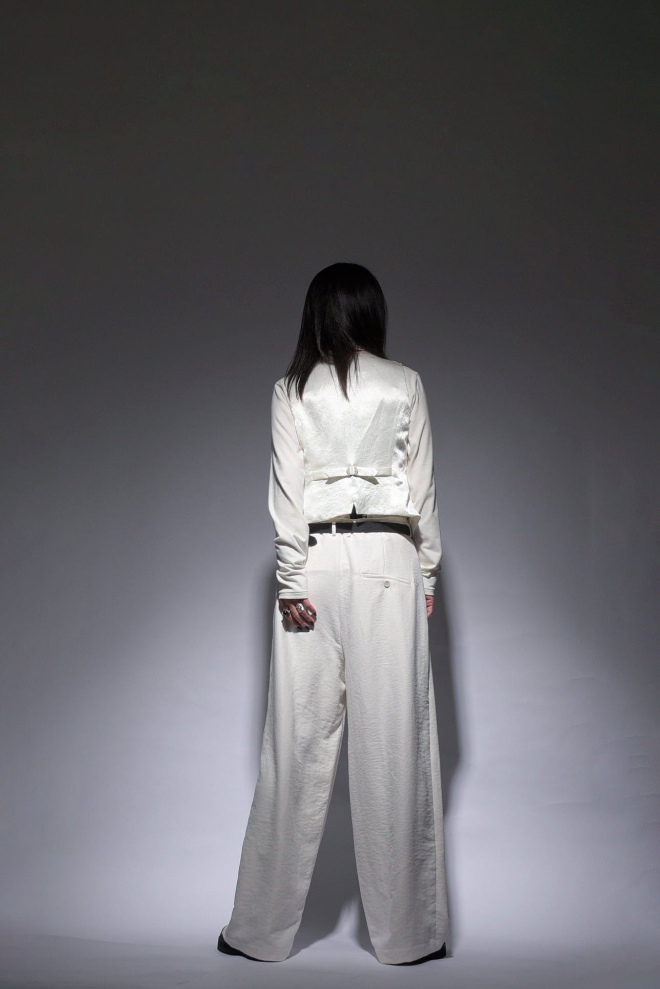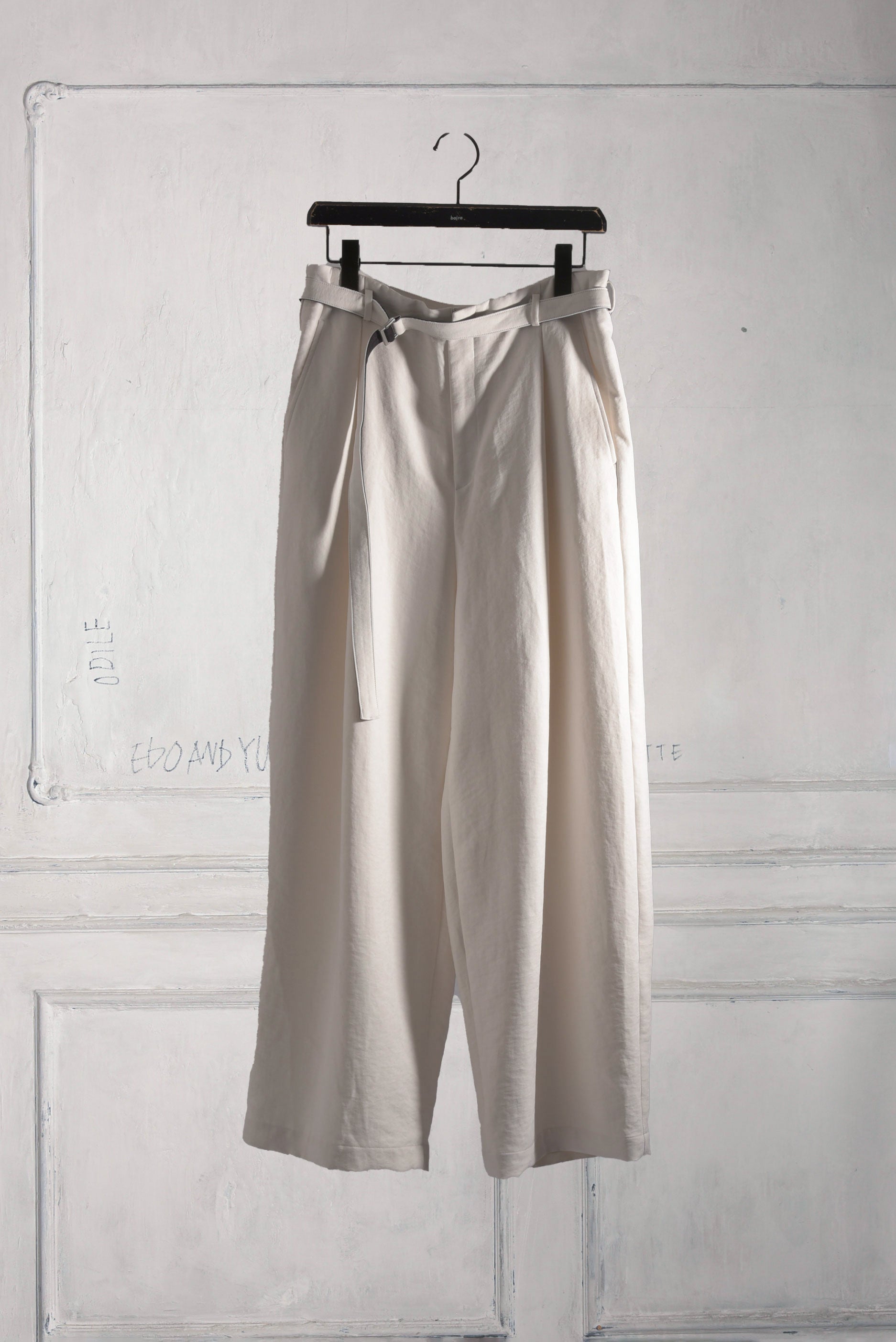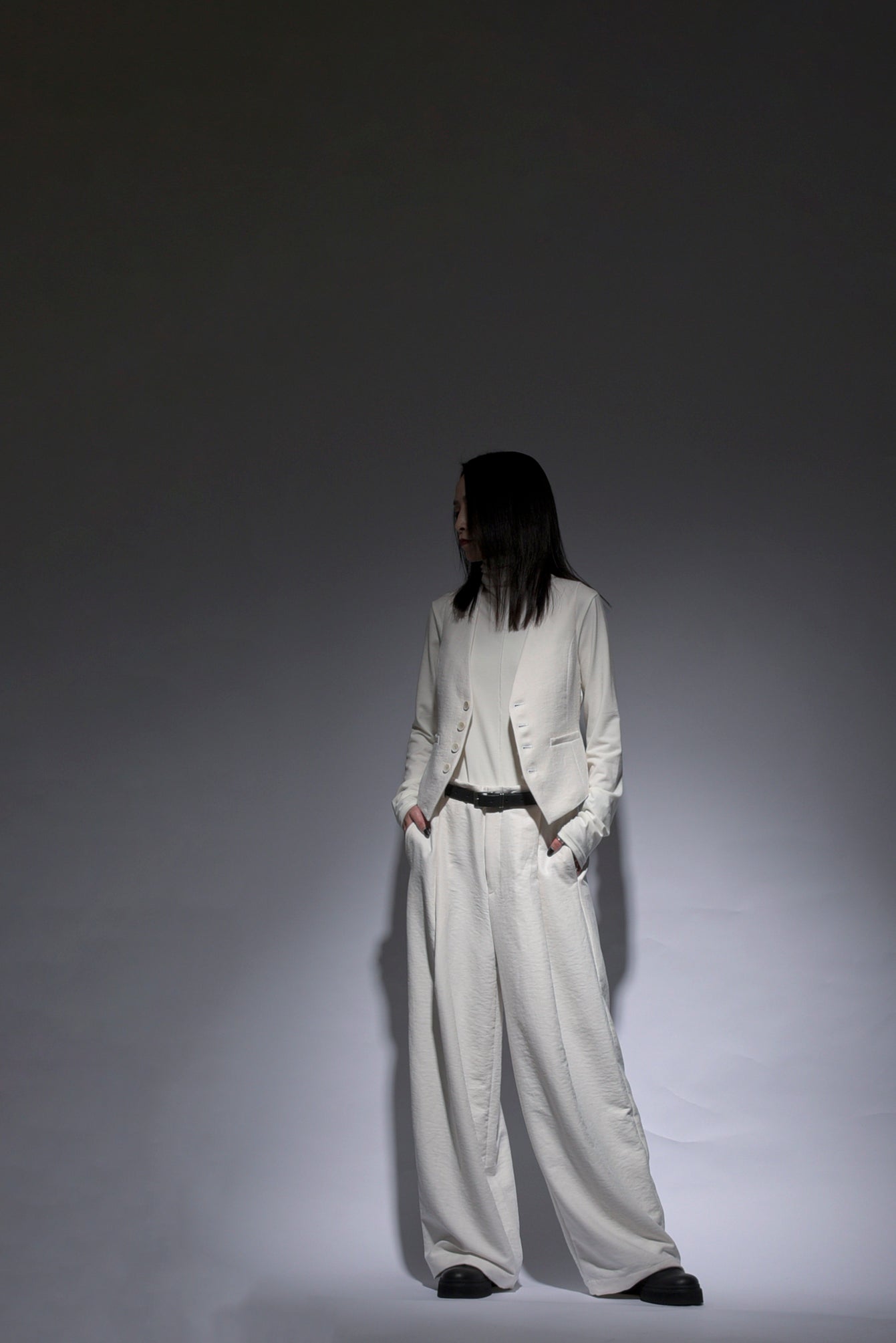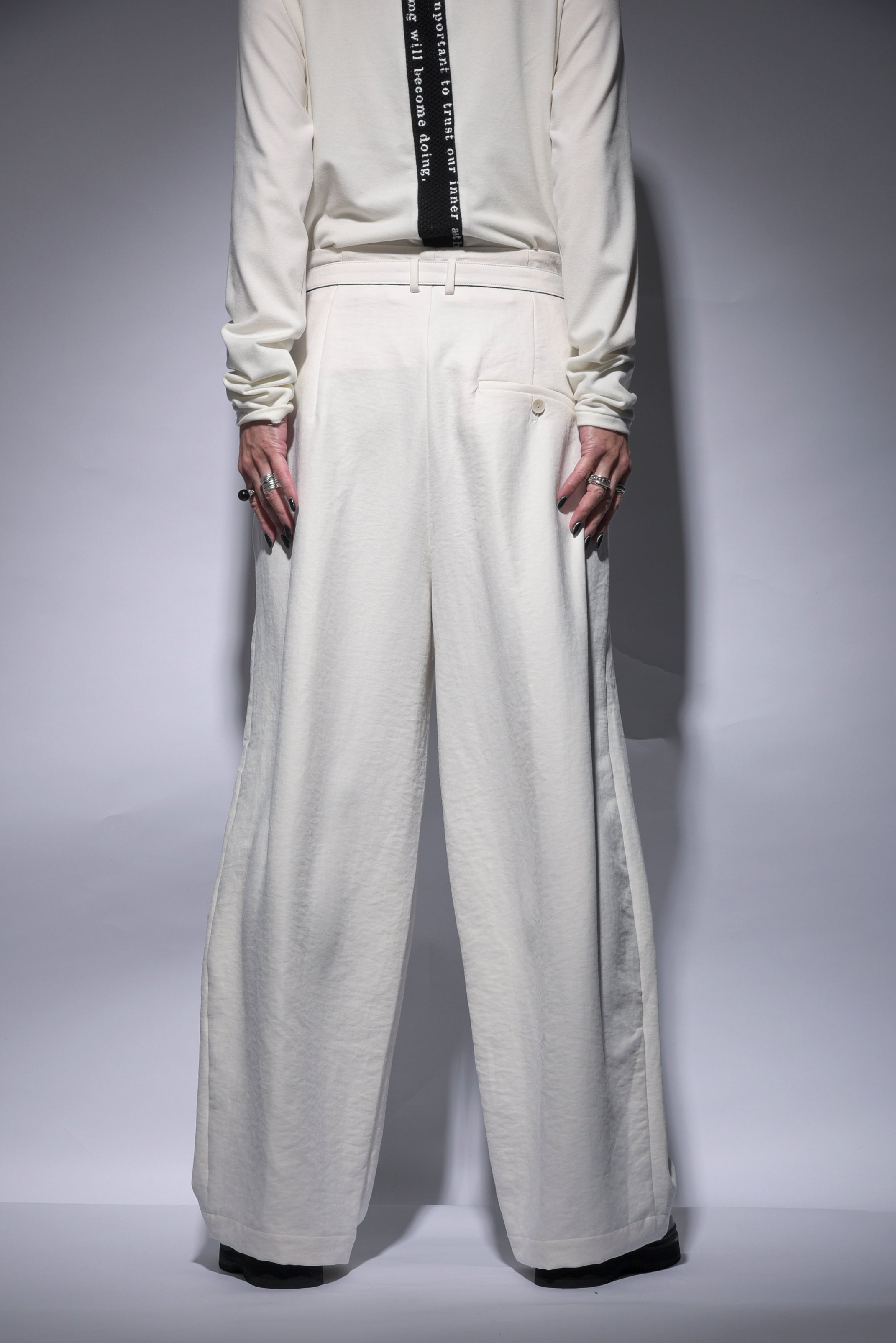 洗いをかけたような独特な風合いが特徴的なヴィンテージ割繊のワイドパンツです。生地に程よい厚みがあり、お洗濯が可能なイージーケア性があります。ゆったりめのウエストサイズ+股上は長くとってありますので、ラフな感じも出ていて大人っぽいモードな印象になります。 同素材でジャケット、ベストもございますのでセットでのご着用もお勧めです。