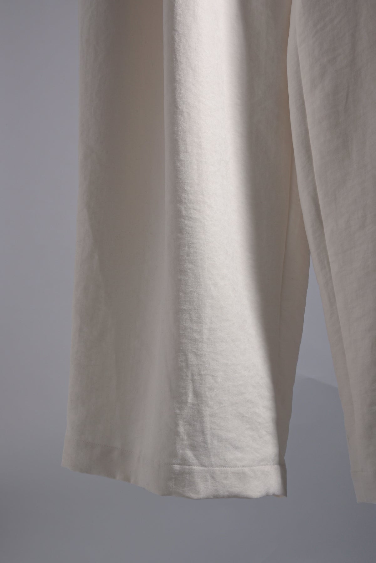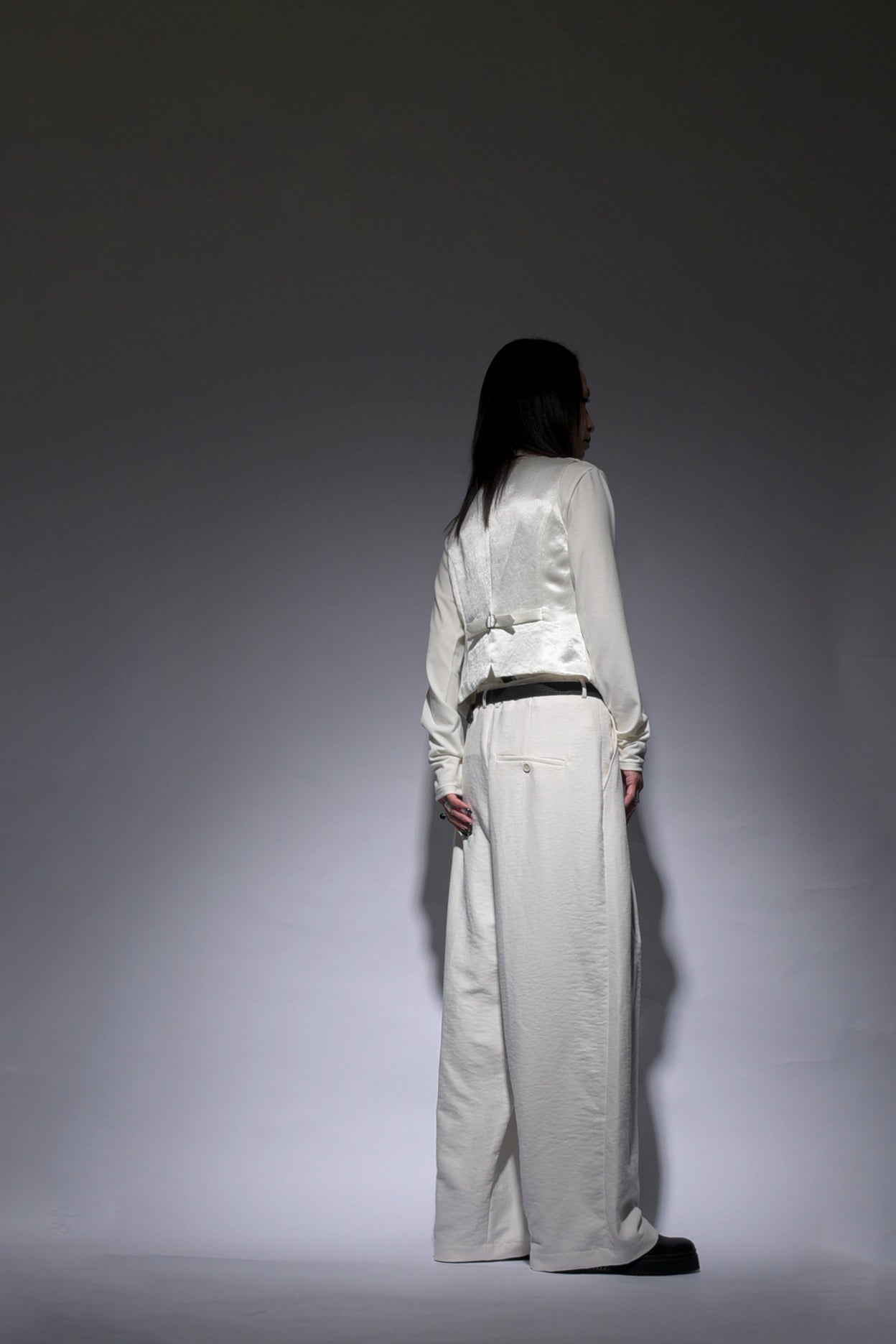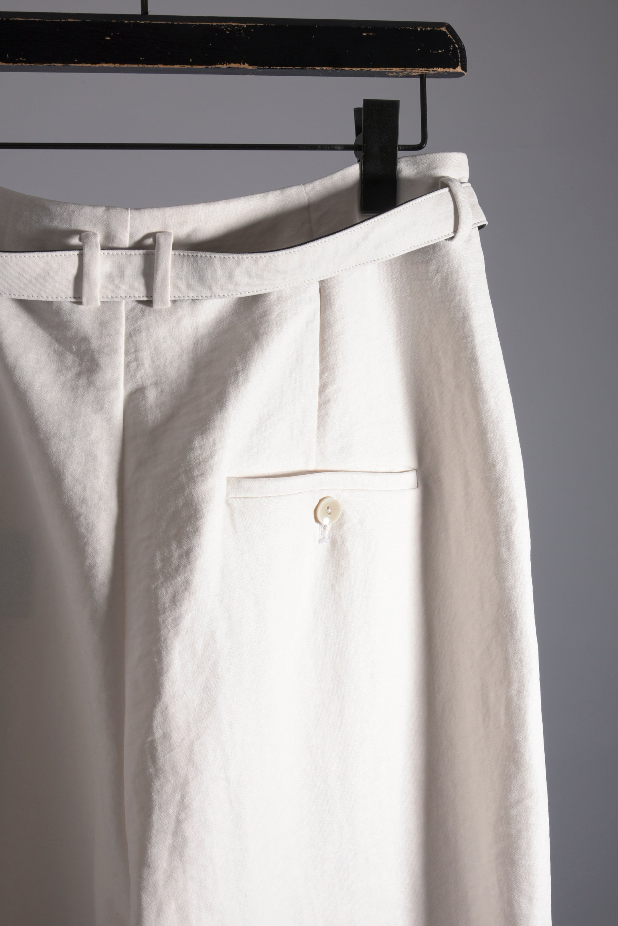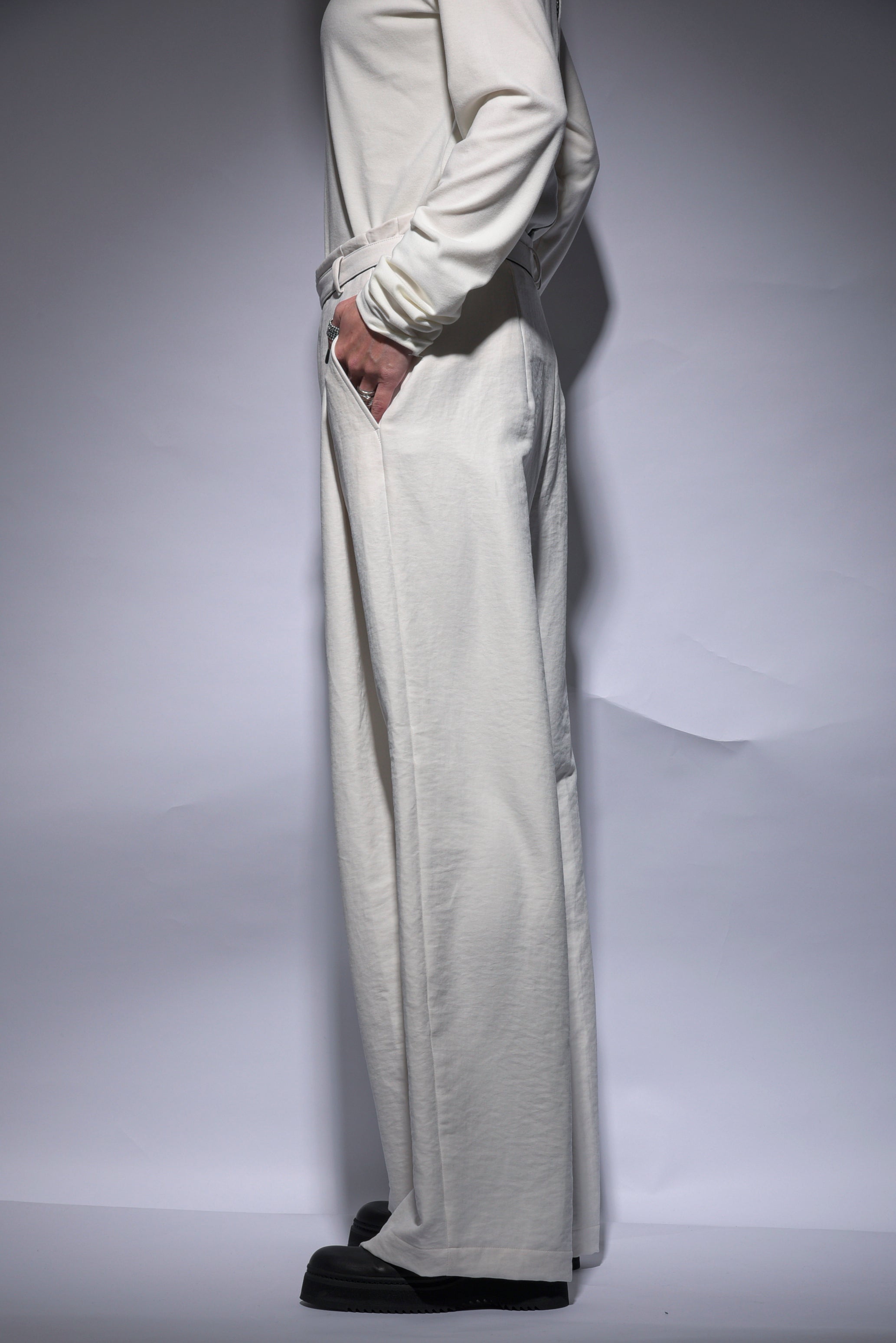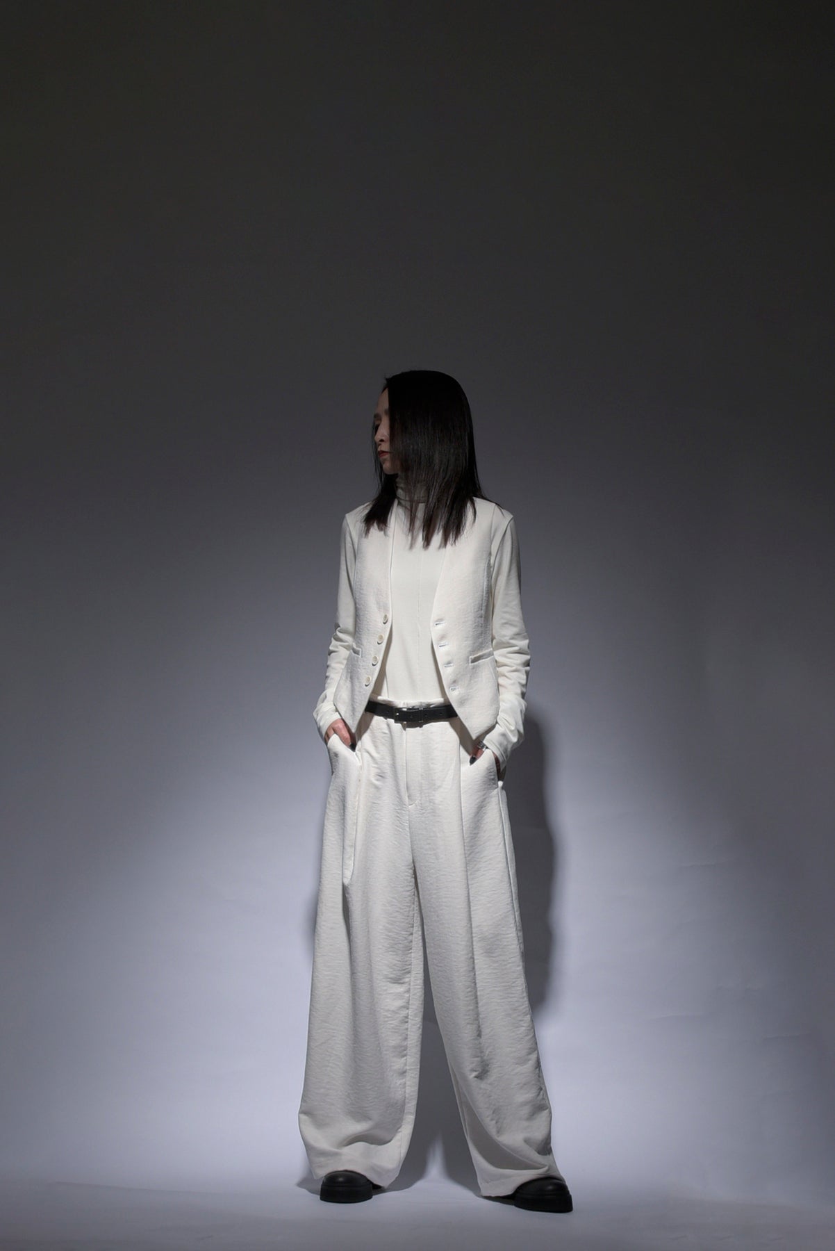 洗いをかけたような独特な風合いが特徴的なヴィンテージ割繊のワイドパンツです。生地に程よい厚みがあり、お洗濯が可能なイージーケア性があります。ゆったりめのウエストサイズ+股上は長くとってありますので、ラフな感じも出ていて大人っぽいモードな印象になります。 同素材でジャケット、ベストもございますのでセットでのご着用もお勧めです。