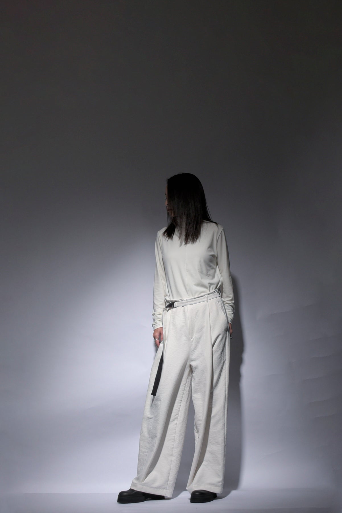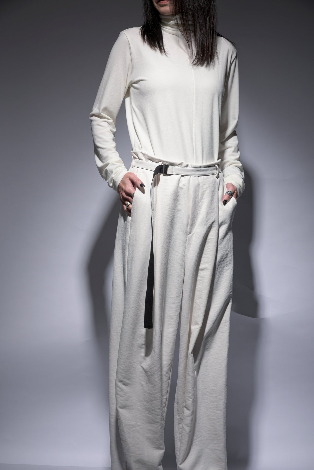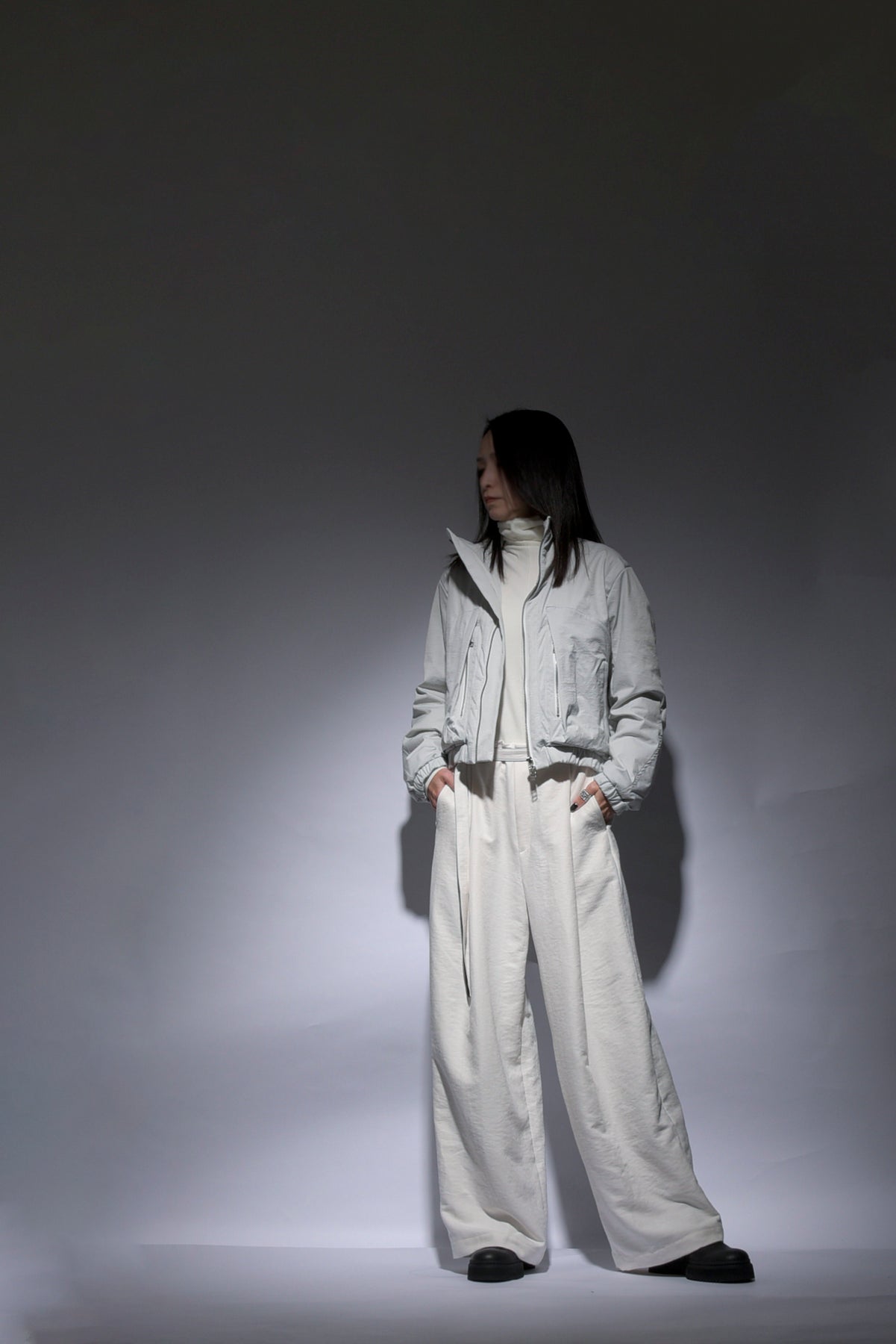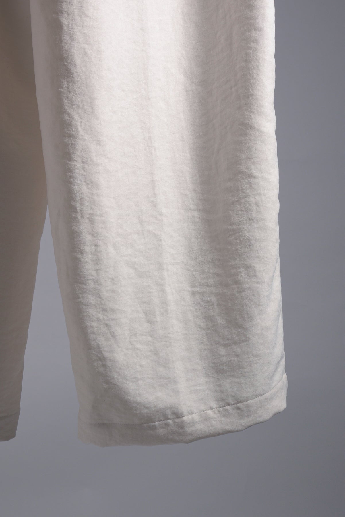 洗いをかけたような独特な風合いが特徴的なヴィンテージ割繊のワイドパンツです。生地に程よい厚みがあり、お洗濯が可能なイージーケア性があります。ゆったりめのウエストサイズ+股上は長くとってありますので、ラフな感じも出ていて大人っぽいモードな印象になります。 同素材でジャケット、ベストもございますのでセットでのご着用もお勧めです。