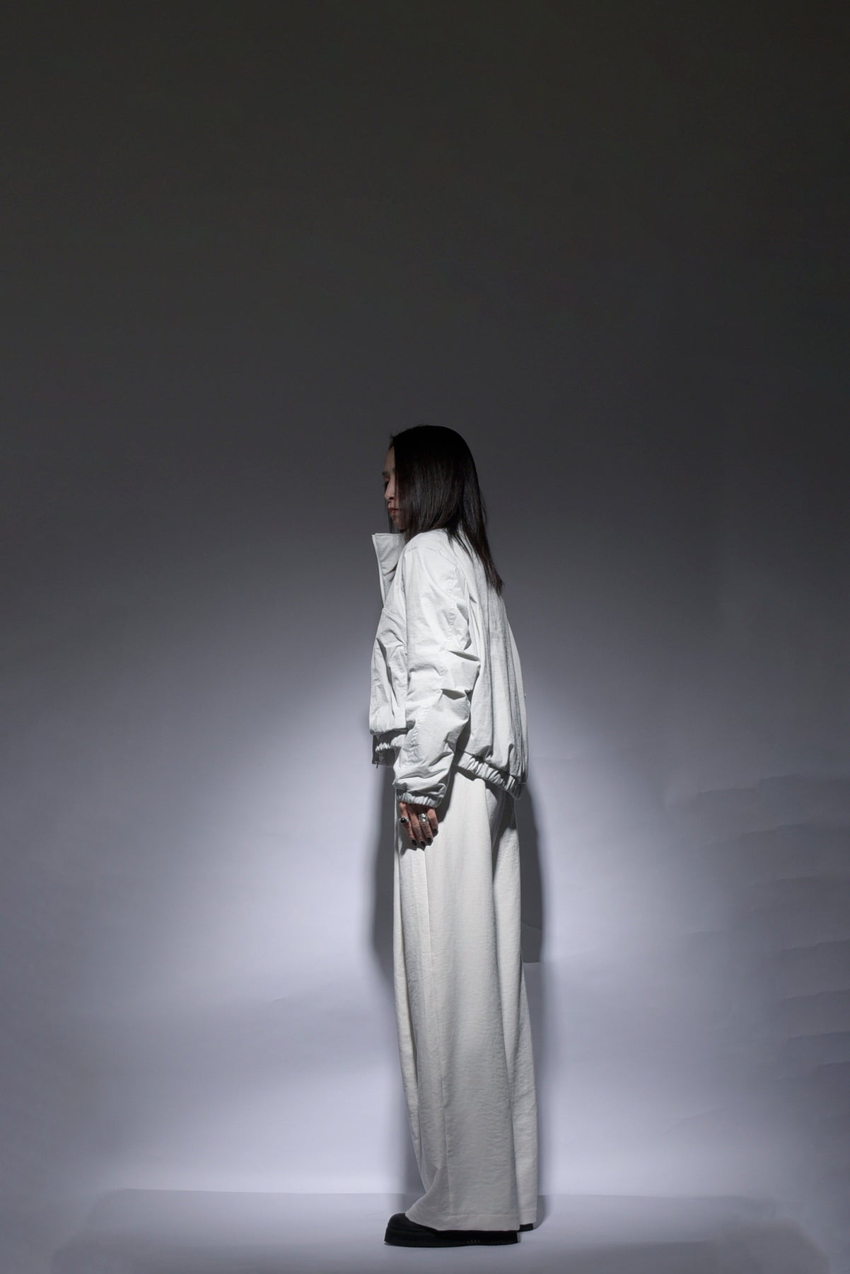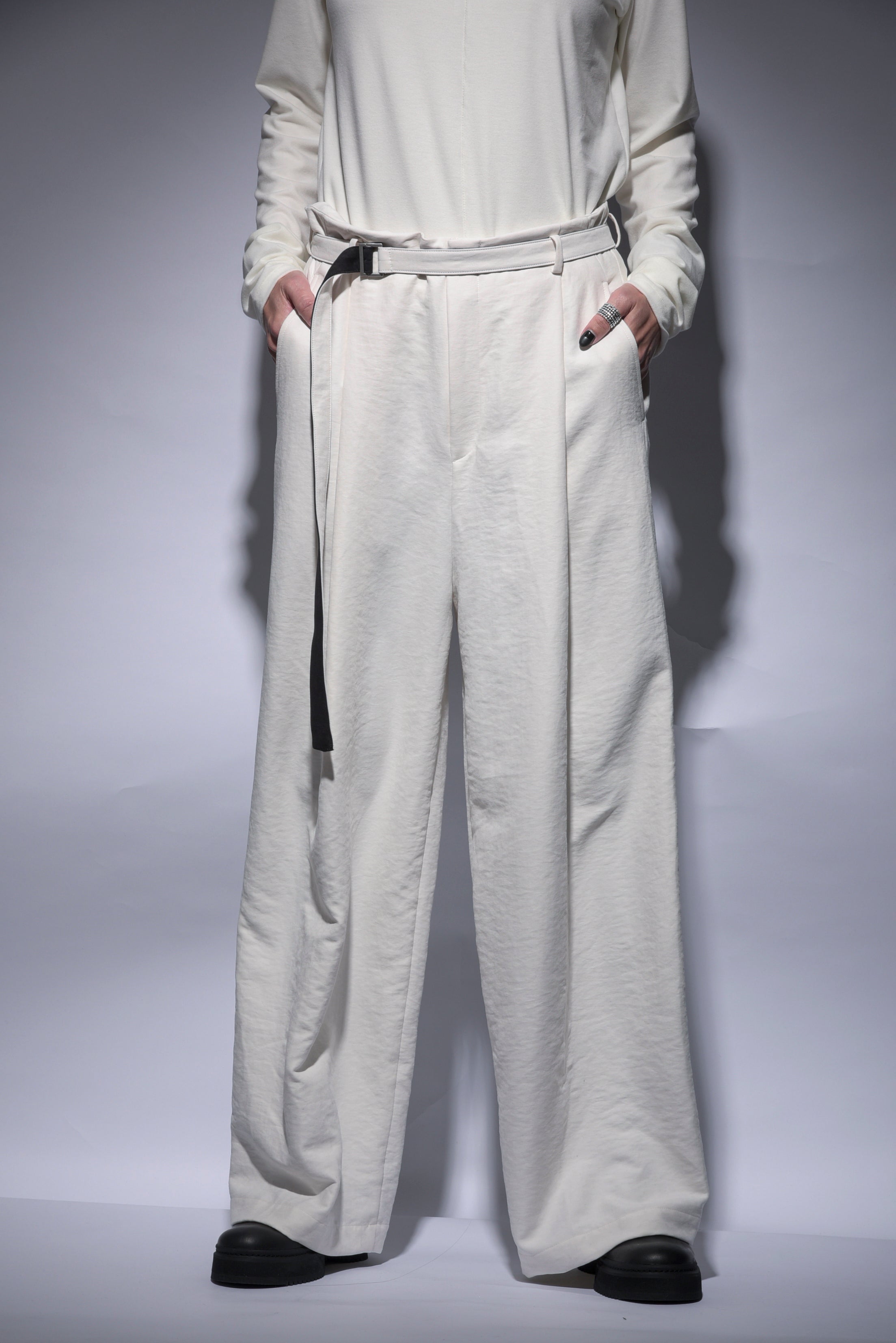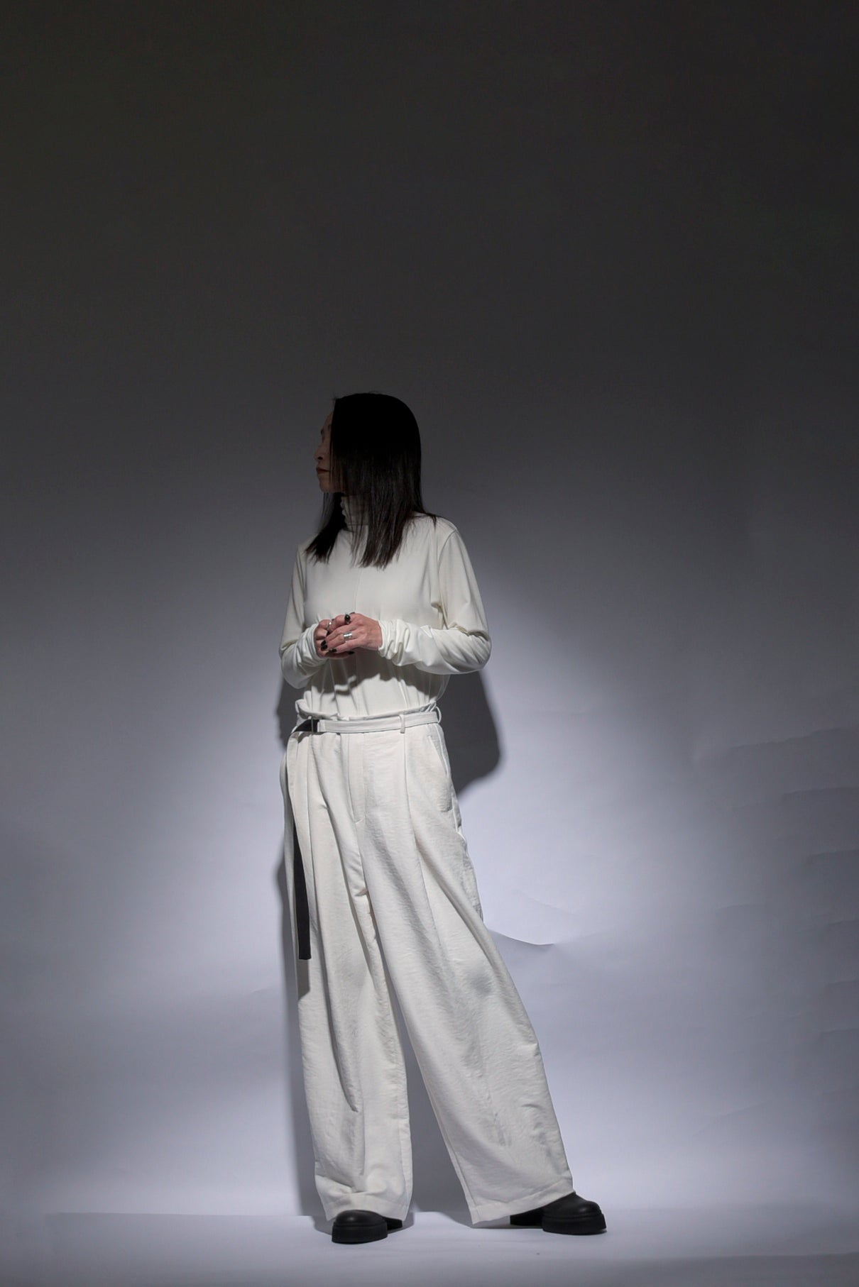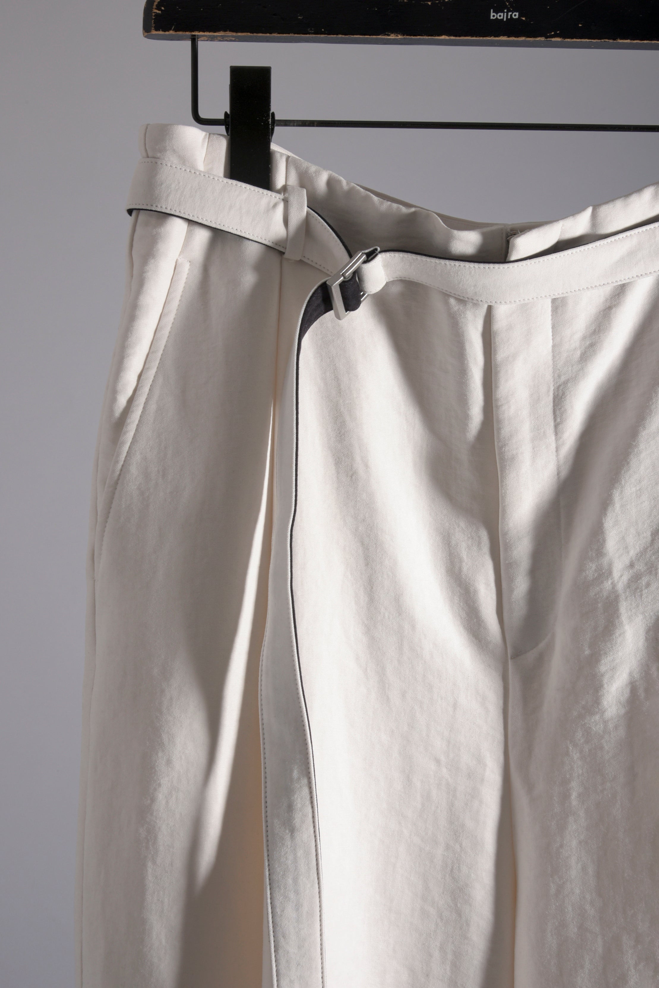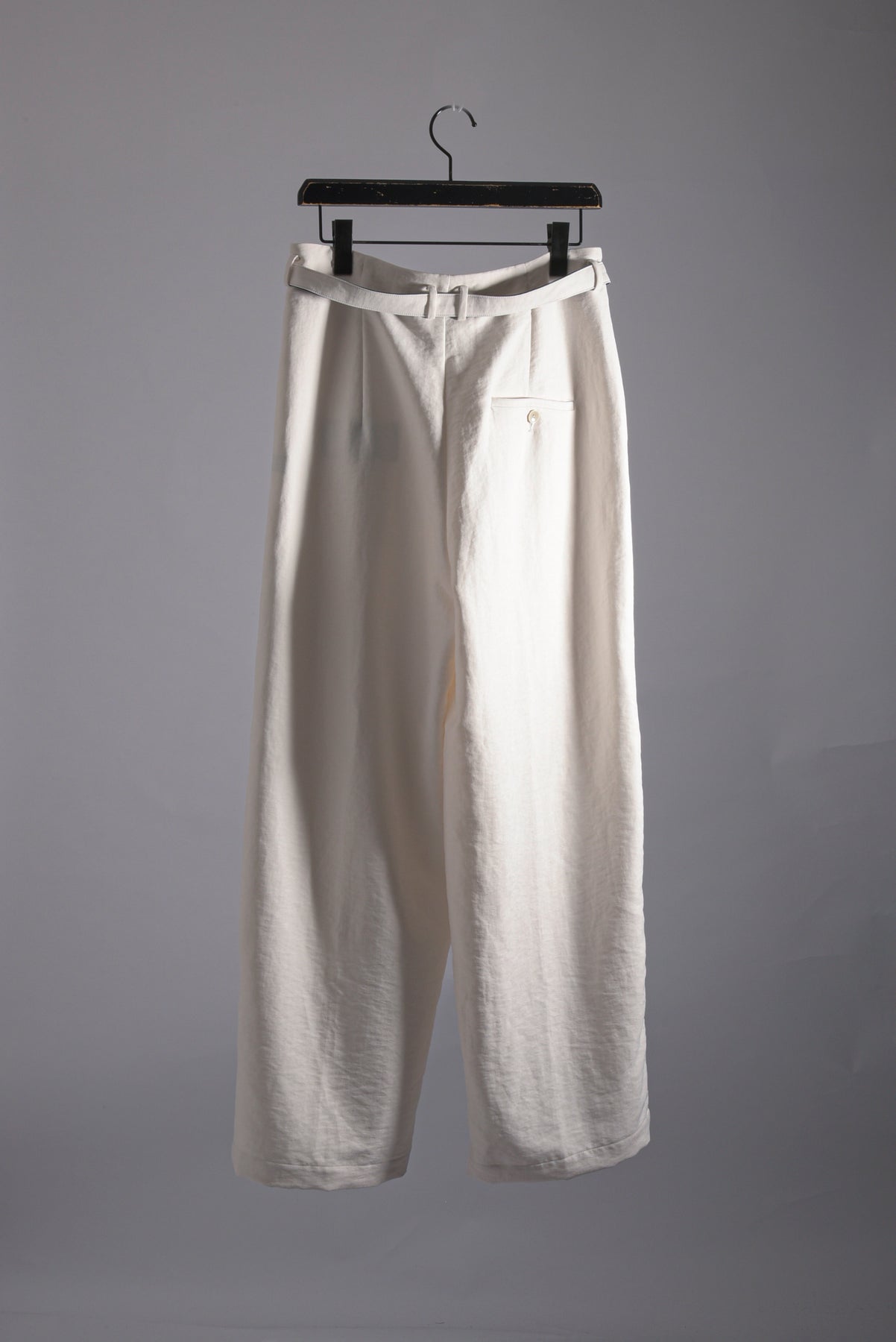 洗いをかけたような独特な風合いが特徴的なヴィンテージ割繊のワイドパンツです。生地に程よい厚みがあり、お洗濯が可能なイージーケア性があります。ゆったりめのウエストサイズ+股上は長くとってありますので、ラフな感じも出ていて大人っぽいモードな印象になります。 同素材でジャケット、ベストもございますのでセットでのご着用もお勧めです。