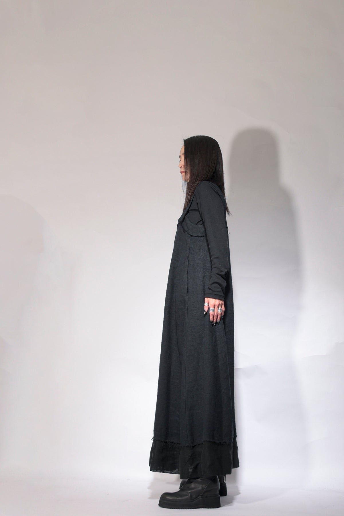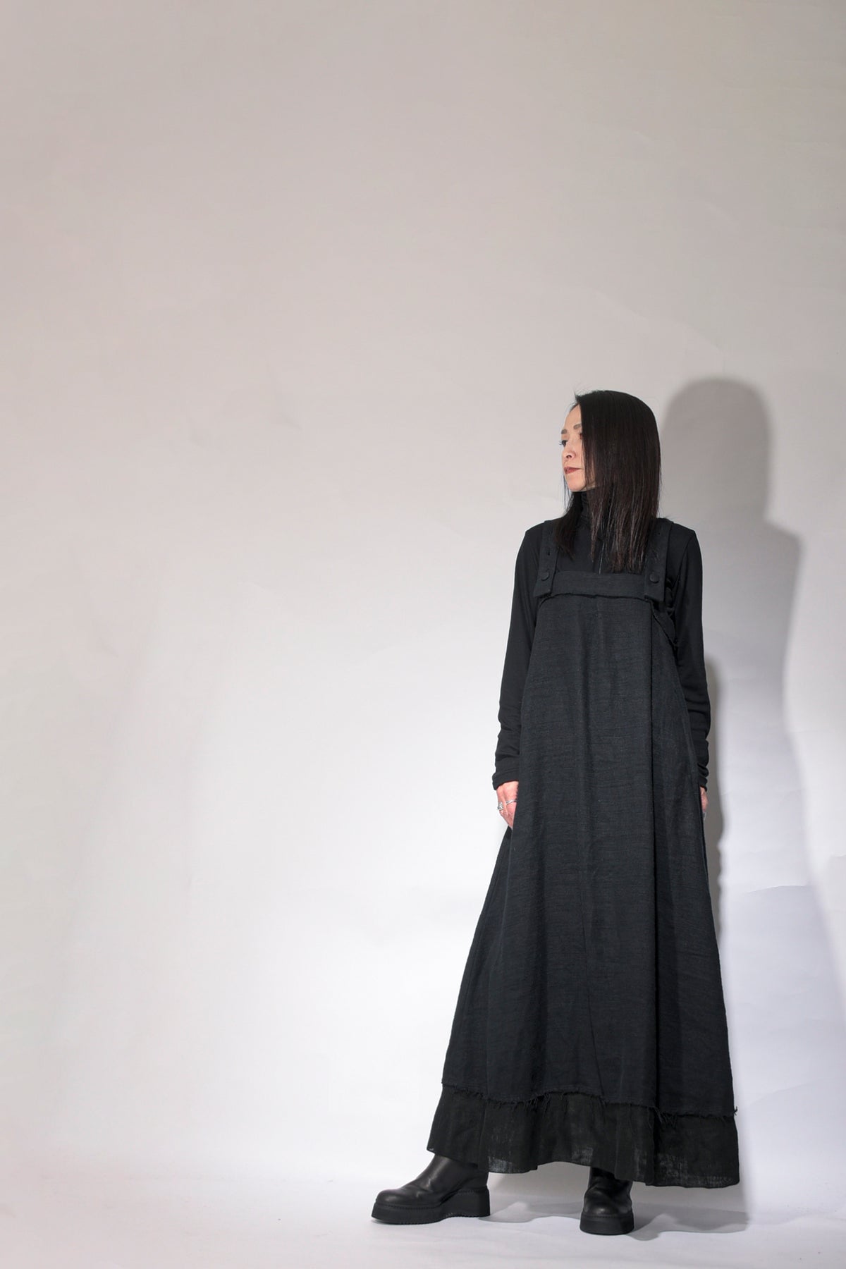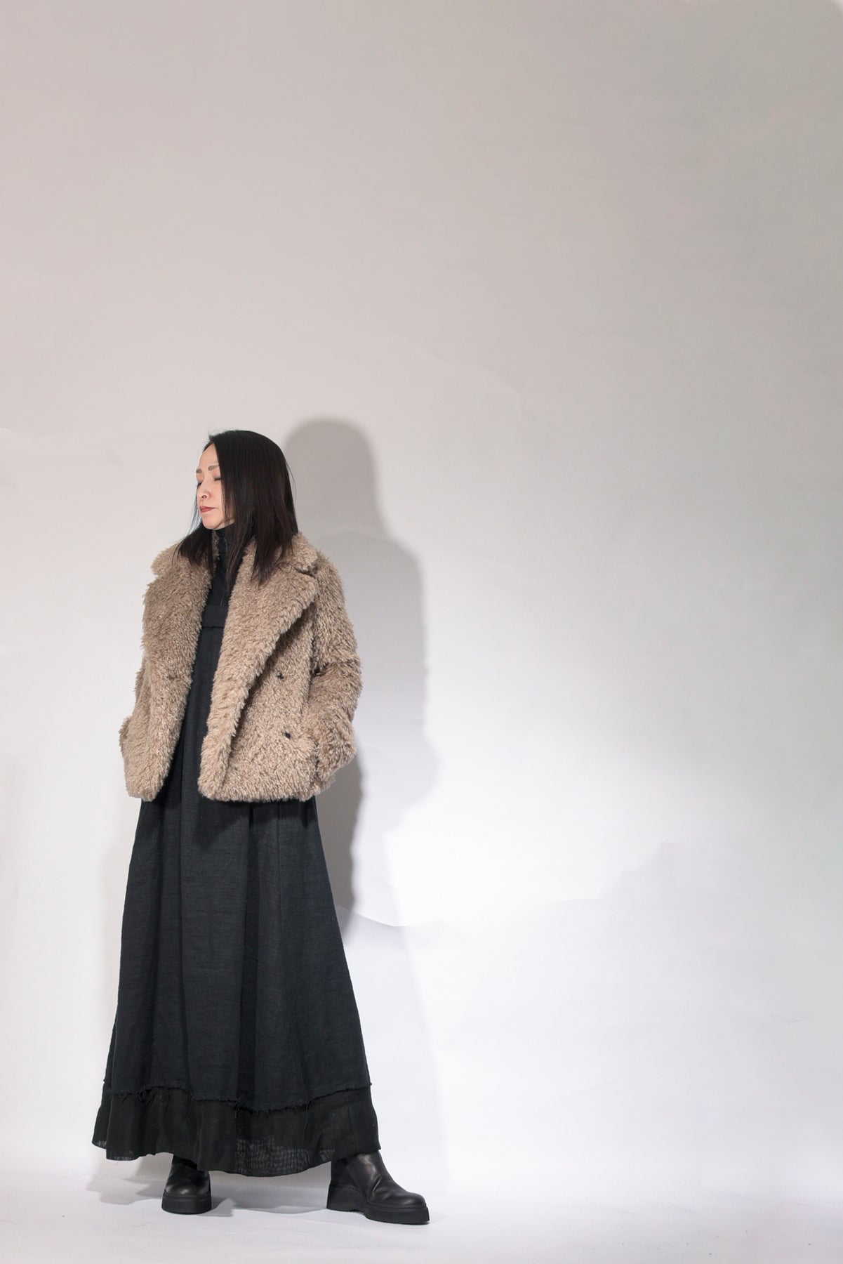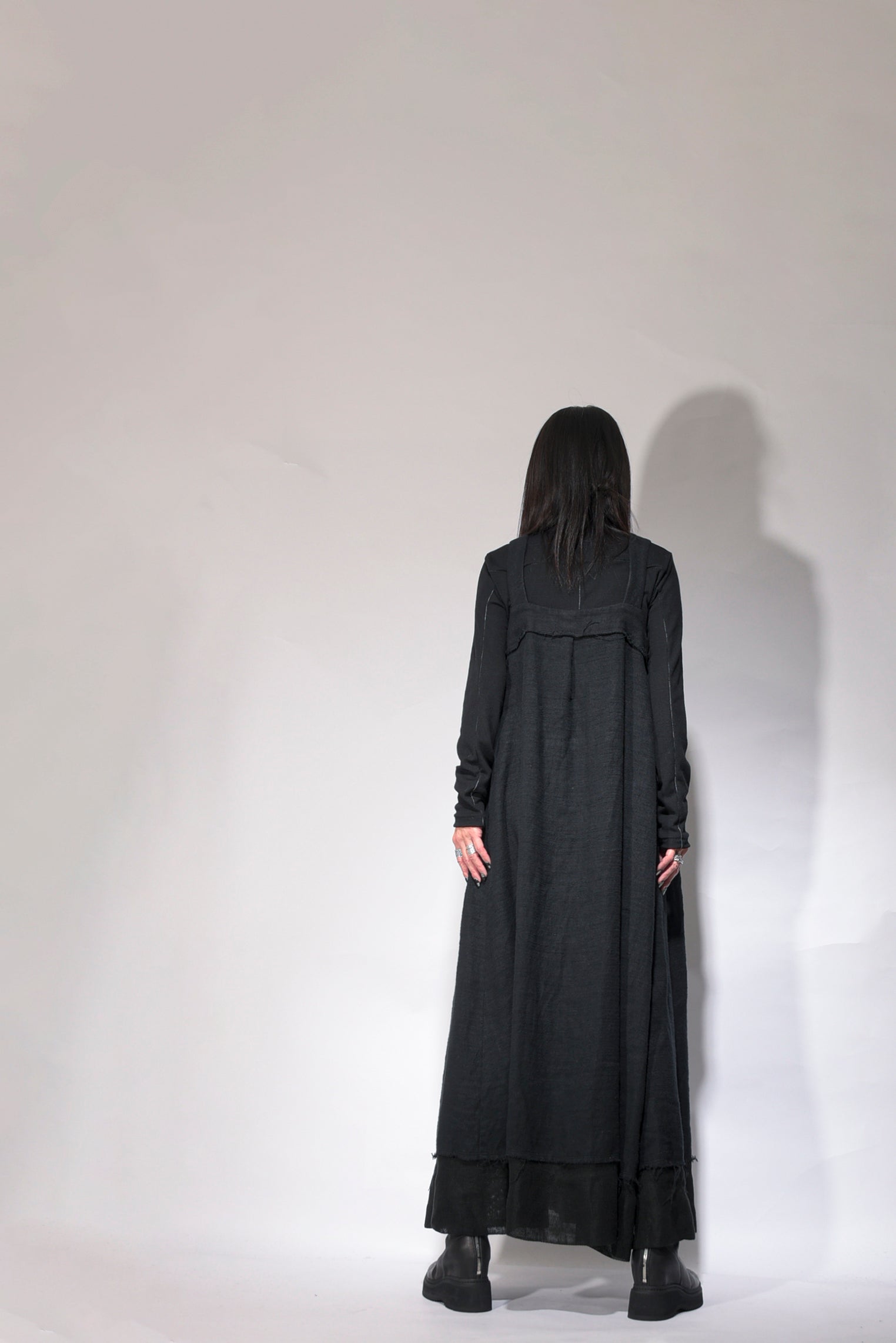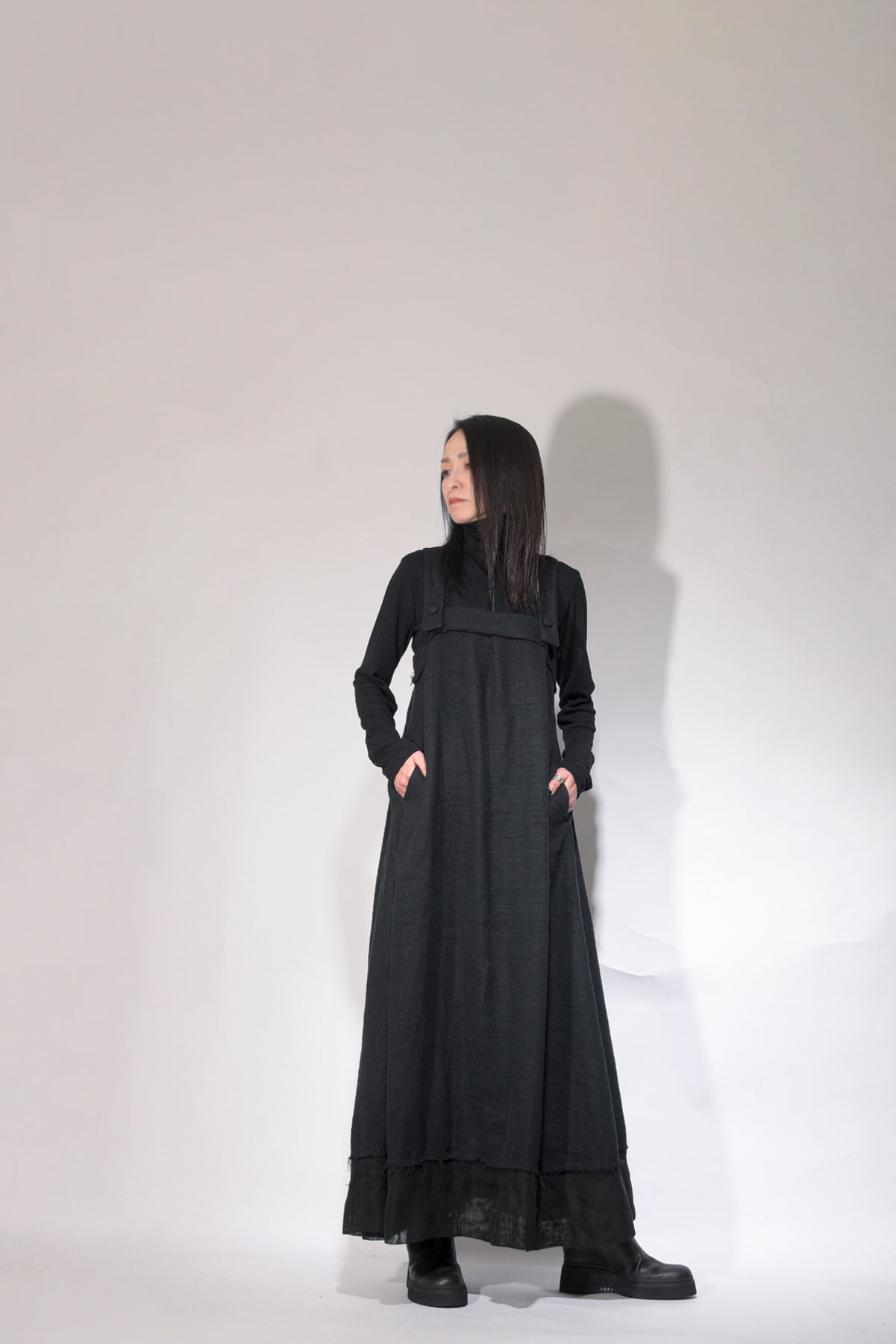 リネン本来が持つ深い生成りの色、リネン紡績の中でも古い歴史を持つセミウェットスピニングという紡績方法で作られた太いリネン糸を使用した素材に起毛加工を施しました。リネンが持つ良さを最大限に引き出しつつ、後加工で洗いざらしの風合いやワッシャー感を加え柔らかく仕上げていますので着心地も良いです。たっぷりの分量感のワンピースで、インナー次第で様々なコーディネートにご着用いただけます。裾の異素材掛け合わせも効いています◎