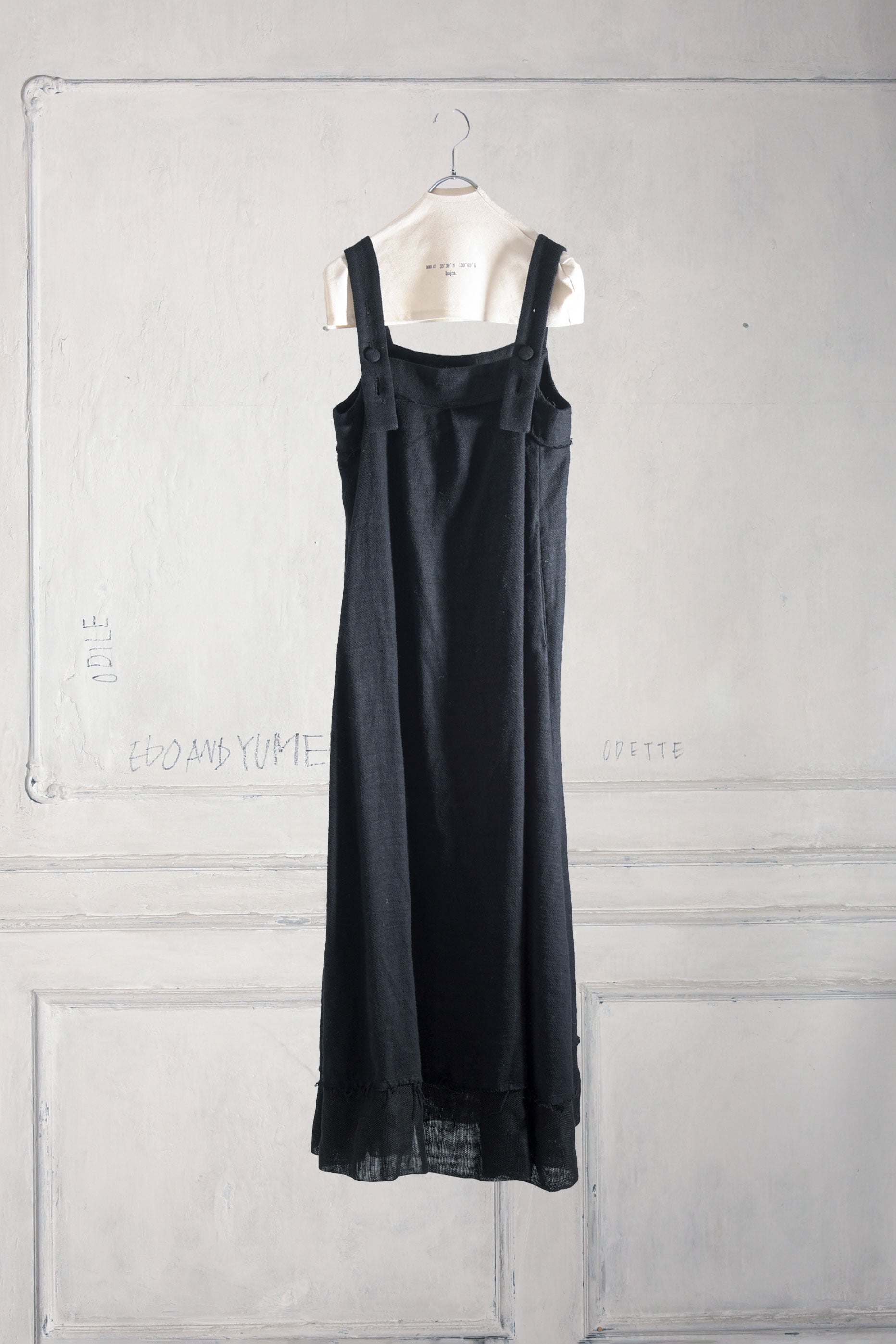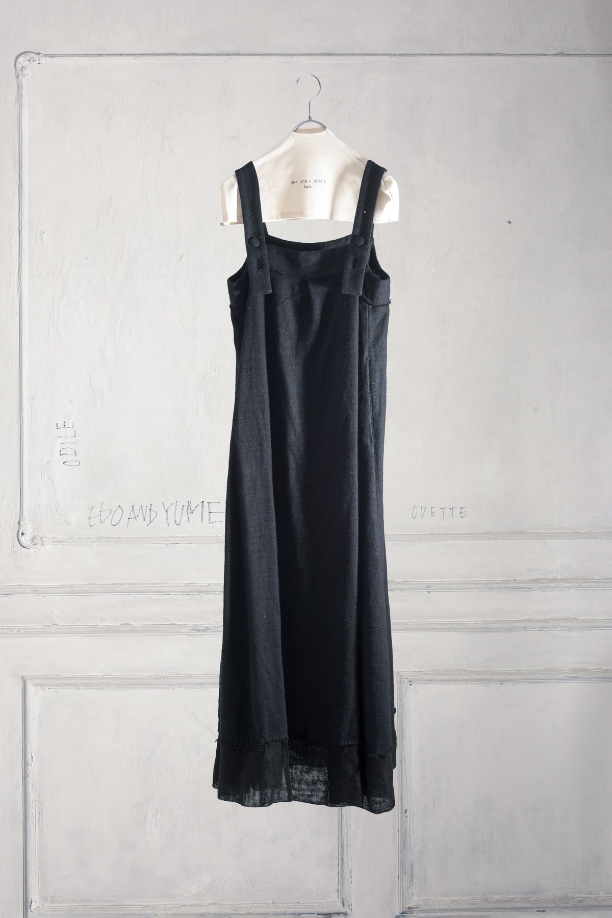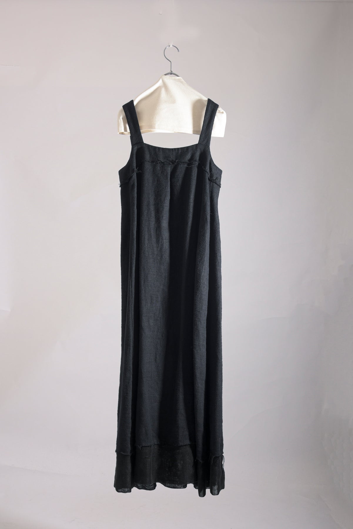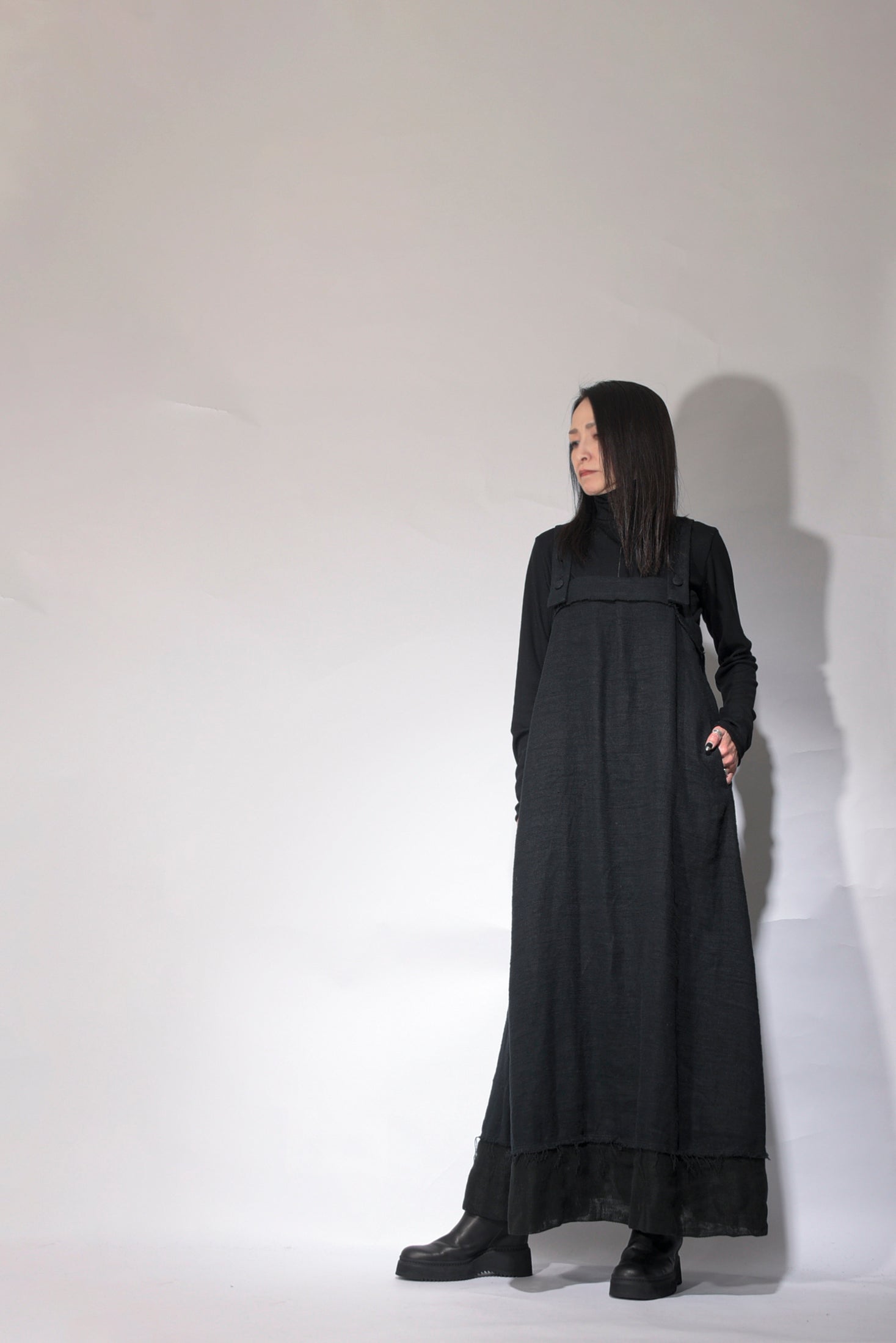 リネン本来が持つ深い生成りの色、リネン紡績の中でも古い歴史を持つセミウェットスピニングという紡績方法で作られた太いリネン糸を使用した素材に起毛加工を施しました。リネンが持つ良さを最大限に引き出しつつ、後加工で洗いざらしの風合いやワッシャー感を加え柔らかく仕上げていますので着心地も良いです。たっぷりの分量感のワンピースで、インナー次第で様々なコーディネートにご着用いただけます。裾の異素材掛け合わせも効いています◎
