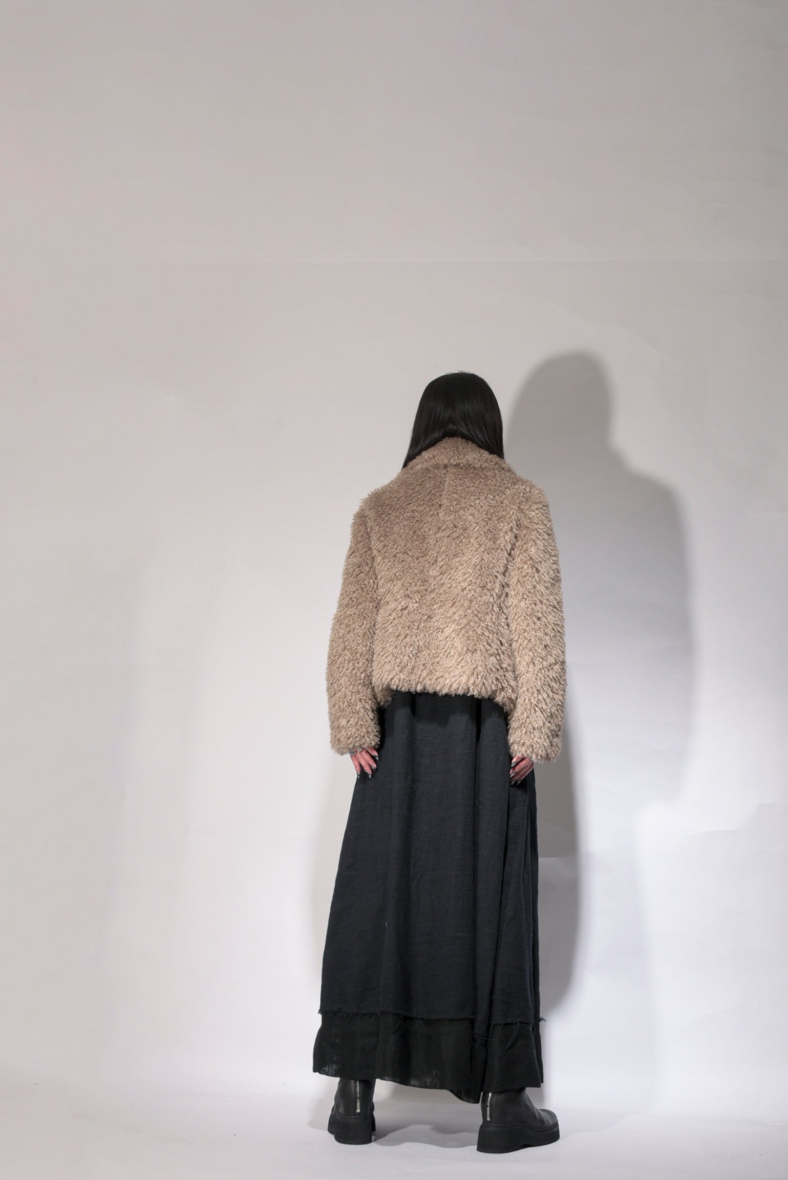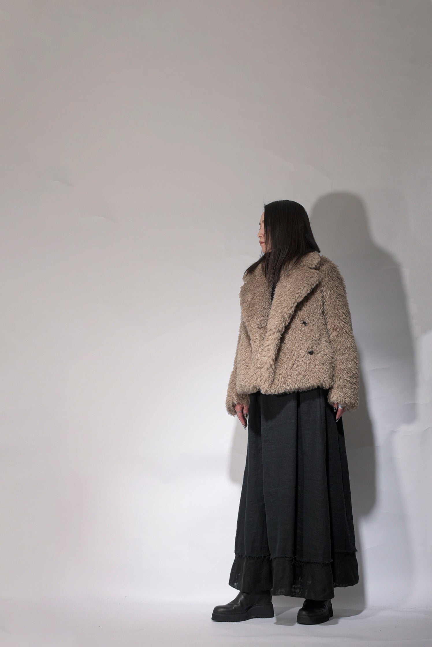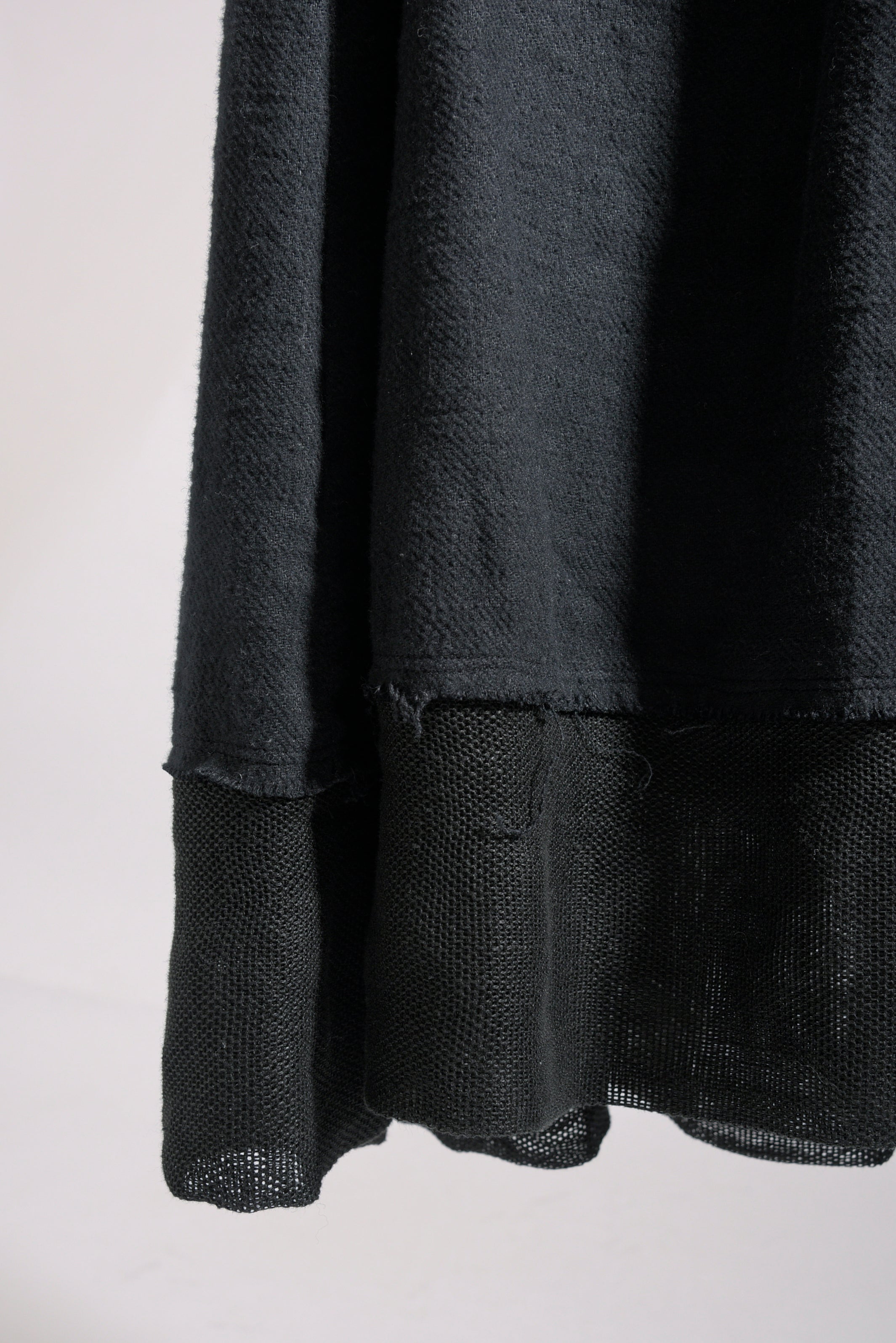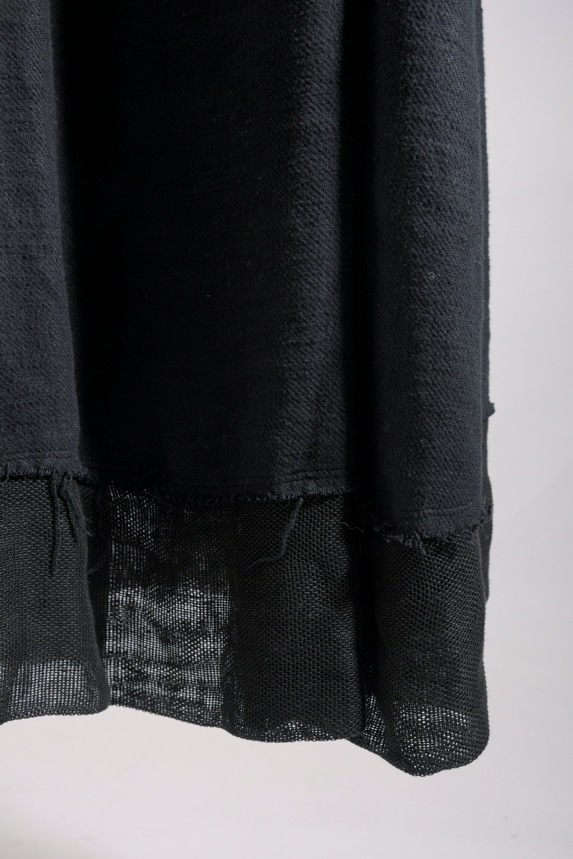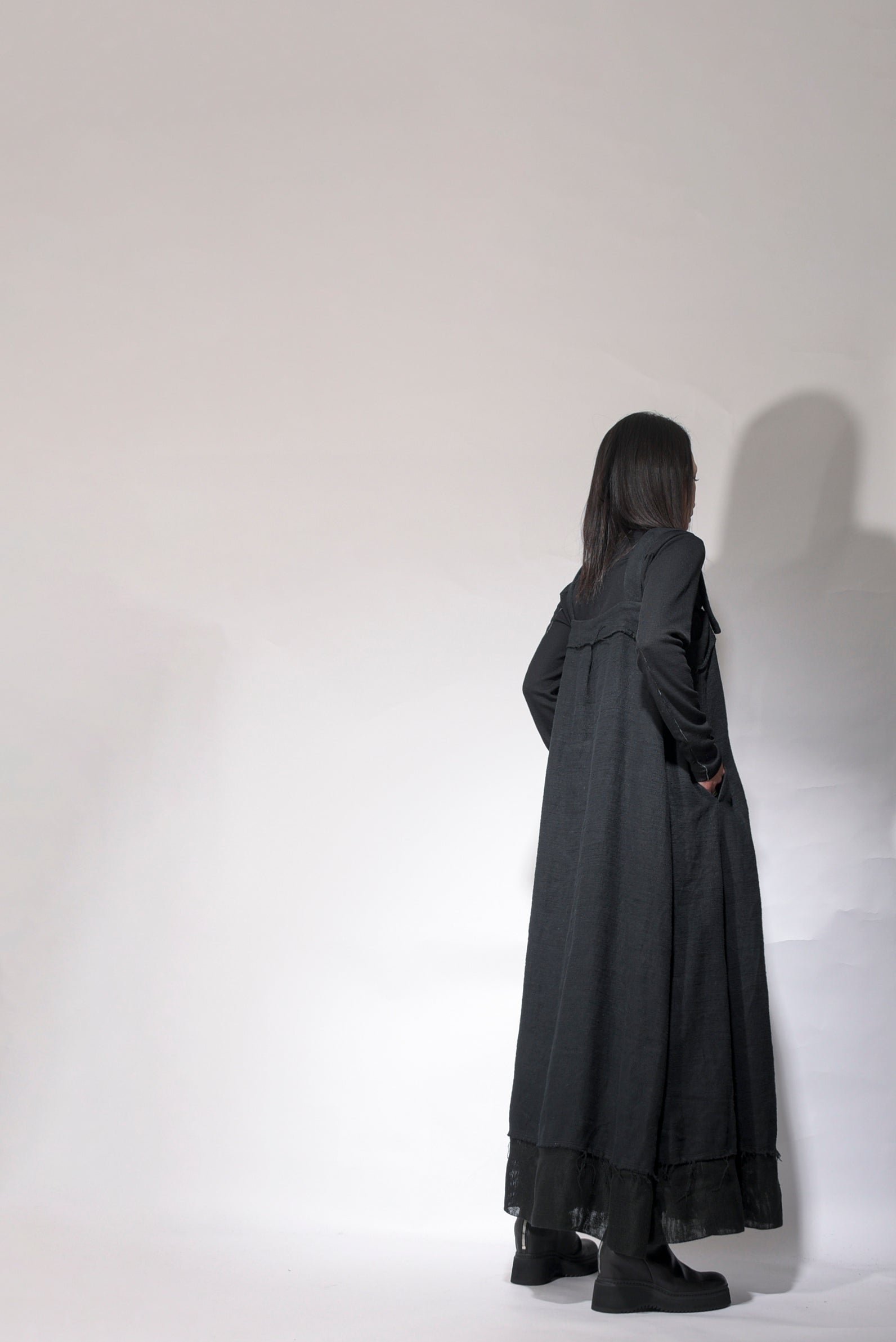 リネン本来が持つ深い生成りの色、リネン紡績の中でも古い歴史を持つセミウェットスピニングという紡績方法で作られた太いリネン糸を使用した素材に起毛加工を施しました。リネンが持つ良さを最大限に引き出しつつ、後加工で洗いざらしの風合いやワッシャー感を加え柔らかく仕上げていますので着心地も良いです。たっぷりの分量感のワンピースで、インナー次第で様々なコーディネートにご着用いただけます。裾の異素材掛け合わせも効いています◎