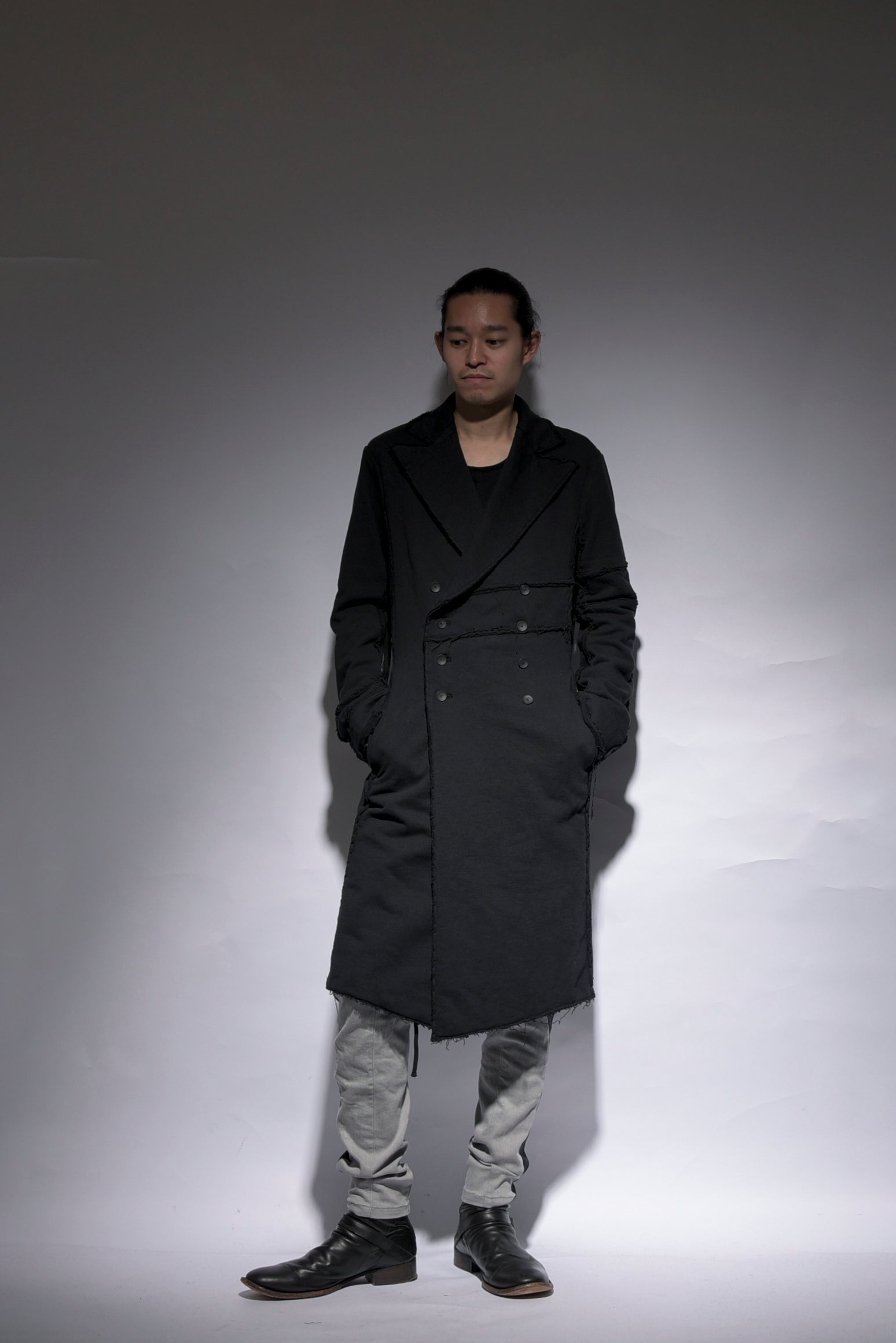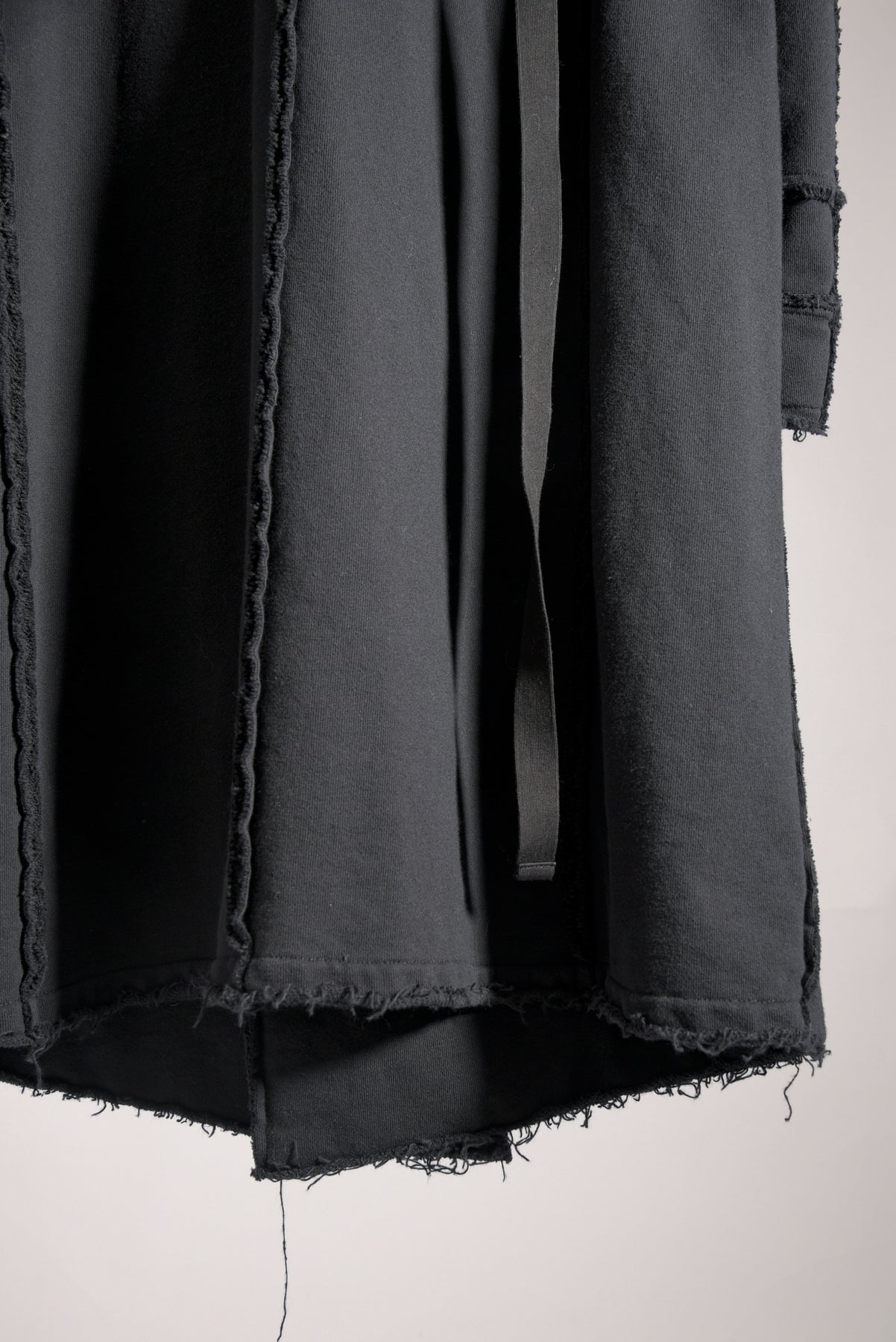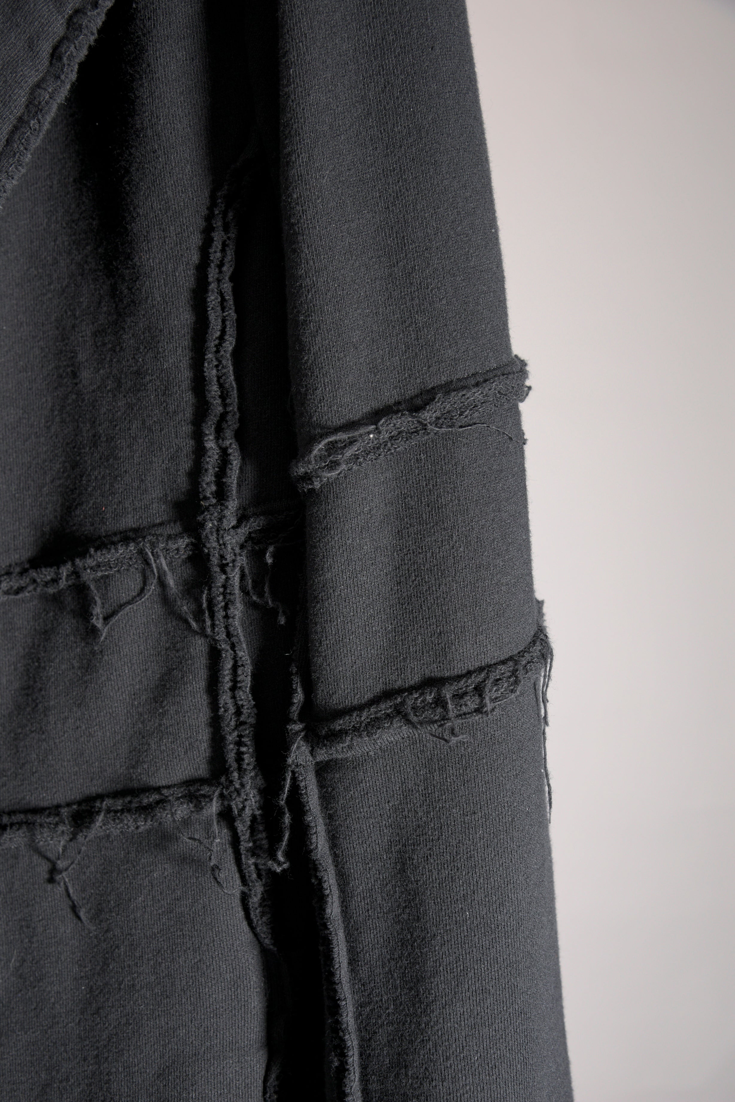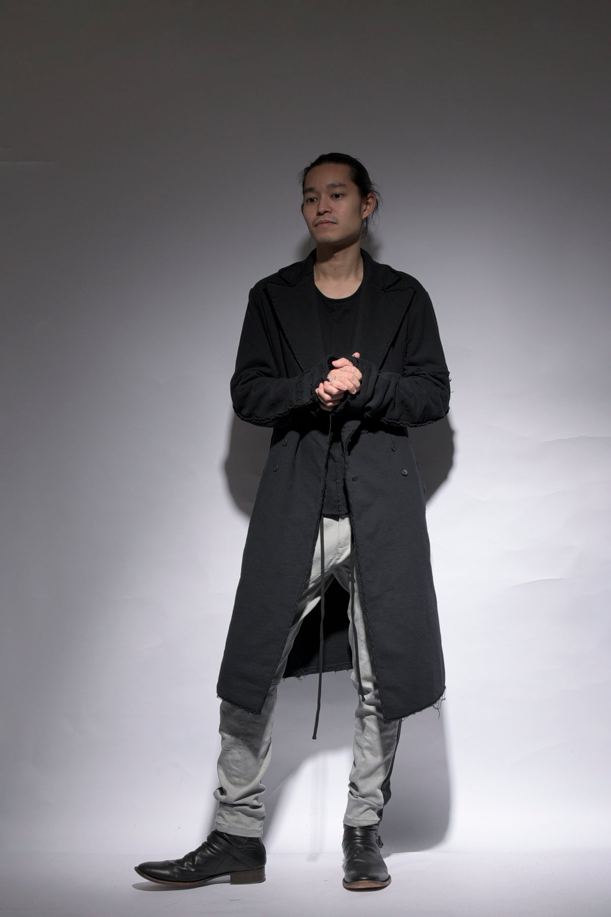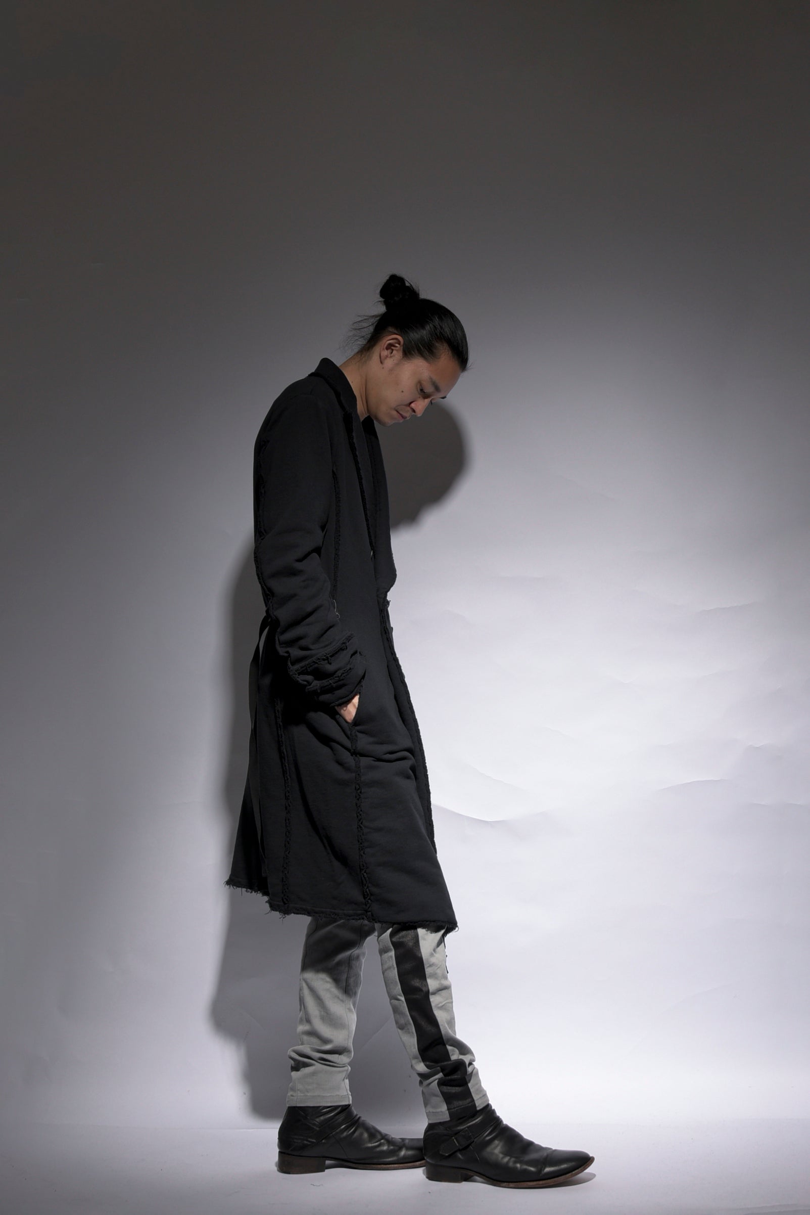反応染料で染色をした後、脱色加工をすることにより色落ち、色ムラ感、シワ感を出したコットン裏毛のカーディガンジャケットです。気軽に羽織れる羽織ものとして、とても重宝いただけます。断ち切り始末などのディティールにより製品洗いの風合いも程よく表現されています。A色はブラック単色です。