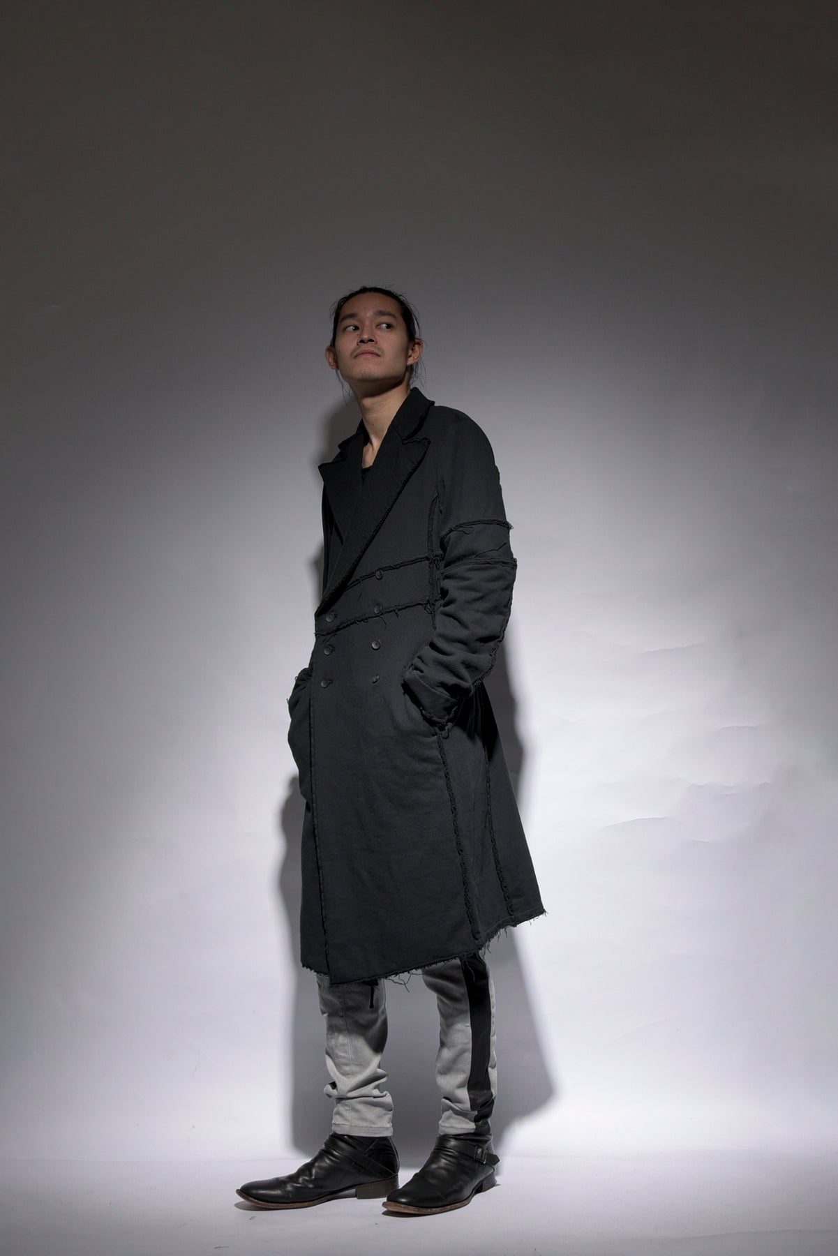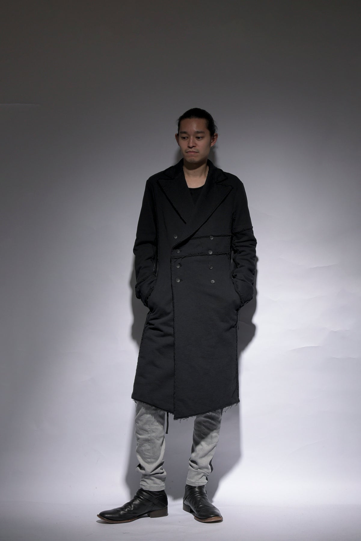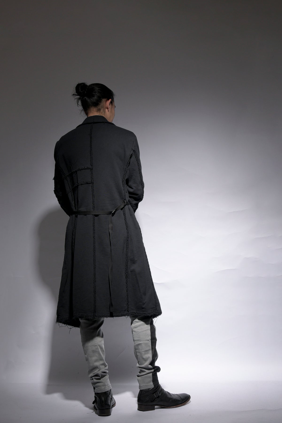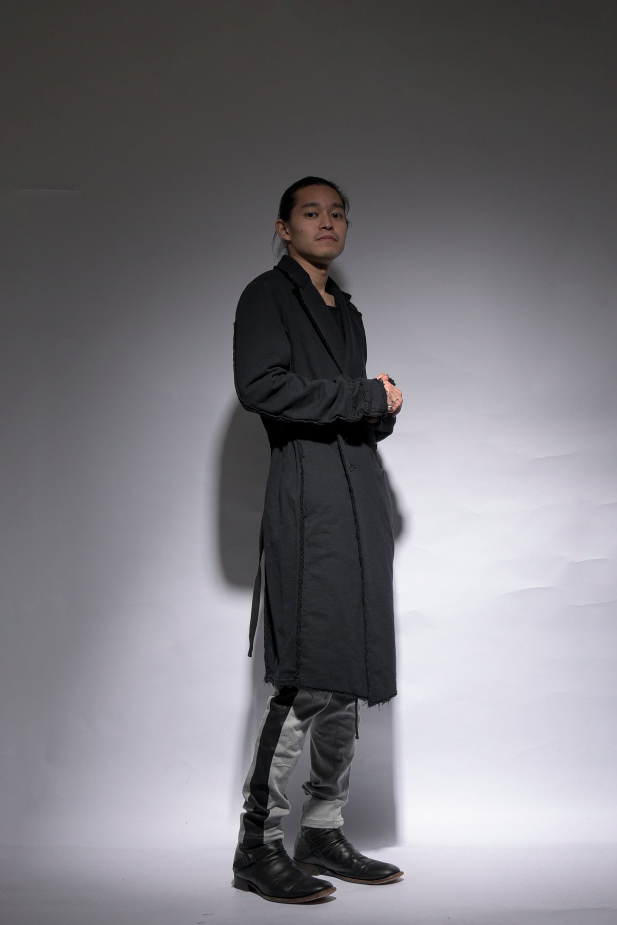 反応染料で染色をした後、脱色加工をすることにより色落ち、色ムラ感、シワ感を出したコットン裏毛のカーディガンジャケットです。気軽に羽織れる羽織ものとして、とても重宝いただけます。断ち切り始末などのディティールにより製品洗いの風合いも程よく表現されています。A色はブラック単色です。