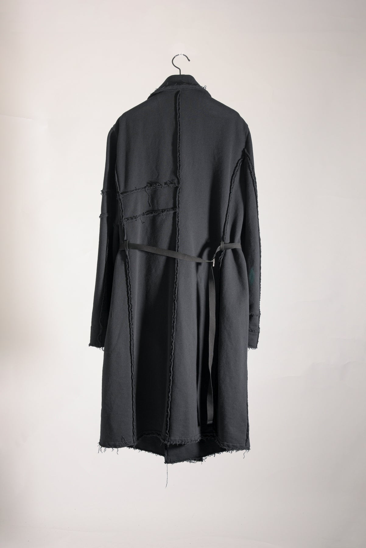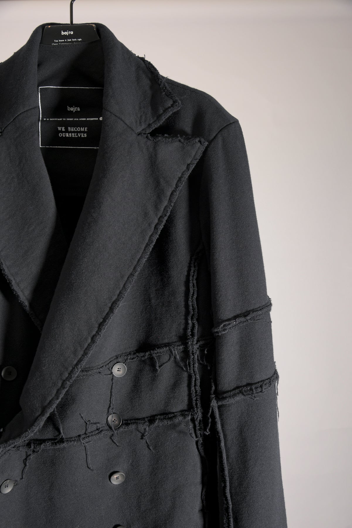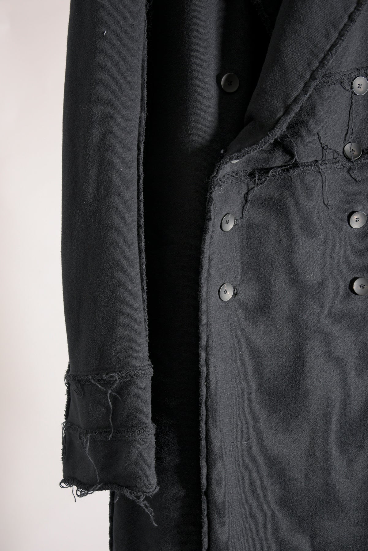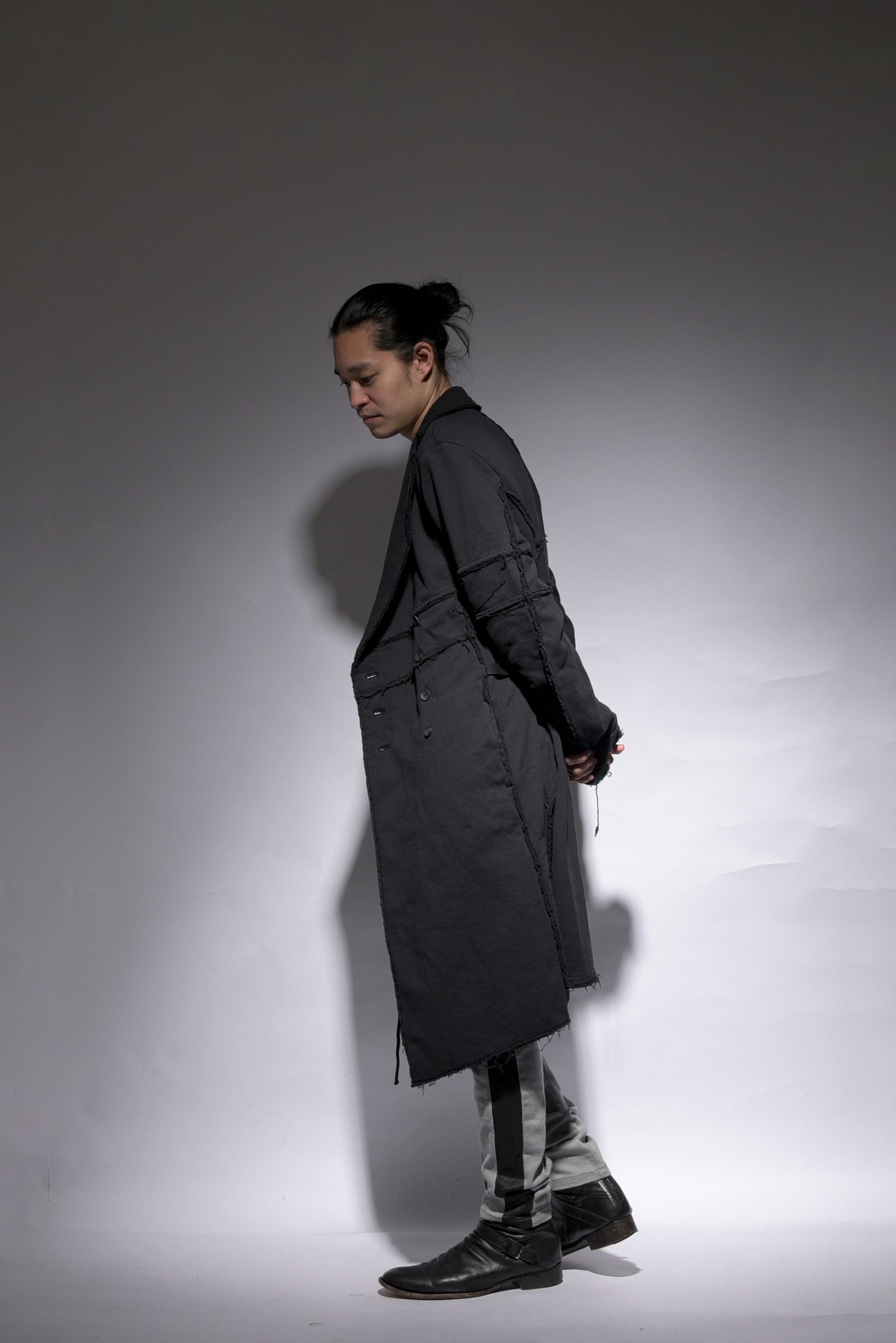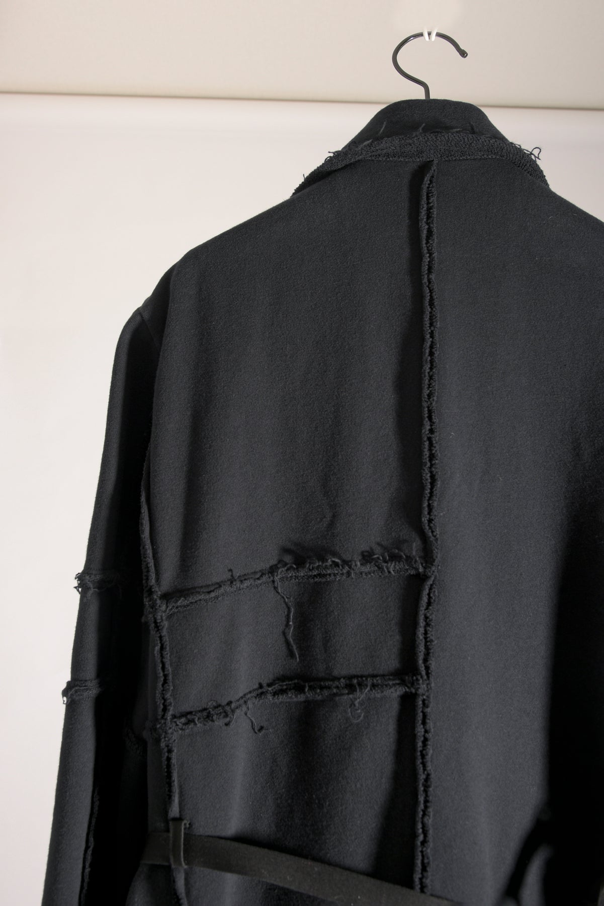 反応染料で染色をした後、脱色加工をすることにより色落ち、色ムラ感、シワ感を出したコットン裏毛のカーディガンジャケットです。気軽に羽織れる羽織ものとして、とても重宝いただけます。断ち切り始末などのディティールにより製品洗いの風合いも程よく表現されています。A色はブラック単色です。
