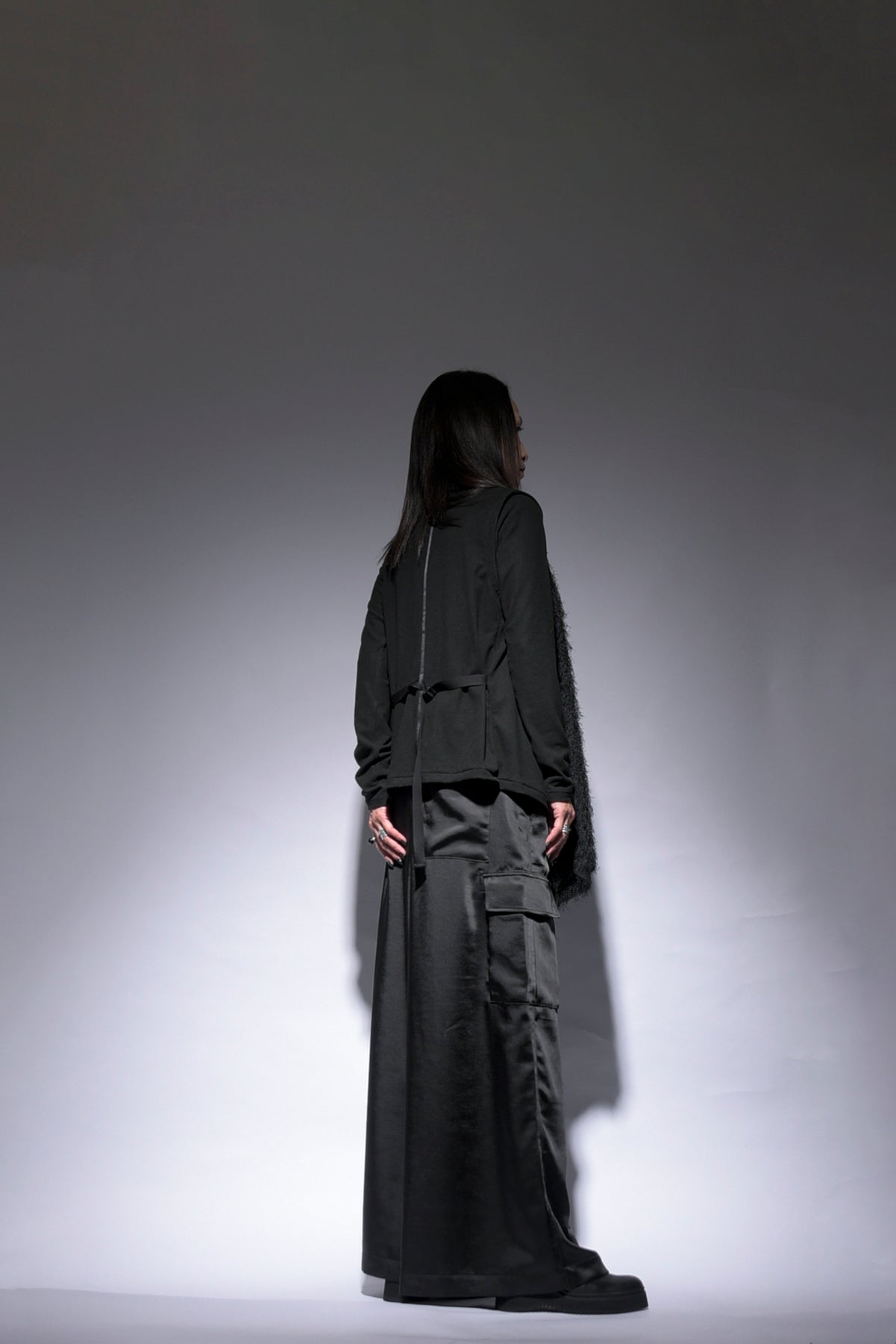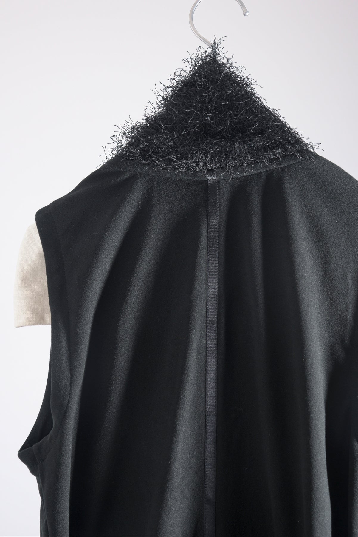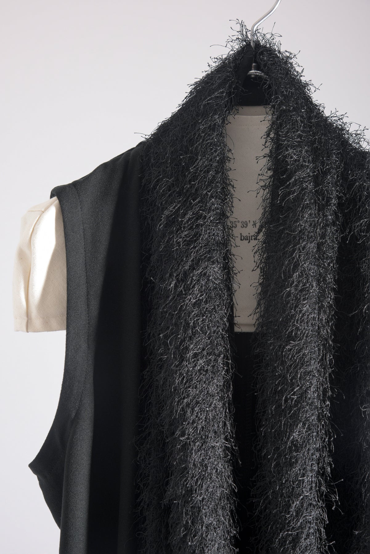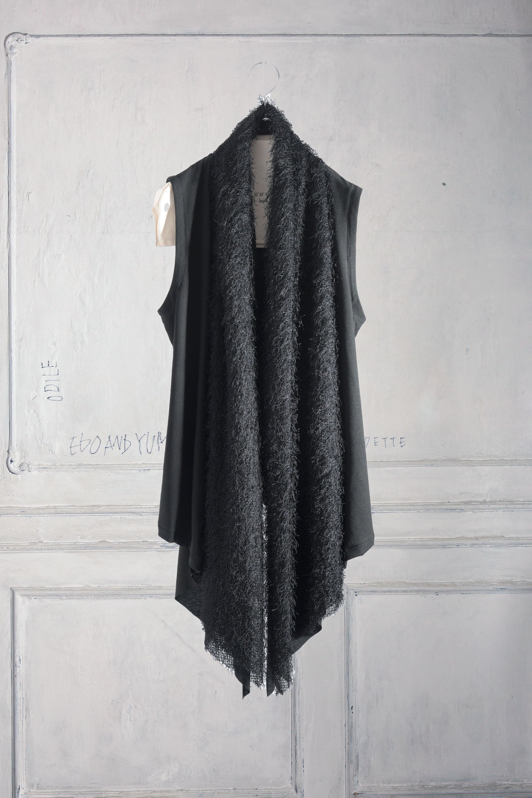 バルキー性のある細番手の糸で構成し、特殊起毛によって膨らみとソフト感を併せ持ったストレッチジャージーにたっぷりのシャギー素材を掛け合わせたジレです。