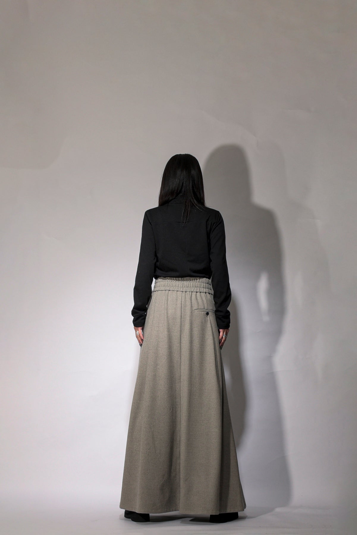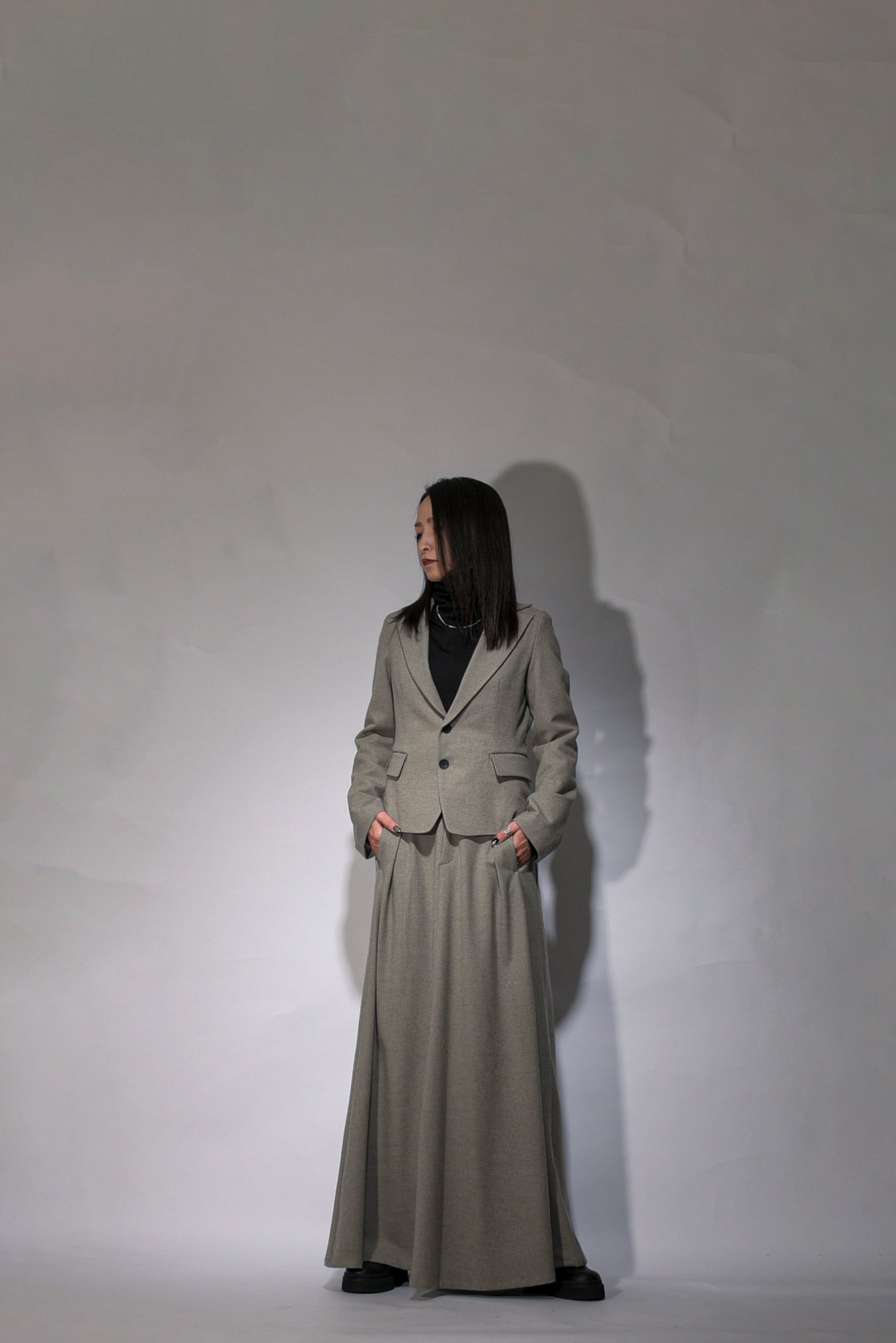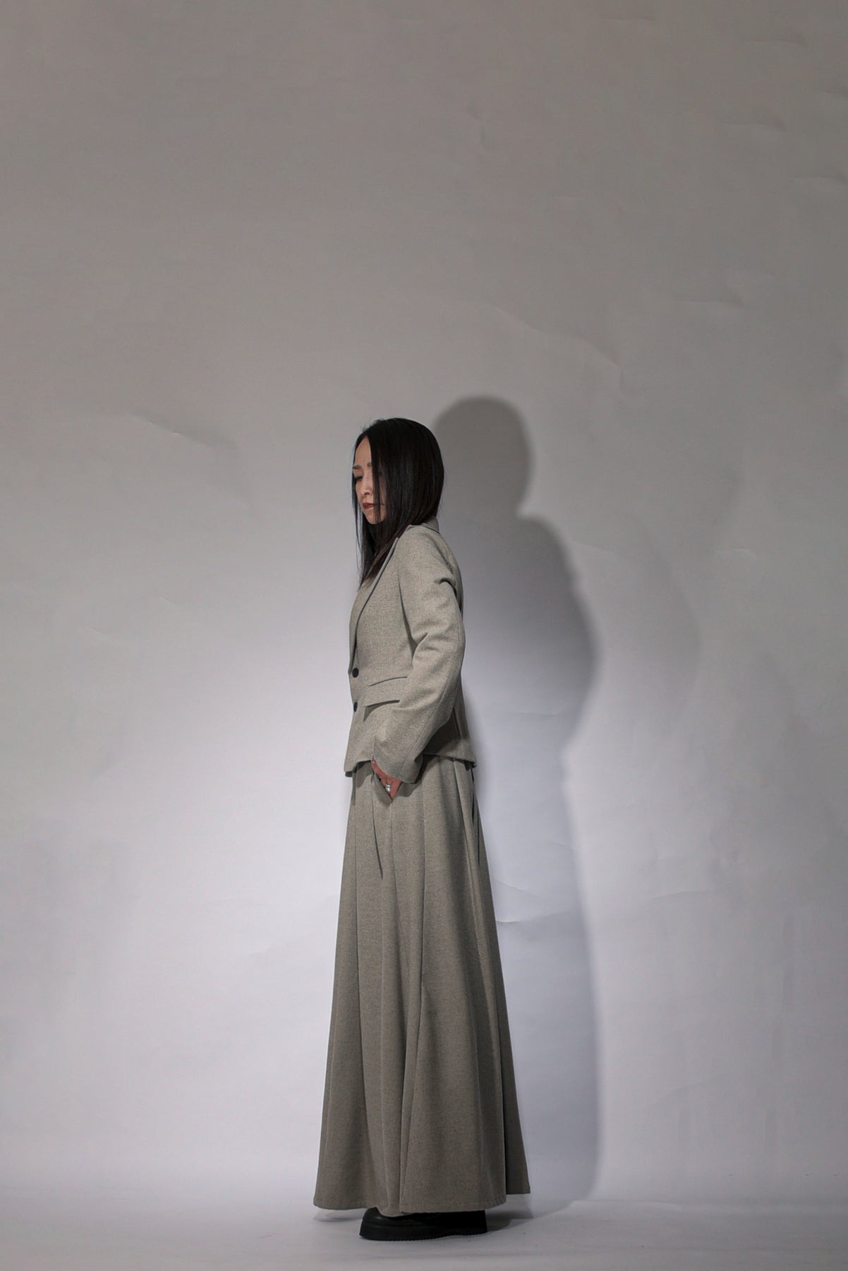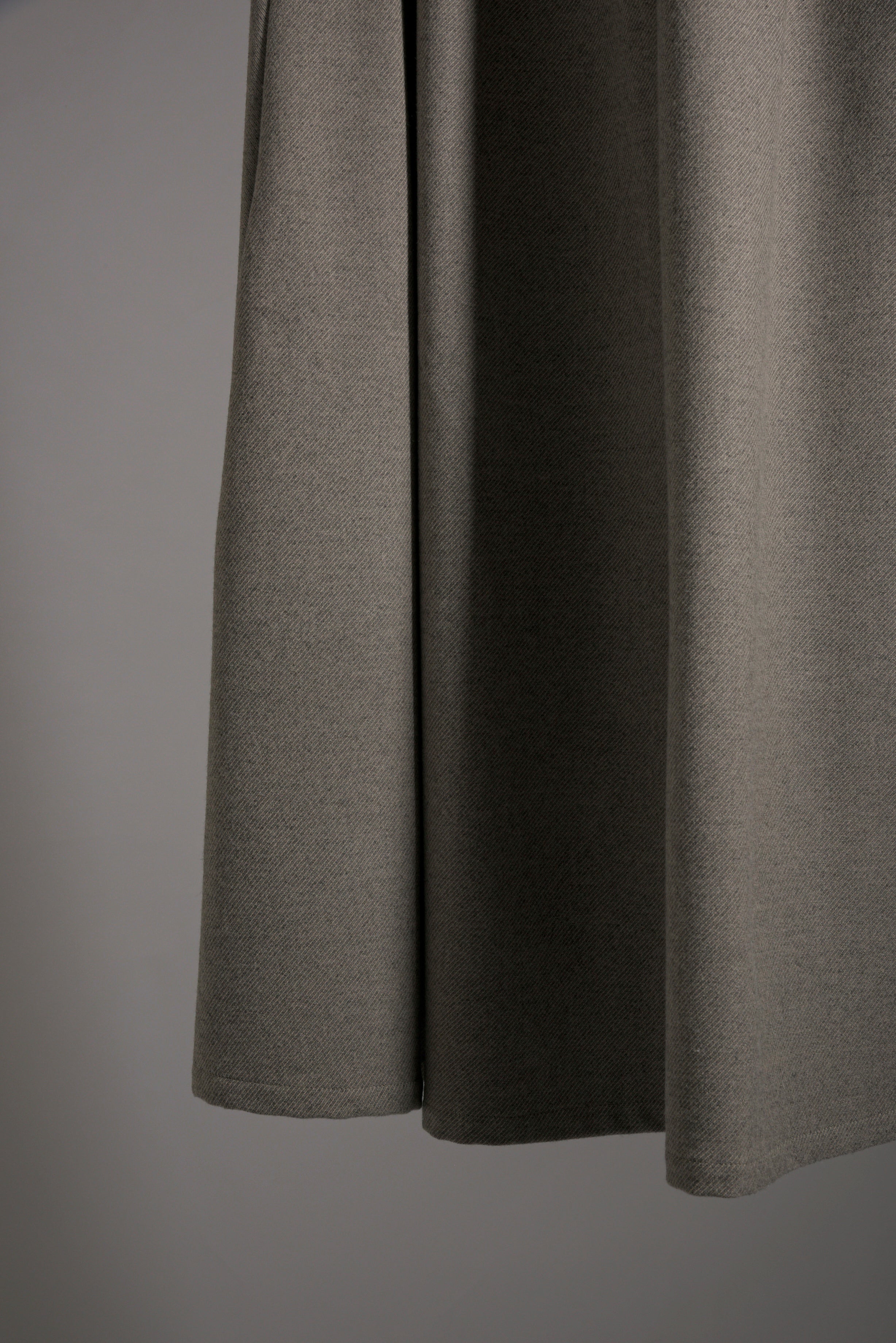 撚糸回数にこだわり抜き、最高の膨らみとキックバックの良さをもたらしました。繊細な起毛を施すことで肌触りがよく、上質な風合いのAラインスカートに仕上がりました。同素材でジャケット、ベスト、ワイドパンツ(ユニセックス展開)などもございますので、セットアップでのご着用もお勧めです。