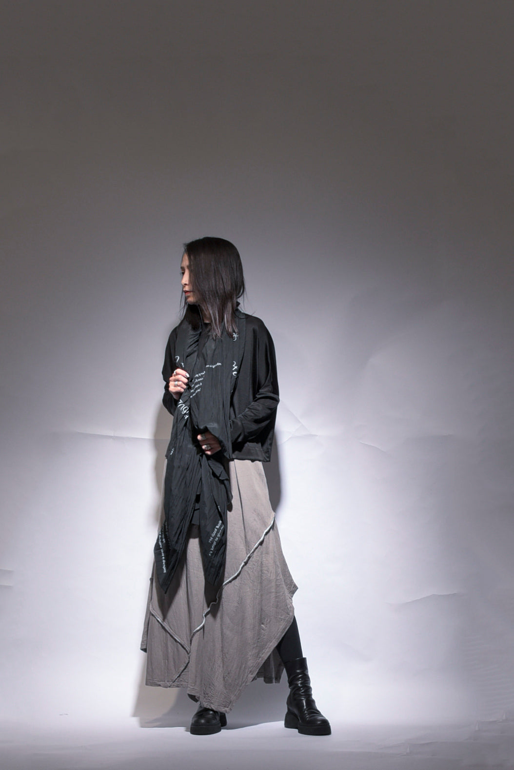 This is an ultra-lightweight A-line voluminous skirt made of split weave de Chine with a slight chin-tu finish. The design is wrapped in tulle on the de Chine body, and the flowing silhouette when moving is very beautiful. This is a piece that you can enjoy for a long time with a variety of coordinations, whether it's a dress or casual outfit.