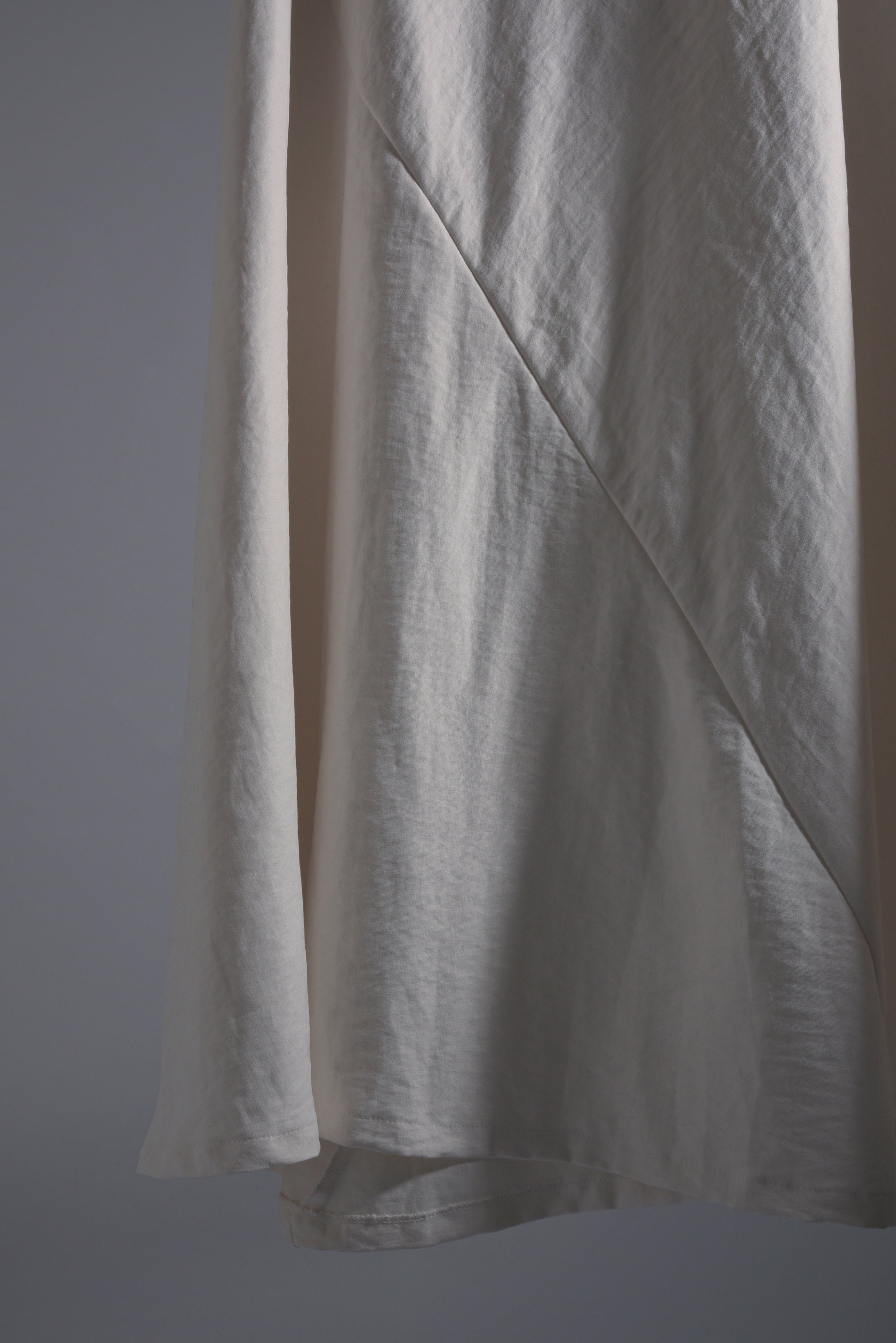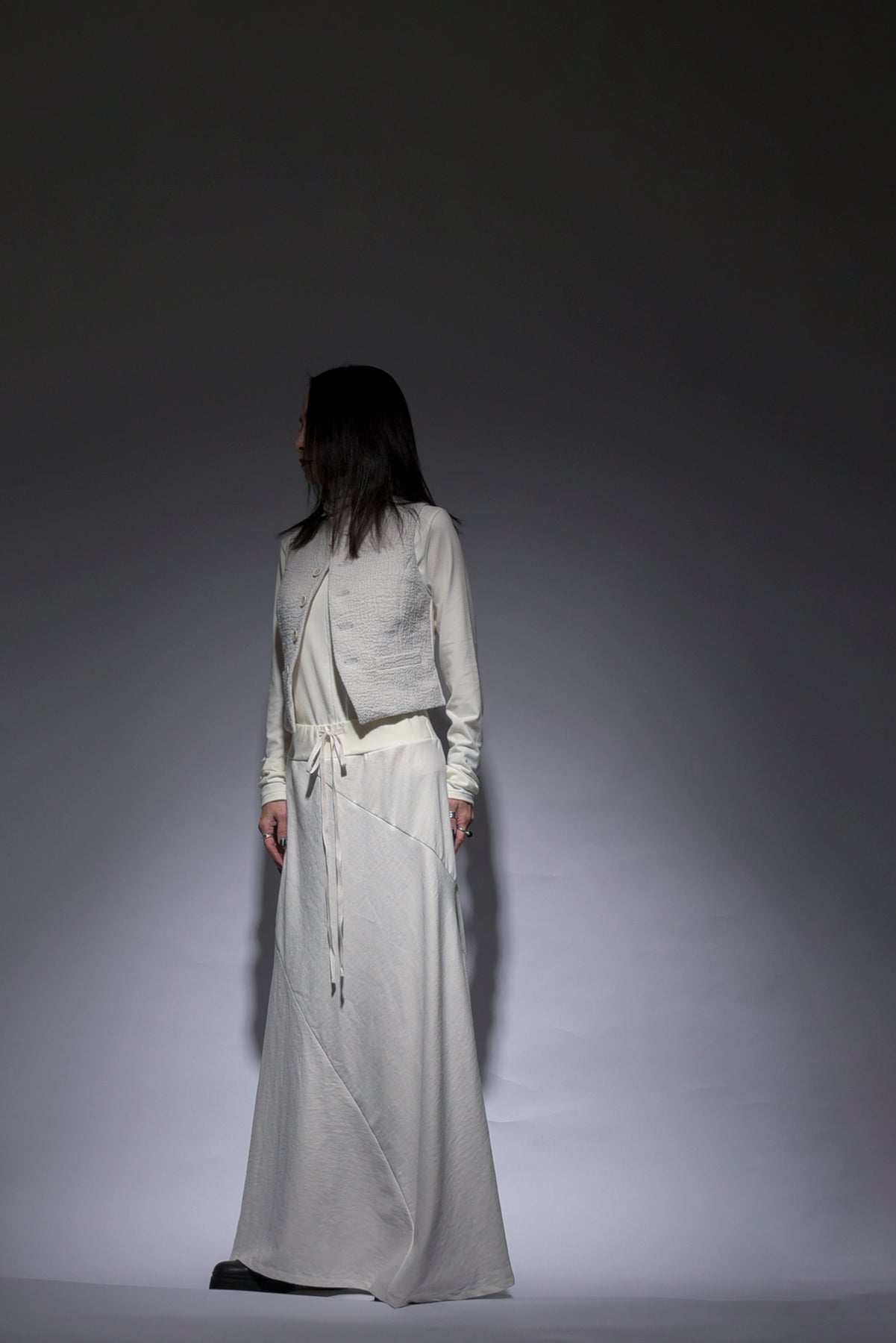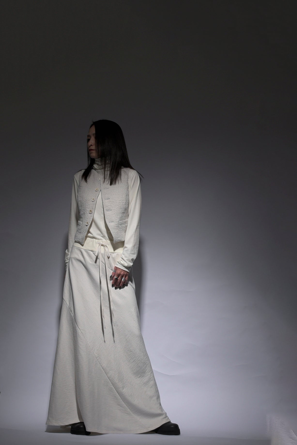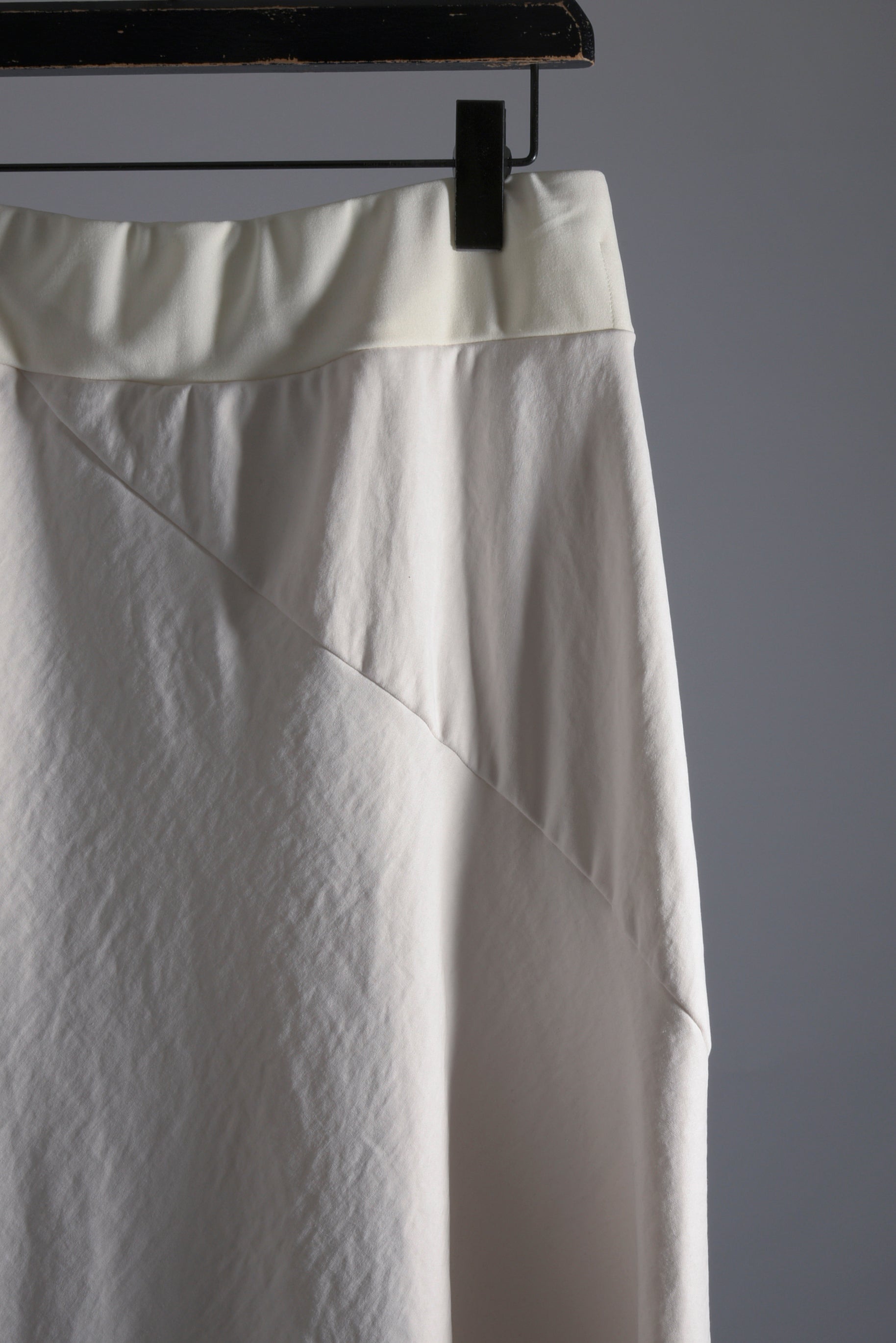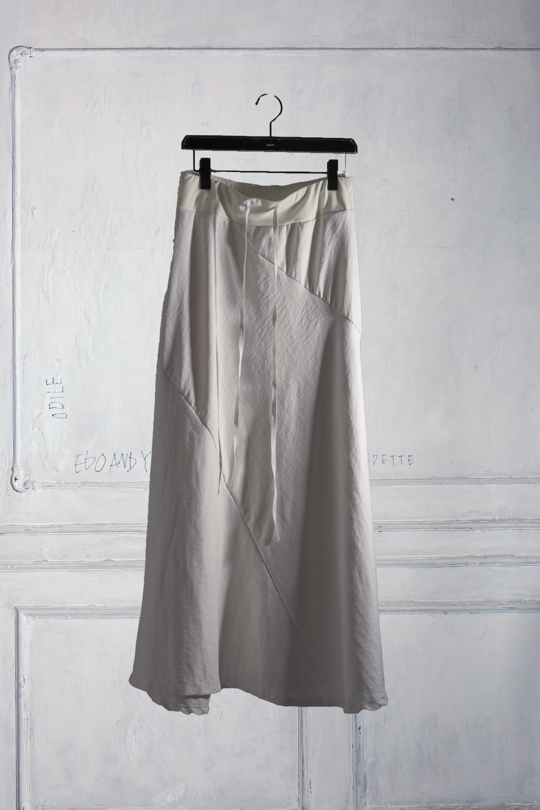 This is an ultra-lightweight A-line voluminous skirt made of split weave de Chine with a slight chin-tu finish. The design is wrapped in tulle on the de Chine body, and the flowing silhouette when moving is very beautiful. This is a piece that you can enjoy for a long time with a variety of coordinations, whether it's a dress or casual outfit.
