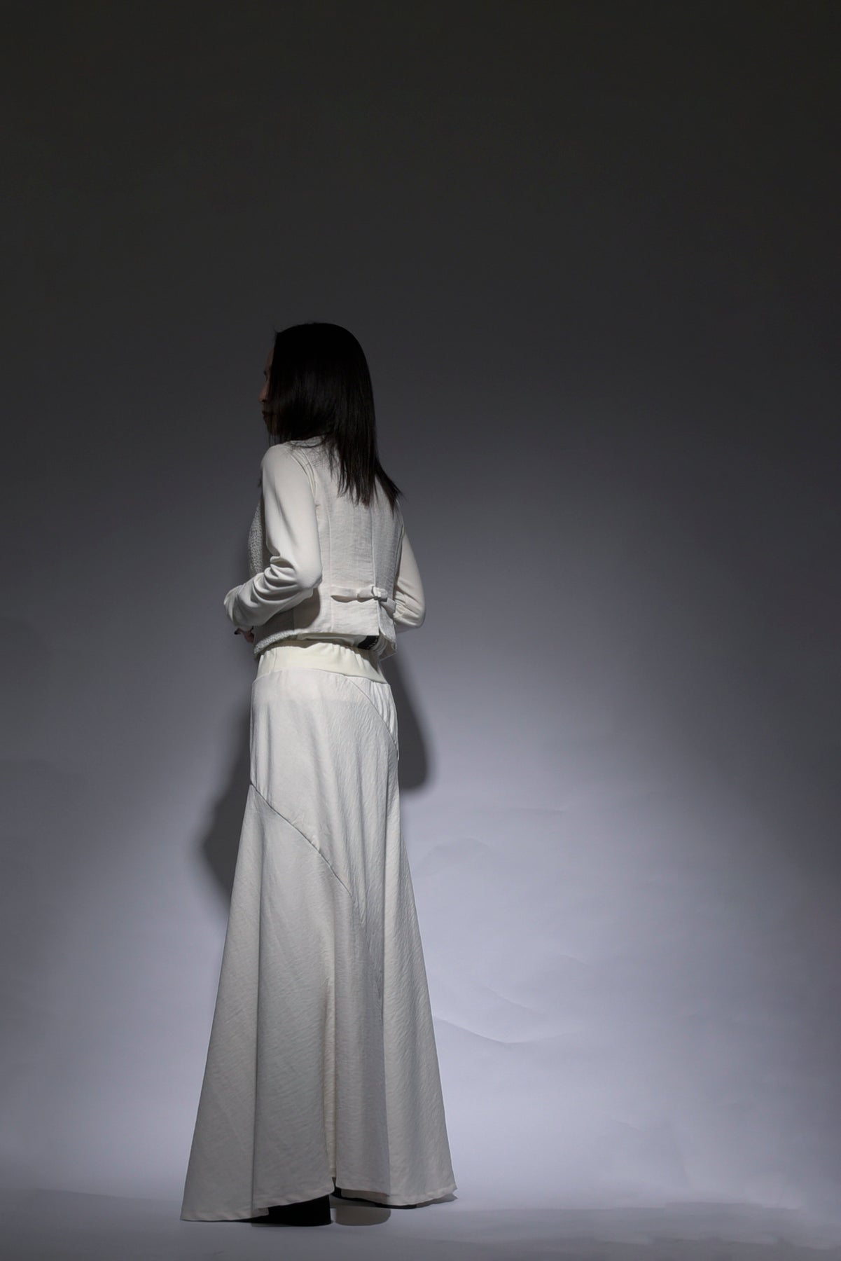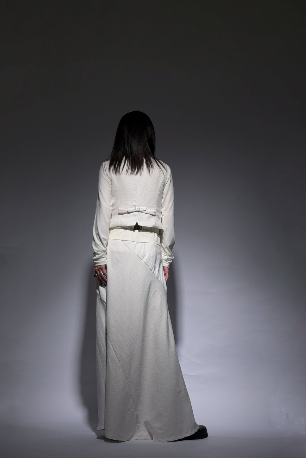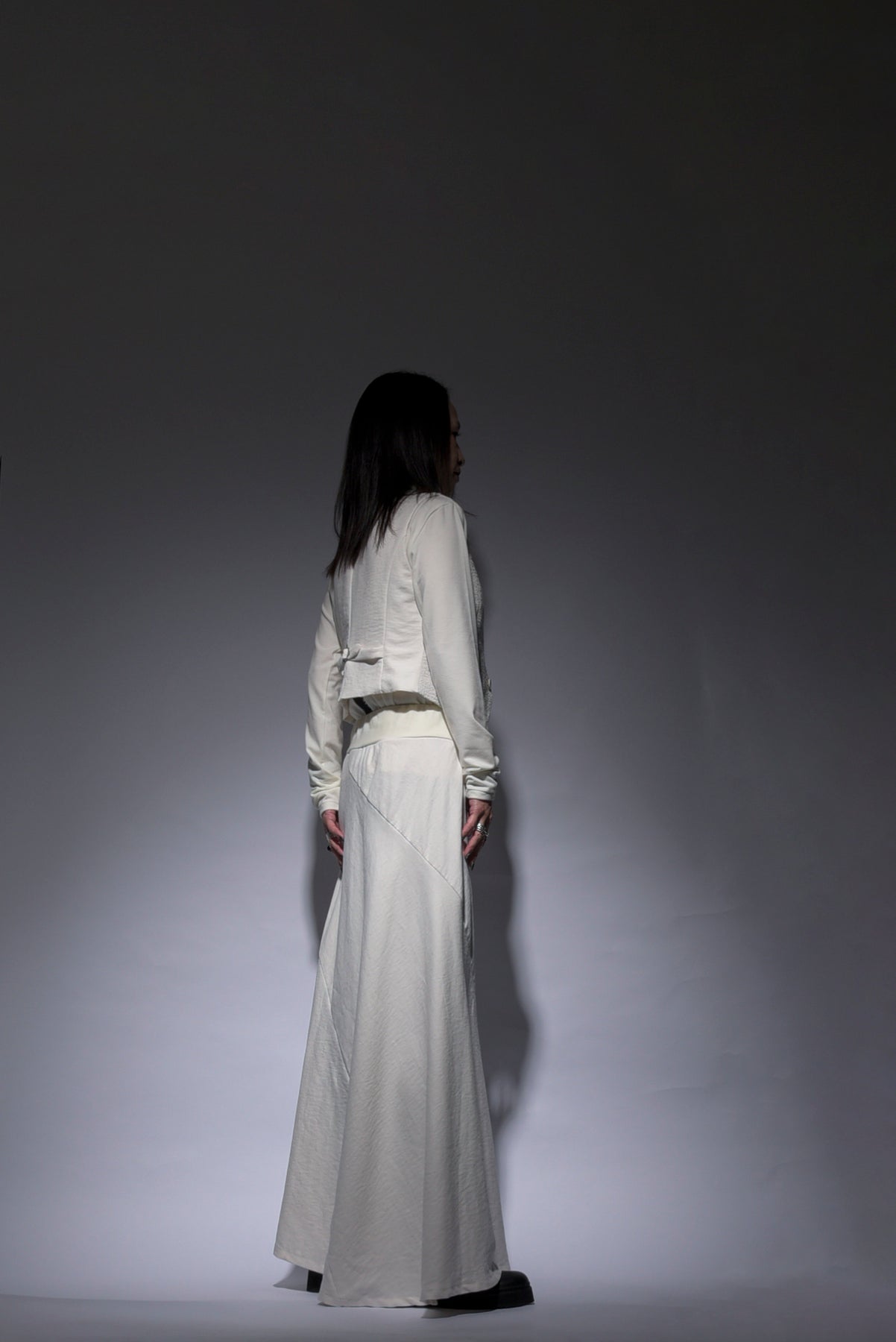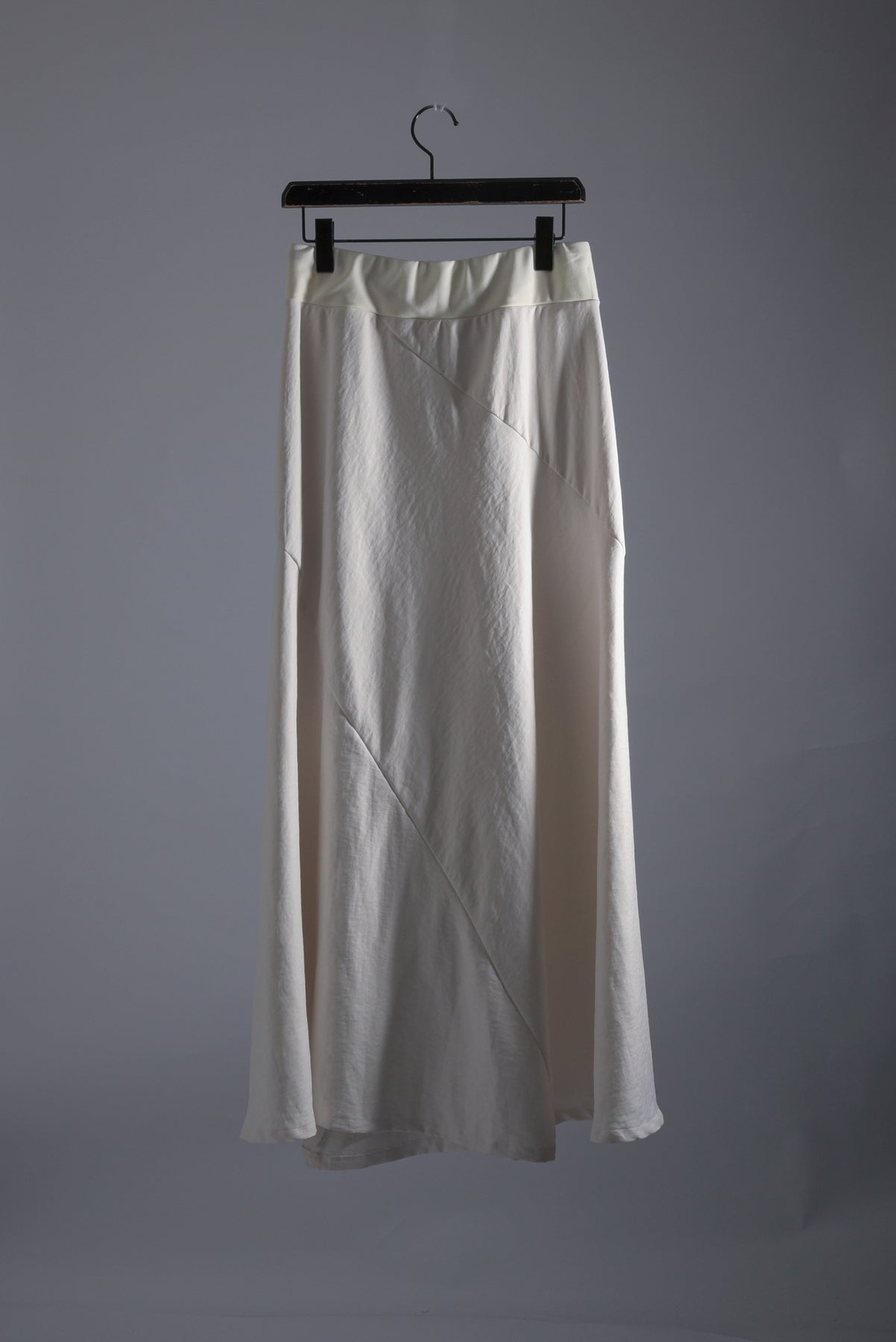 This is an ultra-lightweight A-line voluminous skirt made of split weave de Chine with a slight chin-tu finish. The design is wrapped in tulle on the de Chine body, and the flowing silhouette when moving is very beautiful. This is a piece that you can enjoy for a long time with a variety of coordinations, whether it's a dress or casual outfit.