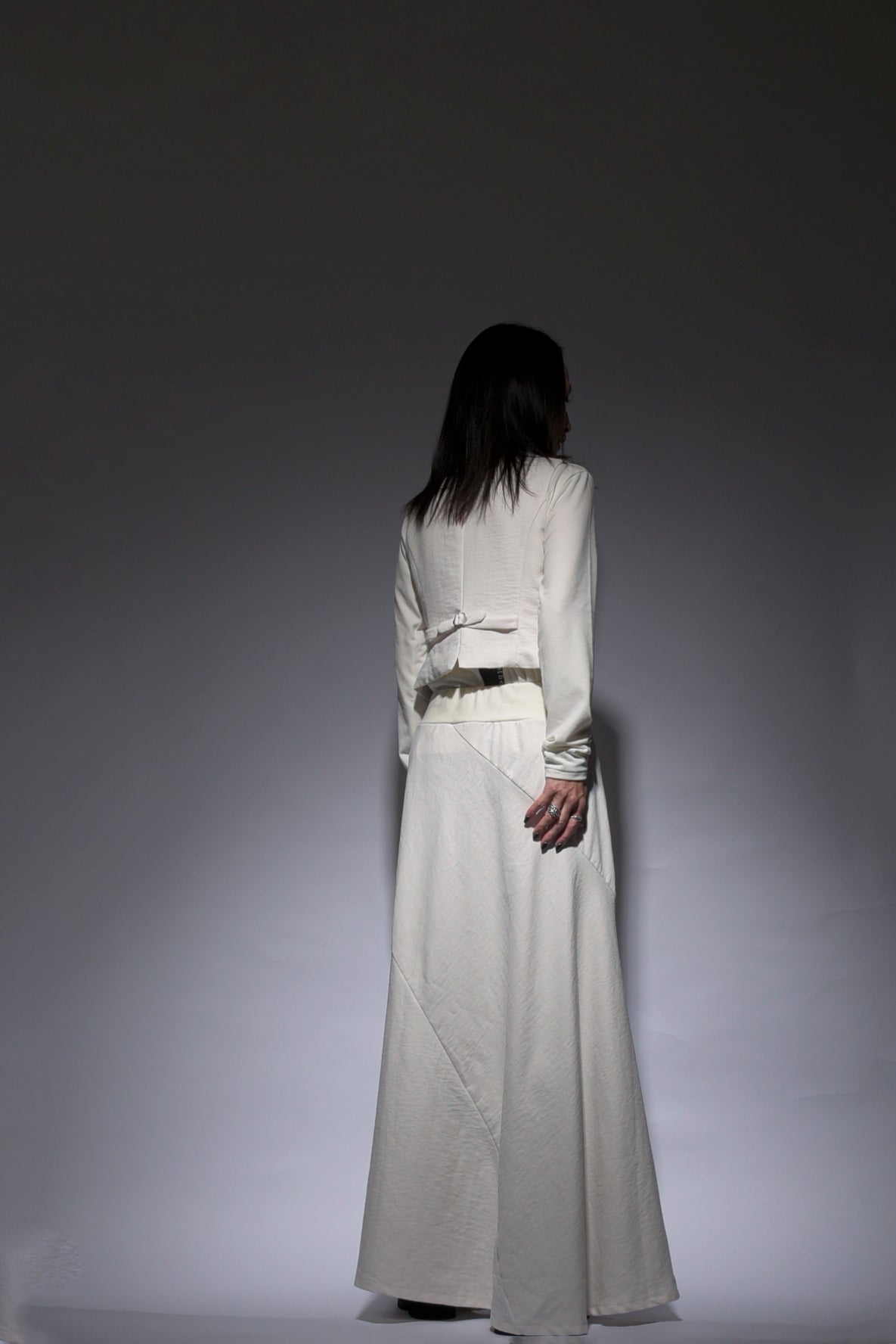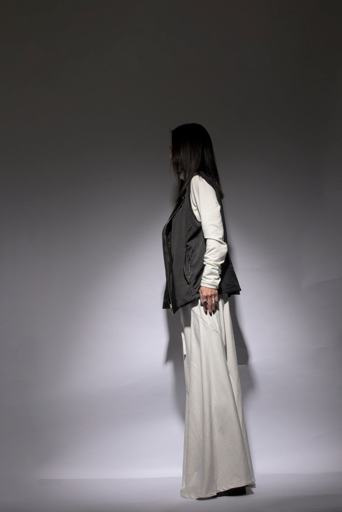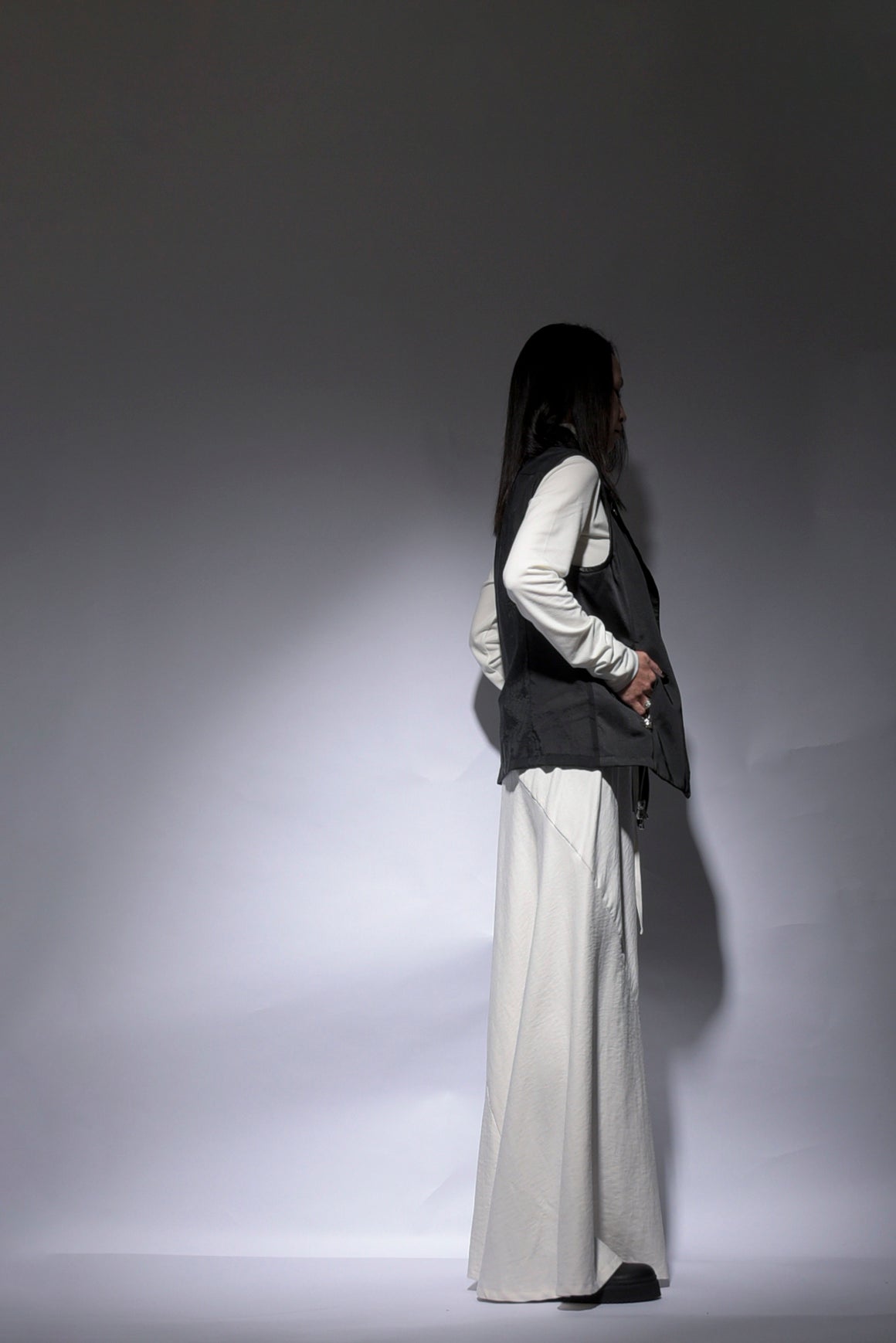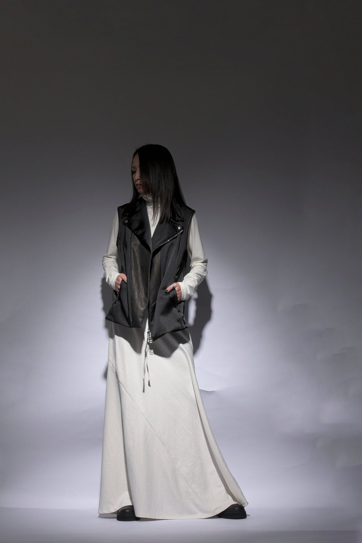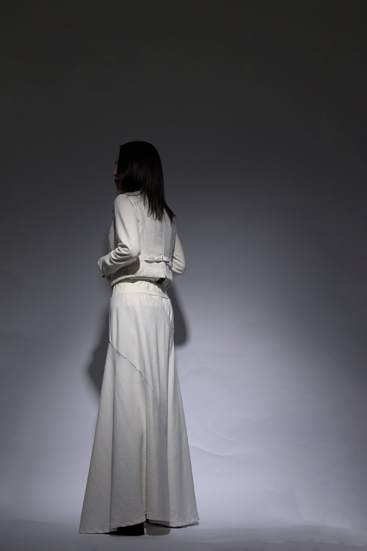 This is an ultra-lightweight A-line voluminous skirt made of split weave de Chine with a slight chin-tu finish. The design is wrapped in tulle on the de Chine body, and the flowing silhouette when moving is very beautiful. This is a piece that you can enjoy for a long time with a variety of coordinations, whether it's a dress or casual outfit.